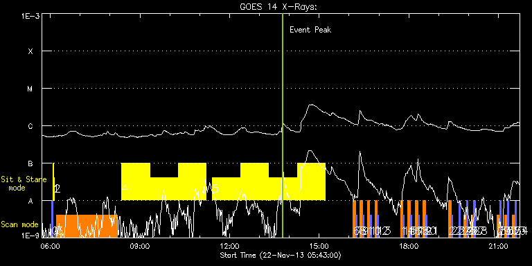 EIS Observation timeline overlay to GOES-Xray curve Code 1" 2" 40" 266" EIS Observations list for this event: STUDY ACRONYM ID DATE OBSERVED DESCRIPTION NOAA# TARGET 0 PRY_slot_contextLITE | 37493 | 2013/11/22 06:02:33 | Daily pointing monitoring | | Active Region TIMELINE ID DATE OBSERVED FITS FILE XCEN (+W/-E) YCEN (+N/-S) DUR ----------------------------------------------------------------------------------------------------------------- 37493 | 2013/11/22 06:02:33.000 | eis_l0_20131122_060233.fits.gz | -15.29 | -0.58 | 2m57s 1 Alignment_266 | 37494 | 2013/11/22 06:05:48 | Daily pointing monitoring | | Quiet Sun TIMELINE ID DATE OBSERVED FITS FILE XCEN (+W/-E) YCEN (+N/-S) DUR ----------------------------------------------------------------------------------------------------------------- 37494 | 2013/11/22 06:05:48.000 | eis_l0_20131122_060548.fits.gz | -132.49 | -0.58 | 1m22s 2 XRT_synop_AIA | 37495 | 2013/11/22 06:07:55 | Daily pointing monitoring | | Quiet Sun TIMELINE ID DATE OBSERVED FITS FILE XCEN (+W/-E) YCEN (+N/-S) DUR ----------------------------------------------------------------------------------------------------------------- 37495 | 2013/11/22 06:07:55.000 | eis_l0_20131122_060755.fits.gz | -132.49 | -0.58 | 10s 3 Atlas_120 | 37524 | 2013/11/22 06:12:20 | Spectral atlas synoptic programme - of | | Quiet Sun TIMELINE ID DATE OBSERVED FITS FILE XCEN (+W/-E) YCEN (+N/-S) DUR ----------------------------------------------------------------------------------------------------------------- 37524 | 2013/11/22 06:12:20.000 | eis_l0_20131122_061220.fits.gz | -10038.40 | -9733.20 | 2h1m39s 4 FLARE266_TEST2 | 37525 | 2013/11/22 08:23:33 | Hunting for large flares from returnin | | Active Region TIMELINE ID DATE OBSERVED FITS FILE XCEN (+W/-E) YCEN (+N/-S) DUR ----------------------------------------------------------------------------------------------------------------- 37525 | 2013/11/22 08:23:33.000 | eis_l0_20131122_082333.fits.gz | -10013.90 | -9962.20 | 56m1s 37525 | 2013/11/22 09:20:26.000 | eis_l0_20131122_092026.fits.gz | -10013.90 | -9962.20 | 56m1s 37525 | 2013/11/22 10:17:19.000 | eis_l0_20131122_101719.fits.gz | -10013.90 | -9962.20 | 56m 5 FLARE266_TEST2 | 37526 | 2013/11/22 11:25:13 | Hunting for large flares from returnin | | Active Region TIMELINE ID DATE OBSERVED FITS FILE XCEN (+W/-E) YCEN (+N/-S) DUR ----------------------------------------------------------------------------------------------------------------- 37526 | 2013/11/22 11:25:13.000 | eis_l0_20131122_112513.fits.gz | -10013.90 | -9962.20 | 56m1s 37526 | 2013/11/22 12:22:05.000 | eis_l0_20131122_122205.fits.gz | -10013.90 | -9962.20 | 56m 37526 | 2013/11/22 13:18:57.000 | eis_l0_20131122_131857.fits.gz | -10013.90 | -9962.20 | 56m 37526 | 2013/11/22 14:15:49.000 | eis_l0_20131122_141549.fits.gz | -10013.90 | -9962.20 | 55m59s 6 SK_DEEP_10x512_SLIT2 | 37502 | 2013/11/22 16:08:20 | Synoptic SOT Irradiance Scan | | Quiet Sun TIMELINE ID DATE OBSERVED FITS FILE XCEN (+W/-E) YCEN (+N/-S) DUR ----------------------------------------------------------------------------------------------------------------- 37502 | 2013/11/22 16:08:20.000 | eis_l0_20131122_160820.fits.gz | -9869.95 | -9963.20 | 5m7s 7 PRY_slot_contextLITE | 37503 | 2013/11/22 16:13:39 | Synoptic SOT Irradiance Scan | | Active Region TIMELINE ID DATE OBSERVED FITS FILE XCEN (+W/-E) YCEN (+N/-S) DUR ----------------------------------------------------------------------------------------------------------------- 37503 | 2013/11/22 16:13:39.000 | eis_l0_20131122_161339.fits.gz | -9884.69 | -9963.20 | 2m56s 8 SK_DEEP_10x512_SLIT2 | 37504 | 2013/11/22 16:21:33 | Synoptic SOT Irradiance Scan | | Quiet Sun TIMELINE ID DATE OBSERVED FITS FILE XCEN (+W/-E) YCEN (+N/-S) DUR ----------------------------------------------------------------------------------------------------------------- 37504 | 2013/11/22 16:21:33.000 | eis_l0_20131122_162133.fits.gz | -742.36 | -294.58 | 5m7s 9 PRY_slot_contextLITE | 37505 | 2013/11/22 16:26:52 | Synoptic SOT Irradiance Scan | | Active Region TIMELINE ID DATE OBSERVED FITS FILE XCEN (+W/-E) YCEN (+N/-S) DUR ----------------------------------------------------------------------------------------------------------------- 37505 | 2013/11/22 16:26:52.000 | eis_l0_20131122_162652.fits.gz | -757.18 | -294.50 | 2m57s 10 SK_DEEP_10x512_SLIT2 | 37506 | 2013/11/22 16:36:33 | Synoptic SOT Irradiance Scan | | Quiet Sun TIMELINE ID DATE OBSERVED FITS FILE XCEN (+W/-E) YCEN (+N/-S) DUR ----------------------------------------------------------------------------------------------------------------- 37506 | 2013/11/22 16:36:33.000 | eis_l0_20131122_163633.fits.gz | -556.52 | -280.46 | 5m8s 11 PRY_slot_contextLITE | 37507 | 2013/11/22 16:41:52 | Synoptic SOT Irradiance Scan | 1903 | Active Region TIMELINE ID DATE OBSERVED FITS FILE XCEN (+W/-E) YCEN (+N/-S) DUR ----------------------------------------------------------------------------------------------------------------- 37507 | 2013/11/22 16:41:52.000 | eis_l0_20131122_164152.fits.gz | -574.33 | -301.30 | 2m57s 12 SK_DEEP_10x512_SLIT2 | 37508 | 2013/11/22 16:51:33 | Synoptic SOT Irradiance Scan | 1903 | Quiet Sun TIMELINE ID DATE OBSERVED FITS FILE XCEN (+W/-E) YCEN (+N/-S) DUR ----------------------------------------------------------------------------------------------------------------- 37508 | 2013/11/22 16:51:33.000 | eis_l0_20131122_165133.fits.gz | -372.34 | -304.39 | 5m8s 13 PRY_slot_contextLITE | 37509 | 2013/11/22 16:56:53 | Synoptic SOT Irradiance Scan | 1903 | Active Region TIMELINE ID DATE OBSERVED FITS FILE XCEN (+W/-E) YCEN (+N/-S) DUR ----------------------------------------------------------------------------------------------------------------- 37509 | 2013/11/22 16:56:53.000 | eis_l0_20131122_165653.fits.gz | -387.16 | -304.32 | 2m56s 14 SK_DEEP_10x512_SLIT2 | 37510 | 2013/11/22 17:43:03 | Synoptic SOT Irradiance Scan | | Quiet Sun TIMELINE ID DATE OBSERVED FITS FI