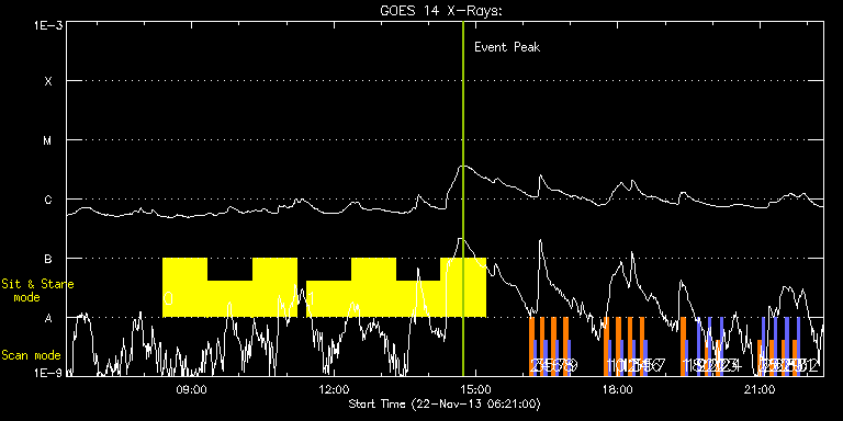 EIS Observation timeline overlay to GOES-Xray curve Code 1" 2" 40" 266" EIS Observations list for this event: STUDY ACRONYM ID DATE OBSERVED DESCRIPTION NOAA# TARGET 0 FLARE266_TEST2 | 37525 | 2013/11/22 08:23:33 | Hunting for large flares from returnin | | Active Region TIMELINE ID DATE OBSERVED FITS FILE XCEN (+W/-E) YCEN (+N/-S) DUR ----------------------------------------------------------------------------------------------------------------- 37525 | 2013/11/22 08:23:33.000 | eis_l0_20131122_082333.fits.gz | -10013.90 | -9962.20 | 56m1s 37525 | 2013/11/22 09:20:26.000 | eis_l0_20131122_092026.fits.gz | -10013.90 | -9962.20 | 56m1s 37525 | 2013/11/22 10:17:19.000 | eis_l0_20131122_101719.fits.gz | -10013.90 | -9962.20 | 56m 1 FLARE266_TEST2 | 37526 | 2013/11/22 11:25:13 | Hunting for large flares from returnin | | Active Region TIMELINE ID DATE OBSERVED FITS FILE XCEN (+W/-E) YCEN (+N/-S) DUR ----------------------------------------------------------------------------------------------------------------- 37526 | 2013/11/22 11:25:13.000 | eis_l0_20131122_112513.fits.gz | -10013.90 | -9962.20 | 56m1s 37526 | 2013/11/22 12:22:05.000 | eis_l0_20131122_122205.fits.gz | -10013.90 | -9962.20 | 56m 37526 | 2013/11/22 13:18:57.000 | eis_l0_20131122_131857.fits.gz | -10013.90 | -9962.20 | 56m 37526 | 2013/11/22 14:15:49.000 | eis_l0_20131122_141549.fits.gz | -10013.90 | -9962.20 | 55m59s 2 SK_DEEP_10x512_SLIT2 | 37502 | 2013/11/22 16:08:20 | Synoptic SOT Irradiance Scan | | Quiet Sun TIMELINE ID DATE OBSERVED FITS FILE XCEN (+W/-E) YCEN (+N/-S) DUR ----------------------------------------------------------------------------------------------------------------- 37502 | 2013/11/22 16:08:20.000 | eis_l0_20131122_160820.fits.gz | -9869.95 | -9963.20 | 5m7s 3 PRY_slot_contextLITE | 37503 | 2013/11/22 16:13:39 | Synoptic SOT Irradiance Scan | | Active Region TIMELINE ID DATE OBSERVED FITS FILE XCEN (+W/-E) YCEN (+N/-S) DUR ----------------------------------------------------------------------------------------------------------------- 37503 | 2013/11/22 16:13:39.000 | eis_l0_20131122_161339.fits.gz | -9884.69 | -9963.20 | 2m56s 4 SK_DEEP_10x512_SLIT2 | 37504 | 2013/11/22 16:21:33 | Synoptic SOT Irradiance Scan | | Quiet Sun TIMELINE ID DATE OBSERVED FITS FILE XCEN (+W/-E) YCEN (+N/-S) DUR ----------------------------------------------------------------------------------------------------------------- 37504 | 2013/11/22 16:21:33.000 | eis_l0_20131122_162133.fits.gz | -742.36 | -294.58 | 5m7s 5 PRY_slot_contextLITE | 37505 | 2013/11/22 16:26:52 | Synoptic SOT Irradiance Scan | | Active Region TIMELINE ID DATE OBSERVED FITS FILE XCEN (+W/-E) YCEN (+N/-S) DUR ----------------------------------------------------------------------------------------------------------------- 37505 | 2013/11/22 16:26:52.000 | eis_l0_20131122_162652.fits.gz | -757.18 | -294.50 | 2m57s 6 SK_DEEP_10x512_SLIT2 | 37506 | 2013/11/22 16:36:33 | Synoptic SOT Irradiance Scan | | Quiet Sun TIMELINE ID DATE OBSERVED FITS FILE XCEN (+W/-E) YCEN (+N/-S) DUR ----------------------------------------------------------------------------------------------------------------- 37506 | 2013/11/22 16:36:33.000 | eis_l0_20131122_163633.fits.gz | -556.52 | -280.46 | 5m8s 7 PRY_slot_contextLITE | 37507 | 2013/11/22 16:41:52 | Synoptic SOT Irradiance Scan | 1903 | Active Region TIMELINE ID DATE OBSERVED FITS FILE XCEN (+W/-E) YCEN (+N/-S) DUR ----------------------------------------------------------------------------------------------------------------- 37507 | 2013/11/22 16:41:52.000 | eis_l0_20131122_164152.fits.gz | -574.33 | -301.30 | 2m57s 8 SK_DEEP_10x512_SLIT2 | 37508 | 2013/11/22 16:51:33 | Synoptic SOT Irradiance Scan | 1903 | Quiet Sun TIMELINE ID DATE OBSERVED FITS FILE XCEN (+W/-E) YCEN (+N/-S) DUR ----------------------------------------------------------------------------------------------------------------- 37508 | 2013/11/22 16:51:33.000 | eis_l0_20131122_165133.fits.gz | -372.34 | -304.39 | 5m8s 9 PRY_slot_contextLITE | 37509 | 2013/11/22 16:56:53 | Synoptic SOT Irradiance Scan | 1903 | Active Region TIMELINE ID DATE OBSERVED FITS FILE XCEN (+W/-E) YCEN (+N/-S) DUR ----------------------------------------------------------------------------------------------------------------- 37509 | 2013/11/22 16:56:53.000 | eis_l0_20131122_165653.fits.gz | -387.16 | -304.32 | 2m56s 10 SK_DEEP_10x512_SLIT2 | 37510 | 2013/11/22 17:43:03 | Synoptic SOT Irradiance Scan | | Quiet Sun TIMELINE ID DATE OBSERVED FITS FILE XCEN (+W/-E) YCEN (+N/-S) DUR ----------------------------------------------------------------------------------------------------------------- 37510 | 2013/11/22 17:43:03.000 | eis_l0_20131122_174303.fits.gz | -181.54 | -307.56 | 5m8s 11 PRY_slot_contextLITE | 37511 | 2013/11/22 17:48:22 | Synoptic SOT Irradiance Scan | 1903 | Active Region TIMELINE ID DATE OBSERVED FITS FILE XCEN (+W/-E) YCEN (+N/-S) DUR ----------------------------------------------------------------------------------------------------------------- 37511 | 2013/11/22 17:48:22.000 | eis_l0_20131122_174822.fits.gz | -196.36 | -307.40 | 2m57s 12 SK_DEEP_10x512_SLIT2 | 37512 | 2013/11/22 17:58:03 | Synoptic SOT Irradiance Scan | | Quiet Sun TIMELINE ID DATE OBSERVED FITS FILE XCEN (+W/-E) YCEN (+N/-S) DUR ----------------------------------------------------------------------------------------------------------------- 37512 | 2013/11/22 17:58:03.000 | eis_l0_20131122_175803.fits.gz | 13.59 | -307.48 | 5m8s 13 PRY_slot_contextLITE | 37513 | 2013/11/22 18:03:22 | Synoptic SOT Irradiance Scan | | Active Region TIMELINE ID DATE OBSERVED FITS FILE XCEN (+W/-E) YCEN (+N/-S) DUR ----------------------------------------------------------------------------------------------------------------- 37513 | 2013/11/22 18:03:22.000 | eis_l0_20131122_180322.fits.gz | -1.31 | -307.56 | 2m57s 14 SK_DEEP_10x512_SLIT2 | 37514 | 2013/11/22 18:13:03 | Synoptic SOT Irradiance Scan | | Quiet Sun TI