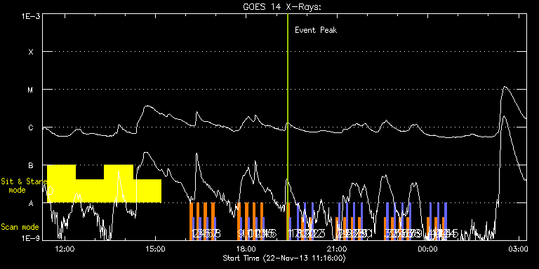 EIS Observation timeline overlay to GOES-Xray curve Code 1" 2" 40" 266" EIS Observations list for this event: STUDY ACRONYM ID DATE OBSERVED DESCRIPTION NOAA# TARGET 0 FLARE266_TEST2 | 37526 | 2013/11/22 11:25:13 | Hunting for large flares from returnin | | Active Region TIMELINE ID DATE OBSERVED FITS FILE XCEN (+W/-E) YCEN (+N/-S) DUR ----------------------------------------------------------------------------------------------------------------- 37526 | 2013/11/22 11:25:13.000 | eis_l0_20131122_112513.fits.gz | -10013.90 | -9962.20 | 56m1s 37526 | 2013/11/22 12:22:05.000 | eis_l0_20131122_122205.fits.gz | -10013.90 | -9962.20 | 56m 37526 | 2013/11/22 13:18:57.000 | eis_l0_20131122_131857.fits.gz | -10013.90 | -9962.20 | 56m 37526 | 2013/11/22 14:15:49.000 | eis_l0_20131122_141549.fits.gz | -10013.90 | -9962.20 | 55m59s 1 SK_DEEP_10x512_SLIT2 | 37502 | 2013/11/22 16:08:20 | Synoptic SOT Irradiance Scan | | Quiet Sun TIMELINE ID DATE OBSERVED FITS FILE XCEN (+W/-E) YCEN (+N/-S) DUR ----------------------------------------------------------------------------------------------------------------- 37502 | 2013/11/22 16:08:20.000 | eis_l0_20131122_160820.fits.gz | -9869.95 | -9963.20 | 5m7s 2 PRY_slot_contextLITE | 37503 | 2013/11/22 16:13:39 | Synoptic SOT Irradiance Scan | | Active Region TIMELINE ID DATE OBSERVED FITS FILE XCEN (+W/-E) YCEN (+N/-S) DUR ----------------------------------------------------------------------------------------------------------------- 37503 | 2013/11/22 16:13:39.000 | eis_l0_20131122_161339.fits.gz | -9884.69 | -9963.20 | 2m56s 3 SK_DEEP_10x512_SLIT2 | 37504 | 2013/11/22 16:21:33 | Synoptic SOT Irradiance Scan | | Quiet Sun TIMELINE ID DATE OBSERVED FITS FILE XCEN (+W/-E) YCEN (+N/-S) DUR ----------------------------------------------------------------------------------------------------------------- 37504 | 2013/11/22 16:21:33.000 | eis_l0_20131122_162133.fits.gz | -742.36 | -294.58 | 5m7s 4 PRY_slot_contextLITE | 37505 | 2013/11/22 16:26:52 | Synoptic SOT Irradiance Scan | | Active Region TIMELINE ID DATE OBSERVED FITS FILE XCEN (+W/-E) YCEN (+N/-S) DUR ----------------------------------------------------------------------------------------------------------------- 37505 | 2013/11/22 16:26:52.000 | eis_l0_20131122_162652.fits.gz | -757.18 | -294.50 | 2m57s 5 SK_DEEP_10x512_SLIT2 | 37506 | 2013/11/22 16:36:33 | Synoptic SOT Irradiance Scan | | Quiet Sun TIMELINE ID DATE OBSERVED FITS FILE XCEN (+W/-E) YCEN (+N/-S) DUR ----------------------------------------------------------------------------------------------------------------- 37506 | 2013/11/22 16:36:33.000 | eis_l0_20131122_163633.fits.gz | -556.52 | -280.46 | 5m8s 6 PRY_slot_contextLITE | 37507 | 2013/11/22 16:41:52 | Synoptic SOT Irradiance Scan | 1903 | Active Region TIMELINE ID DATE OBSERVED FITS FILE XCEN (+W/-E) YCEN (+N/-S) DUR ----------------------------------------------------------------------------------------------------------------- 37507 | 2013/11/22 16:41:52.000 | eis_l0_20131122_164152.fits.gz | -574.33 | -301.30 | 2m57s 7 SK_DEEP_10x512_SLIT2 | 37508 | 2013/11/22 16:51:33 | Synoptic SOT Irradiance Scan | 1903 | Quiet Sun TIMELINE ID DATE OBSERVED FITS FILE XCEN (+W/-E) YCEN (+N/-S) DUR ----------------------------------------------------------------------------------------------------------------- 37508 | 2013/11/22 16:51:33.000 | eis_l0_20131122_165133.fits.gz | -372.34 | -304.39 | 5m8s 8 PRY_slot_contextLITE | 37509 | 2013/11/22 16:56:53 | Synoptic SOT Irradiance Scan | 1903 | Active Region TIMELINE ID DATE OBSERVED FITS FILE XCEN (+W/-E) YCEN (+N/-S) DUR ----------------------------------------------------------------------------------------------------------------- 37509 | 2013/11/22 16:56:53.000 | eis_l0_20131122_165653.fits.gz | -387.16 | -304.32 | 2m56s 9 SK_DEEP_10x512_SLIT2 | 37510 | 2013/11/22 17:43:03 | Synoptic SOT Irradiance Scan | | Quiet Sun TIMELINE ID DATE OBSERVED FITS FILE XCEN (+W/-E) YCEN (+N/-S) DUR ----------------------------------------------------------------------------------------------------------------- 37510 | 2013/11/22 17:43:03.000 | eis_l0_20131122_174303.fits.gz | -181.54 | -307.56 | 5m8s 10 PRY_slot_contextLITE | 37511 | 2013/11/22 17:48:22 | Synoptic SOT Irradiance Scan | 1903 | Active Region TIMELINE ID DATE OBSERVED FITS FILE XCEN (+W/-E) YCEN (+N/-S) DUR ----------------------------------------------------------------------------------------------------------------- 37511 | 2013/11/22 17:48:22.000 | eis_l0_20131122_174822.fits.gz | -196.36 | -307.40 | 2m57s 11 SK_DEEP_10x512_SLIT2 | 37512 | 2013/11/22 17:58:03 | Synoptic SOT Irradiance Scan | | Quiet Sun TIMELINE ID DATE OBSERVED FITS FILE XCEN (+W/-E) YCEN (+N/-S) DUR ----------------------------------------------------------------------------------------------------------------- 37512 | 2013/11/22 17:58:03.000 | eis_l0_20131122_175803.fits.gz | 13.59 | -307.48 | 5m8s 12 PRY_slot_contextLITE | 37513 | 2013/11/22 18:03:22 | Synoptic SOT Irradiance Scan | | Active Region TIMELINE ID DATE OBSERVED FITS FILE XCEN (+W/-E) YCEN (+N/-S) DUR ----------------------------------------------------------------------------------------------------------------- 37513 | 2013/11/22 18:03:22.000 | eis_l0_20131122_180322.fits.gz | -1.31 | -307.56 | 2m57s 13 SK_DEEP_10x512_SLIT2 | 37514 | 2013/11/22 18:13:03 | Synoptic SOT Irradiance Scan | | Quiet Sun TIMELINE ID DATE OBSERVED FITS FILE XCEN (+W/-E) YCEN (+N/-S) DUR ----------------------------------------------------------------------------------------------------------------- 37514 | 2013/11/22 18:13:03.000 | eis_l0_20131122_181303.fits.gz | 150.47 | -307.48 | 5m8s 14 PRY_slot_contextLITE | 37515 | 2013/11/22 18:18:22 | Synoptic SOT Irradiance Scan | | Active Region TIMELINE ID DATE OBSERVED FITS FILE XCEN (+W/-E) YCEN (+N/-S) DUR ----------------------------------------------------------------------------------------------------------------- 37515 | 2013/11/22 18