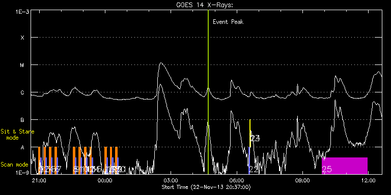 EIS Observation timeline overlay to GOES-Xray curve Code 1" 2" 40" 266" EIS Observations list for this event: STUDY ACRONYM ID DATE OBSERVED DESCRIPTION NOAA# TARGET 0 SK_DEEP_10x512_SLIT2 | 37532 | 2013/11/22 20:57:33 | Synoptic SOT Irradiance Scan | | Quiet Sun TIMELINE ID DATE OBSERVED FITS FILE XCEN (+W/-E) YCEN (+N/-S) DUR ----------------------------------------------------------------------------------------------------------------- 37532 | 2013/11/22 20:57:33.000 | eis_l0_20131122_205733.fits.gz | -780.52 | -42.60 | 5m7s 1 PRY_slot_contextLITE | 37533 | 2013/11/22 21:02:52 | Synoptic SOT Irradiance Scan | | Active Region TIMELINE ID DATE OBSERVED FITS FILE XCEN (+W/-E) YCEN (+N/-S) DUR ----------------------------------------------------------------------------------------------------------------- 37533 | 2013/11/22 21:02:52.000 | eis_l0_20131122_210252.fits.gz | -795.41 | -42.45 | 2m56s 2 SK_DEEP_10x512_SLIT2 | 37534 | 2013/11/22 21:12:33 | Synoptic SOT Irradiance Scan | | Quiet Sun TIMELINE ID DATE OBSERVED FITS FILE XCEN (+W/-E) YCEN (+N/-S) DUR ----------------------------------------------------------------------------------------------------------------- 37534 | 2013/11/22 21:12:33.000 | eis_l0_20131122_211233.fits.gz | -598.45 | -49.47 | 5m8s 3 PRY_slot_contextLITE | 37535 | 2013/11/22 21:17:52 | Synoptic SOT Irradiance Scan | | Active Region TIMELINE ID DATE OBSERVED FITS FILE XCEN (+W/-E) YCEN (+N/-S) DUR ----------------------------------------------------------------------------------------------------------------- 37535 | 2013/11/22 21:17:52.000 | eis_l0_20131122_211752.fits.gz | -613.19 | -49.40 | 2m57s 4 SK_DEEP_10x512_SLIT2 | 37536 | 2013/11/22 21:27:33 | Synoptic SOT Irradiance Scan | | Quiet Sun TIMELINE ID DATE OBSERVED FITS FILE XCEN (+W/-E) YCEN (+N/-S) DUR ----------------------------------------------------------------------------------------------------------------- 37536 | 2013/11/22 21:27:33.000 | eis_l0_20131122_212733.fits.gz | -412.20 | -53.49 | 5m8s 5 PRY_slot_contextLITE | 37537 | 2013/11/22 21:32:52 | Synoptic SOT Irradiance Scan | 1903 | Active Region TIMELINE ID DATE OBSERVED FITS FILE XCEN (+W/-E) YCEN (+N/-S) DUR ----------------------------------------------------------------------------------------------------------------- 37537 | 2013/11/22 21:32:52.000 | eis_l0_20131122_213252.fits.gz | -427.10 | -53.41 | 2m57s 6 SK_DEEP_10x512_SLIT2 | 37538 | 2013/11/22 21:42:33 | Synoptic SOT Irradiance Scan | | Quiet Sun TIMELINE ID DATE OBSERVED FITS FILE XCEN (+W/-E) YCEN (+N/-S) DUR ----------------------------------------------------------------------------------------------------------------- 37538 | 2013/11/22 21:42:33.000 | eis_l0_20131122_214233.fits.gz | -222.56 | -55.58 | 5m7s 7 PRY_slot_contextLITE | 37539 | 2013/11/22 21:47:52 | Synoptic SOT Irradiance Scan | 1903 | Active Region TIMELINE ID DATE OBSERVED FITS FILE XCEN (+W/-E) YCEN (+N/-S) DUR ----------------------------------------------------------------------------------------------------------------- 37539 | 2013/11/22 21:47:52.000 | eis_l0_20131122_214752.fits.gz | -237.38 | -55.50 | 2m57s 8 SK_DEEP_10x512_SLIT2 | 37540 | 2013/11/22 22:33:03 | Synoptic SOT Irradiance Scan | | Quiet Sun TIMELINE ID DATE OBSERVED FITS FILE XCEN (+W/-E) YCEN (+N/-S) DUR ----------------------------------------------------------------------------------------------------------------- 37540 | 2013/11/22 22:33:03.000 | eis_l0_20131122_223303.fits.gz | -28.51 | -56.66 | 5m8s 9 PRY_slot_contextLITE | 37541 | 2013/11/22 22:38:22 | Synoptic SOT Irradiance Scan | | Active Region TIMELINE ID DATE OBSERVED FITS FILE XCEN (+W/-E) YCEN (+N/-S) DUR ----------------------------------------------------------------------------------------------------------------- 37541 | 2013/11/22 22:38:22.000 | eis_l0_20131122_223822.fits.gz | -43.25 | -56.66 | 2m56s 10 SK_DEEP_10x512_SLIT2 | 37542 | 2013/11/22 22:48:03 | Synoptic SOT Irradiance Scan | | Quiet Sun TIMELINE ID DATE OBSERVED FITS FILE XCEN (+W/-E) YCEN (+N/-S) DUR ----------------------------------------------------------------------------------------------------------------- 37542 | 2013/11/22 22:48:03.000 | eis_l0_20131122_224803.fits.gz | -2.56 | -56.43 | 5m8s 11 PRY_slot_contextLITE | 37543 | 2013/11/22 22:53:22 | Synoptic SOT Irradiance Scan | | Active Region TIMELINE ID DATE OBSERVED FITS FILE XCEN (+W/-E) YCEN (+N/-S) DUR ----------------------------------------------------------------------------------------------------------------- 37543 | 2013/11/22 22:53:22.000 | eis_l0_20131122_225322.fits.gz | -17.38 | -56.58 | 2m57s 12 SK_DEEP_10x512_SLIT2 | 37544 | 2013/11/22 23:03:03 | Synoptic SOT Irradiance Scan | | Quiet Sun TIMELINE ID DATE OBSERVED FITS FILE XCEN (+W/-E) YCEN (+N/-S) DUR ----------------------------------------------------------------------------------------------------------------- 37544 | 2013/11/22 23:03:03.000 | eis_l0_20131122_230303.fits.gz | 191.41 | -55.42 | 5m7s 13 PRY_slot_contextLITE | 37545 | 2013/11/22 23:08:22 | Synoptic SOT Irradiance Scan | | Active Region TIMELINE ID DATE OBSERVED FITS FILE XCEN (+W/-E) YCEN (+N/-S) DUR ----------------------------------------------------------------------------------------------------------------- 37545 | 2013/11/22 23:08:22.000 | eis_l0_20131122_230822.fits.gz | 176.67 | -55.58 | 2m56s 14 SK_DEEP_10x512_SLIT2 | 37546 | 2013/11/22 23:18:03 | Synoptic SOT Irradiance Scan | | Quiet Sun TIMELINE ID DATE OBSERVED FITS FILE XCEN (+W/-E) YCEN (+N/-S) DUR ----------------------------------------------------------------------------------------------------------------- 37546 | 2013/11/22 23:18:03.000 | eis_l0_20131122_231803.fits.gz | 381.52 | -53.34 | 5m7s 15 PRY_slot_contextLITE | 37547 | 2013/11/22 23:23:22 | Synoptic SOT Irradiance Scan | | Active Region TIMELINE ID DATE OBSERVED FITS FILE XCEN (+W/-E) YCEN (+N/-S) DUR ----------------------------------------------------------------------------------------
