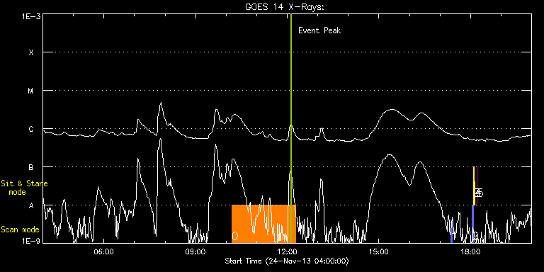 EIS Observation timeline overlay to GOES-Xray curve Code 1" 2" 40" 266" EIS Observations list for this event: STUDY ACRONYM ID DATE OBSERVED DESCRIPTION NOAA# TARGET 0 cam_ar_limb_lite_v3 | 37559 | 2013/11/24 10:11:20 | AR11899 Limb Observation | 1899 | Active Region TIMELINE ID DATE OBSERVED FITS FILE XCEN (+W/-E) YCEN (+N/-S) DUR ----------------------------------------------------------------------------------------------------------------- 37559 | 2013/11/24 10:11:20.000 | eis_l0_20131124_101120.fits.gz | 906.28 | 144.77 | 2h5m17s 1 PRY_slot_context_v3 | 37562 | 2013/11/24 17:20:50 | | 1899 | Active Region TIMELINE ID DATE OBSERVED FITS FILE XCEN (+W/-E) YCEN (+N/-S) DUR ----------------------------------------------------------------------------------------------------------------- 37562 | 2013/11/24 17:20:50.000 | eis_l0_20131124_172050.fits.gz | 922.50 | 64.47 | 2m56s 2 PRY_slot_contextLITE | 37556 | 2013/11/24 18:02:40 | Daily pointing monitoring | 1903 | Active Region TIMELINE ID DATE OBSERVED FITS FILE XCEN (+W/-E) YCEN (+N/-S) DUR ----------------------------------------------------------------------------------------------------------------- 37556 | 2013/11/24 18:02:40.000 | eis_l0_20131124_180240.fits.gz | -15.29 | -0.58 | 2m56s 3 Alignment_266 | 37557 | 2013/11/24 18:05:54 | Daily pointing monitoring | | Quiet Sun TIMELINE ID DATE OBSERVED FITS FILE XCEN (+W/-E) YCEN (+N/-S) DUR ----------------------------------------------------------------------------------------------------------------- 37557 | 2013/11/24 18:05:54.000 | eis_l0_20131124_180554.fits.gz | -132.49 | -0.58 | 1m22s 4 XRT_synop_AIA | 37558 | 2013/11/24 18:08:02 | Daily pointing monitoring | | Quiet Sun TIMELINE ID DATE OBSERVED FITS FILE XCEN (+W/-E) YCEN (+N/-S) DUR ----------------------------------------------------------------------------------------------------------------- 37558 | 2013/11/24 18:08:02.000 | eis_l0_20131124_180802.fits.gz | -132.57 | -0.50 | 10s 5 regcal077 | 37554 | 2013/11/24 18:12:12 | Flatfield, 2 exposures, led 80ms, full | | Engineering TIMELINE ID DATE OBSERVED FITS FILE XCEN (+W/-E) YCEN (+N/-S) DUR ----------------------------------------------------------------------------------------------------------------- 37554 | 2013/11/24 18:12:12.000 | eis_l0_20131124_181212.fits.gz | 952.38 | 14.85 | 3s : Check study information : Download file : View thumbnails For this event, also check for: