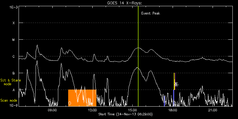 EIS Observation timeline overlay to GOES-Xray curve Code 1" 2" 40" 266" EIS Observations list for this event: STUDY ACRONYM ID DATE OBSERVED DESCRIPTION NOAA# TARGET 0 cam_ar_limb_lite_v3 | 37559 | 2013/11/24 10:11:20 | AR11899 Limb Observation | 1899 | Active Region TIMELINE ID DATE OBSERVED FITS FILE XCEN (+W/-E) YCEN (+N/-S) DUR ----------------------------------------------------------------------------------------------------------------- 37559 | 2013/11/24 10:11:20.000 | eis_l0_20131124_101120.fits.gz | 906.28 | 144.77 | 2h5m17s 1 PRY_slot_context_v3 | 37562 | 2013/11/24 17:20:50 | | 1899 | Active Region TIMELINE ID DATE OBSERVED FITS FILE XCEN (+W/-E) YCEN (+N/-S) DUR ----------------------------------------------------------------------------------------------------------------- 37562 | 2013/11/24 17:20:50.000 | eis_l0_20131124_172050.fits.gz | 922.50 | 64.47 | 2m56s 2 PRY_slot_contextLITE | 37556 | 2013/11/24 18:02:40 | Daily pointing monitoring | 1903 | Active Region TIMELINE ID DATE OBSERVED FITS FILE XCEN (+W/-E) YCEN (+N/-S) DUR ----------------------------------------------------------------------------------------------------------------- 37556 | 2013/11/24 18:02:40.000 | eis_l0_20131124_180240.fits.gz | -15.29 | -0.58 | 2m56s 3 Alignment_266 | 37557 | 2013/11/24 18:05:54 | Daily pointing monitoring | | Quiet Sun TIMELINE ID DATE OBSERVED FITS FILE XCEN (+W/-E) YCEN (+N/-S) DUR ----------------------------------------------------------------------------------------------------------------- 37557 | 2013/11/24 18:05:54.000 | eis_l0_20131124_180554.fits.gz | -132.49 | -0.58 | 1m22s 4 XRT_synop_AIA | 37558 | 2013/11/24 18:08:02 | Daily pointing monitoring | | Quiet Sun TIMELINE ID DATE OBSERVED FITS FILE XCEN (+W/-E) YCEN (+N/-S) DUR ----------------------------------------------------------------------------------------------------------------- 37558 | 2013/11/24 18:08:02.000 | eis_l0_20131124_180802.fits.gz | -132.57 | -0.50 | 10s 5 regcal077 | 37554 | 2013/11/24 18:12:12 | Flatfield, 2 exposures, led 80ms, full | | Engineering TIMELINE ID DATE OBSERVED FITS FILE XCEN (+W/-E) YCEN (+N/-S) DUR ----------------------------------------------------------------------------------------------------------------- 37554 | 2013/11/24 18:12:12.000 | eis_l0_20131124_181212.fits.gz | 952.38 | 14.85 | 3s : Check study information : Download file : View thumbnails For this event, also check for: