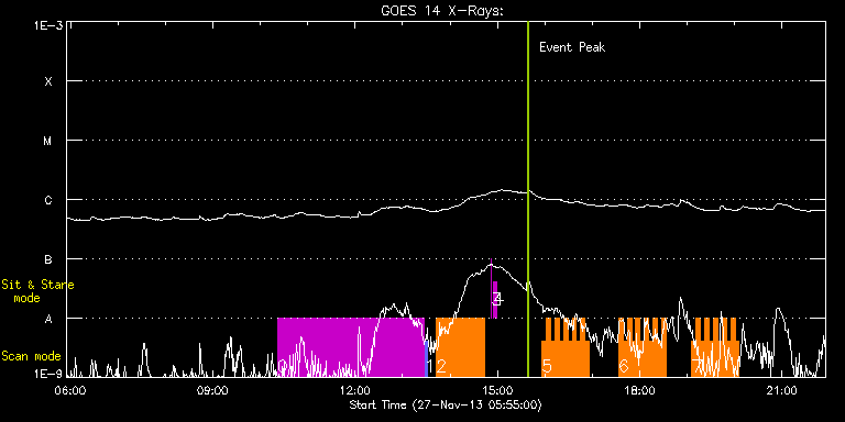EIS Observation timeline overlay to GOES-Xray curve Code 1" 2" 40" 266" EIS Observations list for this event: STUDY ACRONYM ID DATE OBSERVED DESCRIPTION NOAA# TARGET 0 HPW021_VEL_360x512v1 | 37603 | 2013/11/27 10:21:49 | Active Region studies | 1903 | Active Region TIMELINE ID DATE OBSERVED FITS FILE XCEN (+W/-E) YCEN (+N/-S) DUR ----------------------------------------------------------------------------------------------------------------- 37603 | 2013/11/27 10:21:49.000 | eis_l0_20131127_102149.fits.gz | 700.89 | -130.70 | 3h5m44s 1 PRY_slot_context_v3 | 37604 | 2013/11/27 13:27:58 | Active Region studies | 1903 | Active Region TIMELINE ID DATE OBSERVED FITS FILE XCEN (+W/-E) YCEN (+N/-S) DUR ----------------------------------------------------------------------------------------------------------------- 37604 | 2013/11/27 13:27:58.000 | eis_l0_20131127_132758.fits.gz | 708.67 | -231.16 | 2m56s 2 Atlas_60 | 37607 | 2013/11/27 13:42:33 | Active Region studies | | Quiet Sun TIMELINE ID DATE OBSERVED FITS FILE XCEN (+W/-E) YCEN (+N/-S) DUR ----------------------------------------------------------------------------------------------------------------- 37607 | 2013/11/27 13:42:33.000 | eis_l0_20131127_134233.fits.gz | 724.80 | -231.16 | 1h1m40s 3 regcal070 | 37608 | 2013/11/27 14:52:12 | Flat field with overscan pixels (50*8) | | Engineering TIMELINE ID DATE OBSERVED FITS FILE XCEN (+W/-E) YCEN (+N/-S) DUR ----------------------------------------------------------------------------------------------------------------- 37608 | 2013/11/27 14:52:12.000 | eis_l0_20131127_145212.fits.gz | 746.74 | -24.85 | 2s 4 regcal074 | 37609 | 2013/11/27 14:55:11 | Dark exposures including overscan pixe | | Engineering TIMELINE ID DATE OBSERVED FITS FILE XCEN (+W/-E) YCEN (+N/-S) DUR ----------------------------------------------------------------------------------------------------------------- 37609 | 2013/11/27 14:55:11.000 | eis_l0_20131127_145511.fits.gz | 746.97 | -24.78 | 3m22s 5 IUU_SCAN_STEPS_002 | 37617 | 2013/11/27 15:56:10 | Active Region studies | | Active Region TIMELINE ID DATE OBSERVED FITS FILE XCEN (+W/-E) YCEN (+N/-S) DUR ----------------------------------------------------------------------------------------------------------------- 37617 | 2013/11/27 15:56:10.000 | eis_l0_20131127_155610.fits.gz | 736.78 | -230.54 | 5m23s 37617 | 2013/11/27 16:01:37.000 | eis_l0_20131127_160137.fits.gz | 737.32 | -230.47 | 5m23s 37617 | 2013/11/27 16:07:04.000 | eis_l0_20131127_160704.fits.gz | 737.79 | -230.47 | 5m23s 37617 | 2013/11/27 16:12:30.000 | eis_l0_20131127_161230.fits.gz | 738.33 | -230.47 | 5m24s 37617 | 2013/11/27 16:17:57.000 | eis_l0_20131127_161757.fits.gz | 738.87 | -230.47 | 5m24s 37617 | 2013/11/27 16:23:24.000 | eis_l0_20131127_162324.fits.gz | 739.41 | -230.47 | 5m23s 37617 | 2013/11/27 16:28:51.000 | eis_l0_20131127_162851.fits.gz | 739.87 | -230.54 | 5m23s 37617 | 2013/11/27 16:34:18.000 | eis_l0_20131127_163418.fits.gz | 740.49 | -230.39 | 5m23s 37617 | 2013/11/27 16:39:44.000 | eis_l0_20131127_163944.fits.gz | 740.96 | -230.39 | 5m24s 37617 | 2013/11/27 16:45:11.000 | eis_l0_20131127_164511.fits.gz | 741.50 | -230.47 | 5m24s 37617 | 2013/11/27 16:50:38.000 | eis_l0_20131127_165038.fits.gz | 742.04 | -230.39 | 5m24s 6 IUU_SCAN_STEPS_002 | 37618 | 2013/11/27 17:33:10 | Active Region studies | | Active Region TIMELINE ID DATE OBSERVED FITS FILE XCEN (+W/-E) YCEN (+N/-S) DUR ----------------------------------------------------------------------------------------------------------------- 37618 | 2013/11/27 17:33:10.000 | eis_l0_20131127_173310.fits.gz | 746.05 | -230.16 | 5m24s 37618 | 2013/11/27 17:38:37.000 | eis_l0_20131127_173837.fits.gz | 746.52 | -230.23 | 5m24s 37618 | 2013/11/27 17:44:04.000 | eis_l0_20131127_174404.fits.gz | 747.06 | -230.16 | 5m23s 37618 | 2013/11/27 17:49:31.000 | eis_l0_20131127_174931.fits.gz | 747.60 | -230.23 | 5m23s 37618 | 2013/11/27 17:54:57.000 | eis_l0_20131127_175457.fits.gz | 748.06 | -230.23 | 5m24s 37618 | 2013/11/27 18:00:24.000 | eis_l0_20131127_180024.fits.gz | 748.53 | -230.08 | 5m24s 37618 | 2013/11/27 18:05:51.000 | eis_l0_20131127_180551.fits.gz | 749.07 | -230.16 | 5m23s 37618 | 2013/11/27 18:11:18.000 | eis_l0_20131127_181118.fits.gz | 749.61 | -230.00 | 5m23s 37618 | 2013/11/27 18:16:45.000 | eis_l0_20131127_181645.fits.gz | 750.15 | -230.08 | 5m23s 37618 | 2013/11/27 18:22:11.000 | eis_l0_20131127_182211.fits.gz | 750.61 | -230.08 | 5m24s 37618 | 2013/11/27 18:27:38.000 | eis_l0_20131127_182738.fits.gz | 751.07 | -230.08 | 5m23s 7 IUU_SCAN_STEPS_002 | 37619 | 2013/11/27 19:05:55 | Active Region studies | | Active Region TIMELINE ID DATE OBSERVED FITS FILE XCEN (+W/-E) YCEN (+N/-S) DUR ----------------------------------------------------------------------------------------------------------------- 37619 | 2013/11/27 19:05:55.000 | eis_l0_20131127_190555.fits.gz | 754.71 | -229.77 | 5m23s 37619 | 2013/11/27 19:11:21.000 | eis_l0_20131127_191121.fits.gz | 755.09 | -229.77 | 5m24s 37619 | 2013/11/27 19:16:48.000 | eis_l0_20131127_191648.fits.gz | 755.71 | -229.85 | 5m23s 37619 | 2013/11/27 19:22:15.000 | eis_l0_20131127_192215.fits.gz | 756.10 | -229.77 | 5m23s 37619 | 2013/11/27 19:27:42.000 | eis_l0_20131127_192742.fits.gz | 756.64 | -229.77 | 5m23s 37619 | 2013/11/27 19:33:08.000 | eis_l0_20131127_193308.fits.gz | 757.18 | -229.85 | 5m24s 37619 | 2013/11/27 19:38:35.000 | eis_l0_20131127_193835.fits.gz | 757.64 | -229.85 | 5m23s 37619 | 2013/11/27 19:44:02.000 | eis_l0_20131127_194402.fits.gz | 758.18 | -229.77 | 5m23s 37619 | 2013/11/27 19:49:29.000 | eis_l0_20131127_194929.fits.gz | 758.65 | -229.77 | 5m23s 37619 | 2013/11/27 19:54:55.000 | eis_l0_20131127_195455.fits.gz | 759.18 | -229.69 | 5m24s 37619 | 2013/11/27 20:00:22.000 | eis_l0_20131127_200022.fits.gz | 759.57 | -229.69 | 5m24s : Check study information : Download file : View thumbnails For this event, also check for: