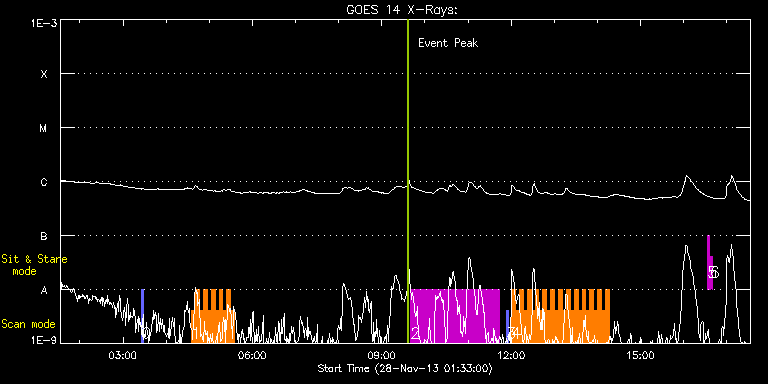 EIS Observation timeline overlay to GOES-Xray curve Code 1" 2" 40" 266" EIS Observations list for this event: STUDY ACRONYM ID DATE OBSERVED DESCRIPTION NOAA# TARGET 0 PRY_slot_context_v3 | 37606 | 2013/11/28 03:25:40 | Active Region studies - returning AR 1 | 1907 | Active Region TIMELINE ID DATE OBSERVED FITS FILE XCEN (+W/-E) YCEN (+N/-S) DUR ----------------------------------------------------------------------------------------------------------------- 37606 | 2013/11/28 03:25:40.000 | eis_l0_20131128_032540.fits.gz | -144.68 | -219.26 | 2m56s 1 IUU_SCAN_STEPS_002 | 37616 | 2013/11/28 04:35:33 | Active Region studies - returning AR 1 | | Active Region TIMELINE ID DATE OBSERVED FITS FILE XCEN (+W/-E) YCEN (+N/-S) DUR ----------------------------------------------------------------------------------------------------------------- 37616 | 2013/11/28 04:35:33.000 | eis_l0_20131128_043533.fits.gz | -120.36 | -219.26 | 5m23s 37616 | 2013/11/28 04:40:59.000 | eis_l0_20131128_044059.fits.gz | -119.58 | -219.11 | 5m24s 37616 | 2013/11/28 04:46:26.000 | eis_l0_20131128_044626.fits.gz | -118.73 | -219.11 | 5m23s 37616 | 2013/11/28 04:51:53.000 | eis_l0_20131128_045153.fits.gz | -117.88 | -219.19 | 5m23s 37616 | 2013/11/28 04:57:19.000 | eis_l0_20131128_045719.fits.gz | -117.03 | -219.11 | 5m24s 37616 | 2013/11/28 05:02:46.000 | eis_l0_20131128_050246.fits.gz | -116.18 | -219.19 | 5m24s 37616 | 2013/11/28 05:08:13.000 | eis_l0_20131128_050813.fits.gz | -115.33 | -219.26 | 5m23s 37616 | 2013/11/28 05:13:40.000 | eis_l0_20131128_051340.fits.gz | -114.49 | -219.19 | 5m23s 37616 | 2013/11/28 05:19:06.000 | eis_l0_20131128_051906.fits.gz | -113.71 | -219.19 | 5m24s 37616 | 2013/11/28 05:24:33.000 | eis_l0_20131128_052433.fits.gz | -112.86 | -219.19 | 5m24s 37616 | 2013/11/28 05:30:00.000 | eis_l0_20131128_053000.fits.gz | -112.01 | -219.19 | 5m23s 2 HPW021_VEL_240x512v1 | 37634 | 2013/11/28 09:40:28 | AR 11903 Observations | 1903 | Active Region TIMELINE ID DATE OBSERVED FITS FILE XCEN (+W/-E) YCEN (+N/-S) DUR ----------------------------------------------------------------------------------------------------------------- 37634 | 2013/11/28 09:40:28.000 | eis_l0_20131128_094028.fits.gz | 829.28 | -96.68 | 2h3m48s 3 PRY_slot_context_v3 | 37635 | 2013/11/28 11:53:34 | AR 11903 Observations | 1903 | Active Region TIMELINE ID DATE OBSERVED FITS FILE XCEN (+W/-E) YCEN (+N/-S) DUR ----------------------------------------------------------------------------------------------------------------- 37635 | 2013/11/28 11:53:34.000 | eis_l0_20131128_115334.fits.gz | 823.47 | -225.99 | 2m56s 4 IUU_SCAN_STEPS_002 | 37640 | 2013/11/28 12:00:34 | Fast raster of AR 11903 | 1903 | Active Region TIMELINE ID DATE OBSERVED FITS FILE XCEN (+W/-E) YCEN (+N/-S) DUR ----------------------------------------------------------------------------------------------------------------- 37640 | 2013/11/28 12:00:34.000 | eis_l0_20131128_120034.fits.gz | 837.67 | -225.99 | 5m23s 37640 | 2013/11/28 12:06:01.000 | eis_l0_20131128_120601.fits.gz | 838.13 | -225.91 | 5m23s 37640 | 2013/11/28 12:11:28.000 | eis_l0_20131128_121128.fits.gz | 838.44 | -226.06 | 5m23s 37640 | 2013/11/28 12:16:54.000 | eis_l0_20131128_121654.fits.gz | 838.83 | -226.06 | 5m24s 37640 | 2013/11/28 12:22:21.000 | eis_l0_20131128_122221.fits.gz | 839.29 | -225.99 | 5m24s 37640 | 2013/11/28 12:27:48.000 | eis_l0_20131128_122748.fits.gz | 839.60 | -225.91 | 5m24s 37640 | 2013/11/28 12:33:15.000 | eis_l0_20131128_123315.fits.gz | 839.99 | -225.83 | 5m24s 37640 | 2013/11/28 12:38:42.000 | eis_l0_20131128_123842.fits.gz | 840.45 | -225.91 | 5m23s 37640 | 2013/11/28 12:44:09.000 | eis_l0_20131128_124409.fits.gz | 840.76 | -225.68 | 5m23s 37640 | 2013/11/28 12:49:35.000 | eis_l0_20131128_124935.fits.gz | 841.22 | -225.75 | 5m24s 37640 | 2013/11/28 12:55:02.000 | eis_l0_20131128_125502.fits.gz | 841.53 | -225.75 | 5m24s 37640 | 2013/11/28 13:00:29.000 | eis_l0_20131128_130029.fits.gz | 841.99 | -225.83 | 5m23s 37640 | 2013/11/28 13:05:56.000 | eis_l0_20131128_130556.fits.gz | 842.30 | -225.75 | 5m23s 37640 | 2013/11/28 13:11:23.000 | eis_l0_20131128_131123.fits.gz | 842.69 | -225.83 | 5m23s 37640 | 2013/11/28 13:16:49.000 | eis_l0_20131128_131649.fits.gz | 843.08 | -225.68 | 5m24s 37640 | 2013/11/28 13:22:16.000 | eis_l0_20131128_132216.fits.gz | 843.46 | -225.75 | 5m24s 37640 | 2013/11/28 13:27:43.000 | eis_l0_20131128_132743.fits.gz | 843.77 | -225.60 | 5m23s 37640 | 2013/11/28 13:33:10.000 | eis_l0_20131128_133310.fits.gz | 844.23 | -225.68 | 5m23s 37640 | 2013/11/28 13:38:36.000 | eis_l0_20131128_133836.fits.gz | 844.54 | -225.68 | 5m24s 37640 | 2013/11/28 13:44:03.000 | eis_l0_20131128_134403.fits.gz | 844.93 | -225.60 | 5m24s 37640 | 2013/11/28 13:49:30.000 | eis_l0_20131128_134930.fits.gz | 845.32 | -225.52 | 5m23s 37640 | 2013/11/28 13:54:57.000 | eis_l0_20131128_135457.fits.gz | 845.70 | -225.52 | 5m23s 37640 | 2013/11/28 14:00:24.000 | eis_l0_20131128_140024.fits.gz | 846.01 | -225.52 | 5m23s 37640 | 2013/11/28 14:05:50.000 | eis_l0_20131128_140550.fits.gz | 846.47 | -225.68 | 5m24s 37640 | 2013/11/28 14:11:17.000 | eis_l0_20131128_141117.fits.gz | 846.86 | -225.52 | 5m24s 5 regcal071 | 37628 | 2013/11/28 16:33:12 | Dark exposures, CCD bottom rows (100s | | Engineering TIMELINE ID DATE OBSERVED FITS FILE XCEN (+W/-E) YCEN (+N/-S) DUR ----------------------------------------------------------------------------------------------------------------- 37628 | 2013/11/28 16:33:12.000 | eis_l0_20131128_163312.fits.gz | 872.35 | -530.06 | 3m22s 6 regcal072 | 37629 | 2013/11/28 16:37:01 | Dark exposures, top CCD rows (100s exp | | Engineering TIMELINE ID DATE OBSERVED FITS FILE XCEN (+W/-E) YCEN (+N/-S) DUR ----------------------------------------------------------------------------------------------------------------- 37629 | 2013/11/28 16:37:01.000 | eis_l0_20131128_163701.fits.gz | 872.58 | -19.06 | 3m21s : Check study information : Download file : View thumbnails For this