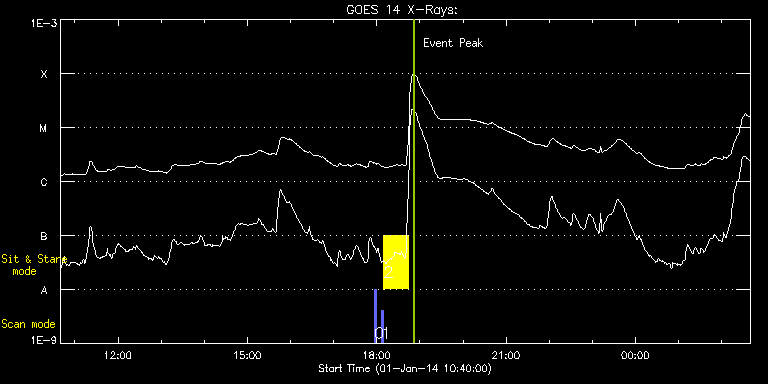 EIS Observation timeline overlay to GOES-Xray curve Code 1" 2" 40" 266" EIS Observations list for this event: STUDY ACRONYM ID DATE OBSERVED DESCRIPTION NOAA# TARGET 0 PRY_slot_contextLITE | 38021 | 2014/01/01 17:56:50 | XRT Synoptic | 1937 | Active Region TIMELINE ID DATE OBSERVED FITS FILE XCEN (+W/-E) YCEN (+N/-S) DUR ----------------------------------------------------------------------------------------------------------------- 38021 | 2014/01/01 17:56:50.000 | eis_l0_20140101_175650.fits.gz | -15.29 | -0.35 | 2m57s 1 PRY_slot_contextLITE | 38026 | 2014/01/01 18:06:44 | Slot Context for Flare Hunting | 1936 | Active Region TIMELINE ID DATE OBSERVED FITS FILE XCEN (+W/-E) YCEN (+N/-S) DUR ----------------------------------------------------------------------------------------------------------------- 38026 | 2014/01/01 18:06:44.000 | eis_l0_20140101_180644.fits.gz | 627.87 | -254.65 | 2m56s 2 Flare266_Hunter01 | 38027 | 2014/01/01 18:09:59 | Flare Hunting AR 11936 | 1936 | Flare TIMELINE ID DATE OBSERVED FITS FILE XCEN (+W/-E) YCEN (+N/-S) DUR ----------------------------------------------------------------------------------------------------------------- 38027 | 2014/01/01 18:09:59.000 | eis_l0_20140101_180959.fits.gz | 510.98 | -254.65 | 34m25s : Check study information : Download file : View thumbnails For this event, also check for: