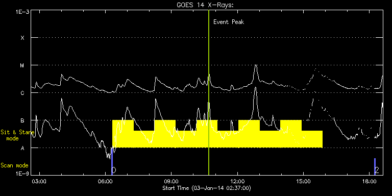 EIS Observation timeline overlay to GOES-Xray curve Code 1" 2" 40" 266" EIS Observations list for this event: STUDY ACRONYM ID DATE OBSERVED DESCRIPTION NOAA# TARGET 0 PRY_slot_contextLITE | 38034 | 2014/01/03 06:16:39 | Slot Context for Flare Hunting | 1936 | Active Region TIMELINE ID DATE OBSERVED FITS FILE XCEN (+W/-E) YCEN (+N/-S) DUR ----------------------------------------------------------------------------------------------------------------- 38034 | 2014/01/03 06:16:39.000 | eis_l0_20140103_061639.fits.gz | 818.75 | -266.62 | 2m57s 1 Flare266_Hunter01 | 38035 | 2014/01/03 06:19:54 | Flare Hunting AR 11936 | 1936 | Flare TIMELINE ID DATE OBSERVED FITS FILE XCEN (+W/-E) YCEN (+N/-S) DUR ----------------------------------------------------------------------------------------------------------------- 38035 | 2014/01/03 06:19:54.000 | eis_l0_20140103_061954.fits.gz | 701.63 | -266.62 | 56m22s 38035 | 2014/01/03 07:17:09.000 | eis_l0_20140103_071709.fits.gz | 705.49 | -267.00 | 56m22s 38035 | 2014/01/03 08:14:23.000 | eis_l0_20140103_081423.fits.gz | 709.05 | -267.39 | 56m22s 38035 | 2014/01/03 09:11:37.000 | eis_l0_20140103_091137.fits.gz | 712.68 | -267.85 | 56m23s 38035 | 2014/01/03 10:08:52.000 | eis_l0_20140103_100852.fits.gz | 716.31 | -268.24 | 56m22s 38035 | 2014/01/03 11:06:06.000 | eis_l0_20140103_110606.fits.gz | 719.78 | -268.70 | 56m23s 38035 | 2014/01/03 12:03:21.000 | eis_l0_20140103_120321.fits.gz | 723.18 | -268.93 | 56m22s 38035 | 2014/01/03 13:00:35.000 | eis_l0_20140103_130035.fits.gz | 726.51 | -269.32 | 56m23s 38035 | 2014/01/03 13:57:50.000 | eis_l0_20140103_135750.fits.gz | 729.75 | -269.94 | 56m22s 38035 | 2014/01/03 14:55:04.000 | eis_l0_20140103_145504.fits.gz | 733.07 | -270.33 | 56m23s 2 PRY_slot_contextLITE | 38030 | 2014/01/03 18:13:26 | Slot Context for Flare Hunting | 1936 | Active Region TIMELINE ID DATE OBSERVED FITS FILE XCEN (+W/-E) YCEN (+N/-S) DUR ----------------------------------------------------------------------------------------------------------------- 38030 | 2014/01/03 18:13:26.000 | eis_l0_20140103_181326.fits.gz | 860.85 | -271.79 | 2m56s : Check study information : Download file : View thumbnails For this event, also check for: