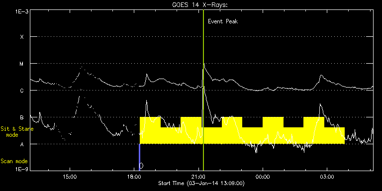 EIS Observation timeline overlay to GOES-Xray curve Code 1" 2" 40" 266" EIS Observations list for this event: STUDY ACRONYM ID DATE OBSERVED DESCRIPTION NOAA# TARGET 0 PRY_slot_contextLITE | 38030 | 2014/01/03 18:13:26 | Slot Context for Flare Hunting | 1936 | Active Region TIMELINE ID DATE OBSERVED FITS FILE XCEN (+W/-E) YCEN (+N/-S) DUR ----------------------------------------------------------------------------------------------------------------- 38030 | 2014/01/03 18:13:26.000 | eis_l0_20140103_181326.fits.gz | 860.85 | -271.79 | 2m56s 1 Flare266_Hunter01 | 38031 | 2014/01/03 18:16:41 | Flare Hunting AR 11936 | 1936 | Flare TIMELINE ID DATE OBSERVED FITS FILE XCEN (+W/-E) YCEN (+N/-S) DUR ----------------------------------------------------------------------------------------------------------------- 38031 | 2014/01/03 18:16:41.000 | eis_l0_20140103_181641.fits.gz | 743.73 | -271.79 | 56m22s 38031 | 2014/01/03 19:13:55.000 | eis_l0_20140103_191355.fits.gz | 746.44 | -272.10 | 56m23s 38031 | 2014/01/03 20:11:10.000 | eis_l0_20140103_201110.fits.gz | 749.22 | -272.49 | 56m22s 38031 | 2014/01/03 21:08:24.000 | eis_l0_20140103_210824.fits.gz | 752.08 | -272.95 | 56m23s 38031 | 2014/01/03 22:05:39.000 | eis_l0_20140103_220539.fits.gz | 754.70 | -273.49 | 56m22s 38031 | 2014/01/03 23:02:53.000 | eis_l0_20140103_230253.fits.gz | 757.17 | -273.80 | 56m23s 38031 | 2014/01/04 00:00:08.000 | eis_l0_20140104_000008.fits.gz | 759.80 | -274.27 | 56m22s 38031 | 2014/01/04 00:57:22.000 | eis_l0_20140104_005722.fits.gz | 762.19 | -274.65 | 56m23s 38031 | 2014/01/04 01:54:37.000 | eis_l0_20140104_015437.fits.gz | 764.51 | -275.04 | 56m22s 38031 | 2014/01/04 02:51:51.000 | eis_l0_20140104_025151.fits.gz | 766.83 | -275.66 | 56m23s : Check study information : Download file : View thumbnails For this event, also check for: