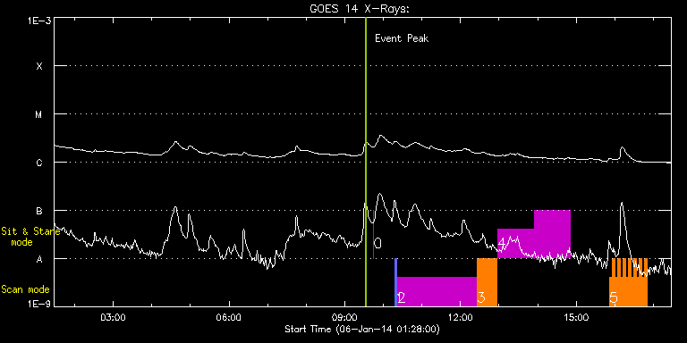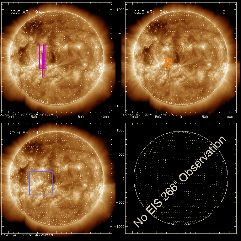 EIS Observation timeline overlay to GOES-Xray curve Code 1" 2" 40" 266" EIS Observations list for this event: STUDY ACRONYM ID DATE OBSERVED DESCRIPTION NOAA# TARGET 0 regcal076 | 38043 | 2014/01/06 09:45:11 | Flatfield, 1 exposure, led 100ms, ccd | | Engineering TIMELINE ID DATE OBSERVED FITS FILE XCEN (+W/-E) YCEN (+N/-S) DUR ----------------------------------------------------------------------------------------------------------------- 38043 | 2014/01/06 09:45:11.000 | eis_l0_20140106_094511.fits.gz | -295.48 | -157.57 | 1s 1 PRY_slot_contextLITE | 38051 | 2014/01/06 10:18:26 | Active Region Studies - Test for Upcom | 1943 | Active Region TIMELINE ID DATE OBSERVED FITS FILE XCEN (+W/-E) YCEN (+N/-S) DUR ----------------------------------------------------------------------------------------------------------------- 38051 | 2014/01/06 10:18:26.000 | eis_l0_20140106_101826.fits.gz | -320.49 | -107.49 | 2m57s 2 HPW021_VEL_240x512v1 | 38056 | 2014/01/06 10:21:34 | Active Region Studies - Test for Upcom | 1944 | Active Region TIMELINE ID DATE OBSERVED FITS FILE XCEN (+W/-E) YCEN (+N/-S) DUR ----------------------------------------------------------------------------------------------------------------- 38056 | 2014/01/06 10:21:34.000 | eis_l0_20140106_102134.fits.gz | -294.32 | 27.59 | 2h3m50s 3 Atlas_30 | 38057 | 2014/01/06 12:25:42 | Active Region Studies - Test for Upcom | | Quiet Sun TIMELINE ID DATE OBSERVED FITS FILE XCEN (+W/-E) YCEN (+N/-S) DUR ----------------------------------------------------------------------------------------------------------------- 38057 | 2014/01/06 12:25:42.000 | eis_l0_20140106_122542.fits.gz | -286.91 | -106.95 | 31m40s 4 HPW021_VEL_001x512v1 | 38058 | 2014/01/06 12:57:39 | Active Region Studies - Test for Upcom | | Active Region TIMELINE ID DATE OBSERVED FITS FILE XCEN (+W/-E) YCEN (+N/-S) DUR ----------------------------------------------------------------------------------------------------------------- 38058 | 2014/01/06 12:57:39.000 | eis_l0_20140106_125739.fits.gz | -268.83 | 27.98 | 56m44s 38058 | 2014/01/06 13:54:30.000 | eis_l0_20140106_135430.fits.gz | -260.41 | 28.36 | 56m43s 5 HH_Flare_162x152 | 38059 | 2014/01/06 15:51:56 | Flare Observations: AR 11944 | | Flare TIMELINE ID DATE OBSERVED FITS FILE XCEN (+W/-E) YCEN (+N/-S) DUR ----------------------------------------------------------------------------------------------------------------- 38059 | 2014/01/06 15:51:56.000 | eis_l0_20140106_155156.fits.gz | -256.66 | -106.18 | 4m10s 38059 | 2014/01/06 15:56:09.000 | eis_l0_20140106_155609.fits.gz | -255.97 | -106.18 | 4m10s 38059 | 2014/01/06 16:00:22.000 | eis_l0_20140106_160022.fits.gz | -255.35 | -106.18 | 4m11s 38059 | 2014/01/06 16:04:36.000 | eis_l0_20140106_160436.fits.gz | -254.65 | -106.18 | 4m11s 38059 | 2014/01/06 16:08:49.000 | eis_l0_20140106_160849.fits.gz | -254.04 | -105.94 | 4m11s 38059 | 2014/01/06 16:13:03.000 | eis_l0_20140106_161303.fits.gz | -253.42 | -106.10 | 4m10s 38059 | 2014/01/06 16:17:16.000 | eis_l0_20140106_161716.fits.gz | -252.72 | -106.02 | 4m11s 38059 | 2014/01/06 16:21:29.000 | eis_l0_20140106_162129.fits.gz | -252.18 | -106.02 | 4m11s 38059 | 2014/01/06 16:25:43.000 | eis_l0_20140106_162543.fits.gz | -251.49 | -106.10 | 4m11s 38059 | 2014/01/06 16:29:57.000 | eis_l0_20140106_162957.fits.gz | -250.87 | -106.02 | 4m10s 38059 | 2014/01/06 16:34:10.000 | eis_l0_20140106_163410.fits.gz | -250.33 | -105.94 | 4m10s 38059 | 2014/01/06 16:38:23.000 | eis_l0_20140106_163823.fits.gz | -249.71 | -105.94 | 4m11s 38059 | 2014/01/06 16:42:37.000 | eis_l0_20140106_164237.fits.gz | -249.01 | -105.87 | 4m10s 38059 | 2014/01/06 16:46:50.000 | eis_l0_20140106_164650.fits.gz | -248.32 | -105.87 | 4m10s : Check study information : Download file : View thumbnails For this event, also check for: