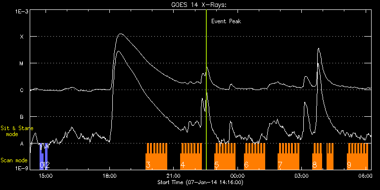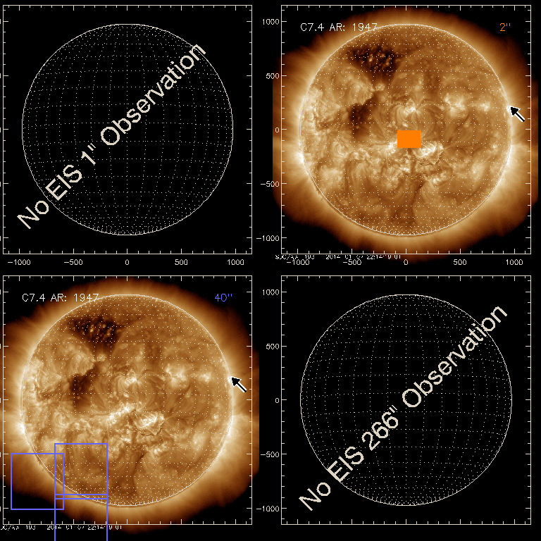 EIS Observation timeline overlay to GOES-Xray curve Code 1" 2" 40" 266" EIS Observations list for this event: STUDY ACRONYM ID DATE OBSERVED DESCRIPTION NOAA# TARGET 0 full_sun_slot_scan_2 | 38099 | 2014/01/07 14:43:13 | HOP 130: Multi-temperature Full Disk S | | Quiet Sun TIMELINE ID DATE OBSERVED FITS FILE XCEN (+W/-E) YCEN (+N/-S) DUR ----------------------------------------------------------------------------------------------------------------- 38099 | 2014/01/07 14:43:13.000 | eis_l0_20140107_144313.fits.gz | -426.32 | -661.37 | 5m28s 1 full_sun_slot_scan_2 | 38100 | 2014/01/07 14:48:46 | HOP 130: Multi-temperature Full Disk S | | Quiet Sun TIMELINE ID DATE OBSERVED FITS FILE XCEN (+W/-E) YCEN (+N/-S) DUR ----------------------------------------------------------------------------------------------------------------- 38100 | 2014/01/07 14:48:46.000 | eis_l0_20140107_144846.fits.gz | -426.40 | -1133.60 | 5m26s 2 full_sun_slot_scan_2 | 38101 | 2014/01/07 14:59:13 | HOP 130: Multi-temperature Full Disk S | | Quiet Sun TIMELINE ID DATE OBSERVED FITS FILE XCEN (+W/-E) YCEN (+N/-S) DUR ----------------------------------------------------------------------------------------------------------------- 38101 | 2014/01/07 14:59:13.000 | eis_l0_20140107_145913.fits.gz | -830.25 | -757.17 | 5m27s 3 HH_Flare_162x152 | 38111 | 2014/01/07 19:42:03 | Flare Observations: AR 11944 | | Flare TIMELINE ID DATE OBSERVED FITS FILE XCEN (+W/-E) YCEN (+N/-S) DUR ----------------------------------------------------------------------------------------------------------------- 38111 | 2014/01/07 19:42:03.000 | eis_l0_20140107_194203.fits.gz | -19.82 | -93.97 | 4m11s 38111 | 2014/01/07 19:46:17.000 | eis_l0_20140107_194617.fits.gz | -19.05 | -94.12 | 4m10s 38111 | 2014/01/07 19:50:30.000 | eis_l0_20140107_195030.fits.gz | -18.43 | -94.12 | 4m11s 38111 | 2014/01/07 19:54:44.000 | eis_l0_20140107_195444.fits.gz | -17.81 | -94.12 | 4m10s 38111 | 2014/01/07 19:58:57.000 | eis_l0_20140107_195857.fits.gz | -17.12 | -94.05 | 4m11s 38111 | 2014/01/07 20:03:11.000 | eis_l0_20140107_200311.fits.gz | -16.50 | -94.05 | 4m10s 38111 | 2014/01/07 20:07:24.000 | eis_l0_20140107_200724.fits.gz | -15.73 | -94.20 | 4m10s 38111 | 2014/01/07 20:11:37.000 | eis_l0_20140107_201137.fits.gz | -15.11 | -94.12 | 4m11s 38111 | 2014/01/07 20:15:51.000 | eis_l0_20140107_201551.fits.gz | -14.49 | -94.05 | 4m10s 38111 | 2014/01/07 20:20:04.000 | eis_l0_20140107_202004.fits.gz | -13.80 | -93.97 | 4m11s 38111 | 2014/01/07 20:24:18.000 | eis_l0_20140107_202418.fits.gz | -13.18 | -94.05 | 4m10s 38111 | 2014/01/07 20:28:31.000 | eis_l0_20140107_202831.fits.gz | -12.56 | -93.97 | 4m10s 38111 | 2014/01/07 20:32:44.000 | eis_l0_20140107_203244.fits.gz | -11.86 | -93.97 | 4m11s 38111 | 2014/01/07 20:36:58.000 | eis_l0_20140107_203658.fits.gz | -11.17 | -93.97 | 4m10s 4 HH_Flare_162x152 | 38112 | 2014/01/07 21:19:11 | Flare Observations: AR 11944 | | Flare TIMELINE ID DATE OBSERVED FITS FILE XCEN (+W/-E) YCEN (+N/-S) DUR ----------------------------------------------------------------------------------------------------------------- 38112 | 2014/01/07 21:19:11.000 | eis_l0_20140107_211911.fits.gz | -4.68 | -94.05 | 4m10s 38112 | 2014/01/07 21:23:24.000 | eis_l0_20140107_212324.fits.gz | -3.99 | -94.05 | 4m11s 38112 | 2014/01/07 21:27:37.000 | eis_l0_20140107_212737.fits.gz | -3.37 | -94.05 | 4m11s 38112 | 2014/01/07 21:31:51.000 | eis_l0_20140107_213151.fits.gz | -2.75 | -93.97 | 4m11s 38112 | 2014/01/07 21:36:04.000 | eis_l0_20140107_213604.fits.gz | -2.05 | -93.97 | 4m11s 38112 | 2014/01/07 21:40:18.000 | eis_l0_20140107_214018.fits.gz | -1.36 | -94.05 | 4m10s 38112 | 2014/01/07 21:44:31.000 | eis_l0_20140107_214431.fits.gz | -0.66 | -93.82 | 4m11s 38112 | 2014/01/07 21:48:45.000 | eis_l0_20140107_214845.fits.gz | 0.03 | -94.05 | 4m10s 38112 | 2014/01/07 21:52:58.000 | eis_l0_20140107_215258.fits.gz | 0.65 | -94.20 | 4m11s 38112 | 2014/01/07 21:57:12.000 | eis_l0_20140107_215712.fits.gz | 1.27 | -93.89 | 4m10s 38112 | 2014/01/07 22:01:25.000 | eis_l0_20140107_220125.fits.gz | 1.96 | -93.82 | 4m10s 38112 | 2014/01/07 22:05:38.000 | eis_l0_20140107_220538.fits.gz | 2.66 | -93.97 | 4m11s 38112 | 2014/01/07 22:09:52.000 | eis_l0_20140107_220952.fits.gz | 3.28 | -93.89 | 4m10s 38112 | 2014/01/07 22:14:05.000 | eis_l0_20140107_221405.fits.gz | 3.89 | -93.89 | 4m11s 5 HH_Flare_162x152 | 38113 | 2014/01/07 22:54:40 | Flare Observations: AR 11944 | | Flare TIMELINE ID DATE OBSERVED FITS FILE XCEN (+W/-E) YCEN (+N/-S) DUR ----------------------------------------------------------------------------------------------------------------- 38113 | 2014/01/07 22:54:40.000 | eis_l0_20140107_225440.fits.gz | 10.23 | -93.82 | 4m10s 38113 | 2014/01/07 22:58:53.000 | eis_l0_20140107_225853.fits.gz | 10.92 | -93.89 | 4m11s 38113 | 2014/01/07 23:03:07.000 | eis_l0_20140107_230307.fits.gz | 11.46 | -93.74 | 4m10s 38113 | 2014/01/07 23:07:20.000 | eis_l0_20140107_230720.fits.gz | 12.24 | -93.89 | 4m11s 38113 | 2014/01/07 23:11:34.000 | eis_l0_20140107_231134.fits.gz | 12.93 | -93.97 | 4m10s 38113 | 2014/01/07 23:15:47.000 | eis_l0_20140107_231547.fits.gz | 13.47 | -93.97 | 4m11s 38113 | 2014/01/07 23:20:00.000 | eis_l0_20140107_232000.fits.gz | 14.25 | -93.97 | 4m11s 38113 | 2014/01/07 23:24:14.000 | eis_l0_20140107_232414.fits.gz | 14.86 | -93.82 | 4m10s 38113 | 2014/01/07 23:28:27.000 | eis_l0_20140107_232827.fits.gz | 15.48 | -93.89 | 4m11s 38113 | 2014/01/07 23:32:41.000 | eis_l0_20140107_233241.fits.gz | 16.18 | -93.82 | 4m10s 38113 | 2014/01/07 23:36:54.000 | eis_l0_20140107_233654.fits.gz | 16.87 | -93.89 | 4m11s 38113 | 2014/01/07 23:41:08.000 | eis_l0_20140107_234108.fits.gz | 17.49 | -93.74 | 4m10s 38113 | 2014/01/07 23:45:21.000 | eis_l0_20140107_234521.fits.gz | 18.18 | -93.74 | 4m10s 38113 | 2014/01/07 23:49:34.000 | eis_l0_20140107_234934.fits.gz | 18.73 | -93.74 | 4m11s 6 HH_Flare_162x152 | 38110 | 2014/01/08 00:18:13 | Flare Observations: AR 11944 | 1944 | Flar