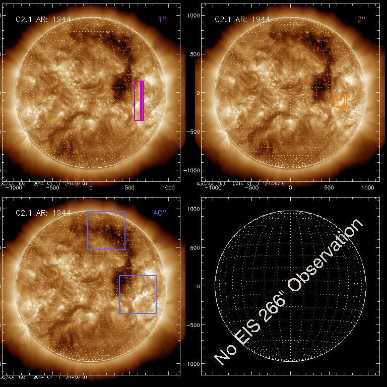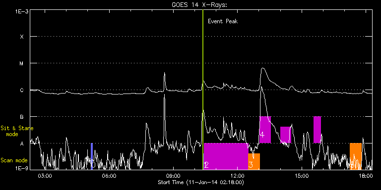 EIS Observation timeline overlay to GOES-Xray curve Code 1" 2" 40" 266" EIS Observations list for this event: STUDY ACRONYM ID DATE OBSERVED DESCRIPTION NOAA# TARGET 0 PRY_slot_contextLITE | 38105 | 2014/01/11 05:09:42 | Context Raster for On-Disk Coronal Hol | | Active Region TIMELINE ID DATE OBSERVED FITS FILE XCEN (+W/-E) YCEN (+N/-S) DUR ----------------------------------------------------------------------------------------------------------------- 38105 | 2014/01/11 05:09:42.000 | eis_l0_20140111_050942.fits.gz | 197.30 | 717.44 | 2m57s 1 PRY_slot_contextLITE | 38118 | 2014/01/11 10:23:14 | Focus Mode Observation - Context | 1944 | Active Region TIMELINE ID DATE OBSERVED FITS FILE XCEN (+W/-E) YCEN (+N/-S) DUR ----------------------------------------------------------------------------------------------------------------- 38118 | 2014/01/11 10:23:14.000 | eis_l0_20140111_102314.fits.gz | 605.64 | -109.00 | 2m56s 2 HPW021_VEL_240x512v1 | 38119 | 2014/01/11 10:26:21 | Focus Mode Observation - raster scan | 1944 | Active Region TIMELINE ID DATE OBSERVED FITS FILE XCEN (+W/-E) YCEN (+N/-S) DUR ----------------------------------------------------------------------------------------------------------------- 38119 | 2014/01/11 10:26:21.000 | eis_l0_20140111_102621.fits.gz | 620.68 | -108.15 | 2h3m48s 3 Atlas_30 | 38120 | 2014/01/11 12:30:27 | Focus Mode Observation - Full CCD spec | 1944 | Quiet Sun TIMELINE ID DATE OBSERVED FITS FILE XCEN (+W/-E) YCEN (+N/-S) DUR ----------------------------------------------------------------------------------------------------------------- 38120 | 2014/01/11 12:30:27.000 | eis_l0_20140111_123027.fits.gz | 635.14 | -108.77 | 31m39s 4 HPW021_VEL_001x512v1 | 38121 | 2014/01/11 13:02:24 | Focus Mode Observation - Sit and Stare | 1944 | Active Region TIMELINE ID DATE OBSERVED FITS FILE XCEN (+W/-E) YCEN (+N/-S) DUR ----------------------------------------------------------------------------------------------------------------- 38121 | 2014/01/11 13:02:24.000 | eis_l0_20140111_130224.fits.gz | 642.25 | -109.00 | 29m54s 38121 | 2014/01/11 14:00:15.000 | eis_l0_20140111_140015.fits.gz | 648.89 | -109.46 | 29m54s 38121 | 2014/01/11 15:34:13.000 | eis_l0_20140111_153413.fits.gz | 659.47 | -110.00 | 18m32s 5 Atlas_30 | 38138 | 2014/01/11 17:15:57 | Synoptic Spectral Atlas Programme | 1944 | Quiet Sun TIMELINE ID DATE OBSERVED FITS FILE XCEN (+W/-E) YCEN (+N/-S) DUR ----------------------------------------------------------------------------------------------------------------- 38138 | 2014/01/11 17:15:57.000 | eis_l0_20140111_171557.fits.gz | 667.27 | -110.78 | 31m39s : Check study information : Download file : View thumbnails For this event, also check for: