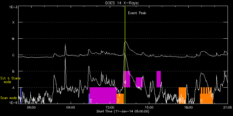EIS Observation timeline overlay to GOES-Xray curve Code 1" 2" 40" 266" EIS Observations list for this event: STUDY ACRONYM ID DATE OBSERVED DESCRIPTION NOAA# TARGET 0 PRY_slot_contextLITE | 38105 | 2014/01/11 05:09:42 | Context Raster for On-Disk Coronal Hol | | Active Region TIMELINE ID DATE OBSERVED FITS FILE XCEN (+W/-E) YCEN (+N/-S) DUR ----------------------------------------------------------------------------------------------------------------- 38105 | 2014/01/11 05:09:42.000 | eis_l0_20140111_050942.fits.gz | 197.30 | 717.44 | 2m57s 1 PRY_slot_contextLITE | 38118 | 2014/01/11 10:23:14 | Focus Mode Observation - Context | 1944 | Active Region TIMELINE ID DATE OBSERVED FITS FILE XCEN (+W/-E) YCEN (+N/-S) DUR ----------------------------------------------------------------------------------------------------------------- 38118 | 2014/01/11 10:23:14.000 | eis_l0_20140111_102314.fits.gz | 605.64 | -109.00 | 2m56s 2 HPW021_VEL_240x512v1 | 38119 | 2014/01/11 10:26:21 | Focus Mode Observation - raster scan | 1944 | Active Region TIMELINE ID DATE OBSERVED FITS FILE XCEN (+W/-E) YCEN (+N/-S) DUR ----------------------------------------------------------------------------------------------------------------- 38119 | 2014/01/11 10:26:21.000 | eis_l0_20140111_102621.fits.gz | 620.68 | -108.15 | 2h3m48s 3 Atlas_30 | 38120 | 2014/01/11 12:30:27 | Focus Mode Observation - Full CCD spec | 1944 | Quiet Sun TIMELINE ID DATE OBSERVED FITS FILE XCEN (+W/-E) YCEN (+N/-S) DUR ----------------------------------------------------------------------------------------------------------------- 38120 | 2014/01/11 12:30:27.000 | eis_l0_20140111_123027.fits.gz | 635.14 | -108.77 | 31m39s 4 HPW021_VEL_001x512v1 | 38121 | 2014/01/11 13:02:24 | Focus Mode Observation - Sit and Stare | 1944 | Active Region TIMELINE ID DATE OBSERVED FITS FILE XCEN (+W/-E) YCEN (+N/-S) DUR ----------------------------------------------------------------------------------------------------------------- 38121 | 2014/01/11 13:02:24.000 | eis_l0_20140111_130224.fits.gz | 642.25 | -109.00 | 29m54s 38121 | 2014/01/11 14:00:15.000 | eis_l0_20140111_140015.fits.gz | 648.89 | -109.46 | 29m54s 38121 | 2014/01/11 15:34:13.000 | eis_l0_20140111_153413.fits.gz | 659.47 | -110.00 | 18m32s 5 Atlas_30 | 38138 | 2014/01/11 17:15:57 | Synoptic Spectral Atlas Programme | 1944 | Quiet Sun TIMELINE ID DATE OBSERVED FITS FILE XCEN (+W/-E) YCEN (+N/-S) DUR ----------------------------------------------------------------------------------------------------------------- 38138 | 2014/01/11 17:15:57.000 | eis_l0_20140111_171557.fits.gz | 667.27 | -110.78 | 31m39s 6 HH_Flare+AR_180x152 | 38140 | 2014/01/11 18:52:43 | Flare Observations | 1944 | Flare TIMELINE ID DATE OBSERVED FITS FILE XCEN (+W/-E) YCEN (+N/-S) DUR ----------------------------------------------------------------------------------------------------------------- 38140 | 2014/01/11 18:52:43.000 | eis_l0_20140111_185243.fits.gz | 675.86 | -111.39 | 5m18s 38140 | 2014/01/11 18:58:04.000 | eis_l0_20140111_185804.fits.gz | 676.32 | -111.39 | 5m18s 38140 | 2014/01/11 19:03:25.000 | eis_l0_20140111_190325.fits.gz | 677.02 | -111.55 | 5m18s 38140 | 2014/01/11 19:08:45.000 | eis_l0_20140111_190845.fits.gz | 677.48 | -111.55 | 5m18s 38140 | 2014/01/11 19:14:06.000 | eis_l0_20140111_191406.fits.gz | 678.02 | -111.55 | 5m18s 38140 | 2014/01/11 19:19:27.000 | eis_l0_20140111_191927.fits.gz | 678.72 | -111.78 | 5m18s 38140 | 2014/01/11 19:24:48.000 | eis_l0_20140111_192448.fits.gz | 679.34 | -111.70 | 5m18s 38140 | 2014/01/11 19:30:09.000 | eis_l0_20140111_193009.fits.gz | 679.88 | -111.70 | 5m18s 38140 | 2014/01/11 19:35:30.000 | eis_l0_20140111_193530.fits.gz | 680.42 | -111.70 | 5m17s 38140 | 2014/01/11 19:40:50.000 | eis_l0_20140111_194050.fits.gz | 681.03 | -111.78 | 5m18s 38140 | 2014/01/11 19:46:11.000 | eis_l0_20140111_194611.fits.gz | 681.58 | -111.70 | 5m18s : Check study information : Download file : View thumbnails For this event, also check for: