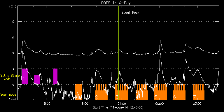 EIS Observation timeline overlay to GOES-Xray curve Code 1" 2" 40" 266" EIS Observations list for this event: STUDY ACRONYM ID DATE OBSERVED DESCRIPTION NOAA# TARGET 0 HPW021_VEL_001x512v1 | 38121 | 2014/01/11 13:02:24 | Focus Mode Observation - Sit and Stare | 1944 | Active Region TIMELINE ID DATE OBSERVED FITS FILE XCEN (+W/-E) YCEN (+N/-S) DUR ----------------------------------------------------------------------------------------------------------------- 38121 | 2014/01/11 13:02:24.000 | eis_l0_20140111_130224.fits.gz | 642.25 | -109.00 | 29m54s 38121 | 2014/01/11 14:00:15.000 | eis_l0_20140111_140015.fits.gz | 648.89 | -109.46 | 29m54s 38121 | 2014/01/11 15:34:13.000 | eis_l0_20140111_153413.fits.gz | 659.47 | -110.00 | 18m32s 1 Atlas_30 | 38138 | 2014/01/11 17:15:57 | Synoptic Spectral Atlas Programme | 1944 | Quiet Sun TIMELINE ID DATE OBSERVED FITS FILE XCEN (+W/-E) YCEN (+N/-S) DUR ----------------------------------------------------------------------------------------------------------------- 38138 | 2014/01/11 17:15:57.000 | eis_l0_20140111_171557.fits.gz | 667.27 | -110.78 | 31m39s 2 HH_Flare+AR_180x152 | 38140 | 2014/01/11 18:52:43 | Flare Observations | 1944 | Flare TIMELINE ID DATE OBSERVED FITS FILE XCEN (+W/-E) YCEN (+N/-S) DUR ----------------------------------------------------------------------------------------------------------------- 38140 | 2014/01/11 18:52:43.000 | eis_l0_20140111_185243.fits.gz | 675.86 | -111.39 | 5m18s 38140 | 2014/01/11 18:58:04.000 | eis_l0_20140111_185804.fits.gz | 676.32 | -111.39 | 5m18s 38140 | 2014/01/11 19:03:25.000 | eis_l0_20140111_190325.fits.gz | 677.02 | -111.55 | 5m18s 38140 | 2014/01/11 19:08:45.000 | eis_l0_20140111_190845.fits.gz | 677.48 | -111.55 | 5m18s 38140 | 2014/01/11 19:14:06.000 | eis_l0_20140111_191406.fits.gz | 678.02 | -111.55 | 5m18s 38140 | 2014/01/11 19:19:27.000 | eis_l0_20140111_191927.fits.gz | 678.72 | -111.78 | 5m18s 38140 | 2014/01/11 19:24:48.000 | eis_l0_20140111_192448.fits.gz | 679.34 | -111.70 | 5m18s 38140 | 2014/01/11 19:30:09.000 | eis_l0_20140111_193009.fits.gz | 679.88 | -111.70 | 5m18s 38140 | 2014/01/11 19:35:30.000 | eis_l0_20140111_193530.fits.gz | 680.42 | -111.70 | 5m17s 38140 | 2014/01/11 19:40:50.000 | eis_l0_20140111_194050.fits.gz | 681.03 | -111.78 | 5m18s 38140 | 2014/01/11 19:46:11.000 | eis_l0_20140111_194611.fits.gz | 681.58 | -111.70 | 5m18s 3 HH_Flare+AR_180x152 | 38141 | 2014/01/11 20:29:43 | Flare Observations | 1944 | Flare TIMELINE ID DATE OBSERVED FITS FILE XCEN (+W/-E) YCEN (+N/-S) DUR ----------------------------------------------------------------------------------------------------------------- 38141 | 2014/01/11 20:29:43.000 | eis_l0_20140111_202943.fits.gz | 686.29 | -112.25 | 5m18s 38141 | 2014/01/11 20:35:04.000 | eis_l0_20140111_203504.fits.gz | 686.83 | -112.17 | 5m18s 38141 | 2014/01/11 20:40:25.000 | eis_l0_20140111_204025.fits.gz | 687.37 | -112.17 | 5m18s 38141 | 2014/01/11 20:45:46.000 | eis_l0_20140111_204546.fits.gz | 687.91 | -112.40 | 5m18s 38141 | 2014/01/11 20:51:07.000 | eis_l0_20140111_205107.fits.gz | 688.53 | -112.32 | 5m17s 38141 | 2014/01/11 20:56:27.000 | eis_l0_20140111_205627.fits.gz | 689.15 | -112.40 | 5m17s 38141 | 2014/01/11 21:01:47.000 | eis_l0_20140111_210147.fits.gz | 689.69 | -112.40 | 5m19s 38141 | 2014/01/11 21:07:08.000 | eis_l0_20140111_210708.fits.gz | 690.15 | -112.25 | 5m18s 38141 | 2014/01/11 21:12:29.000 | eis_l0_20140111_211229.fits.gz | 690.84 | -112.55 | 5m18s 38141 | 2014/01/11 21:17:50.000 | eis_l0_20140111_211750.fits.gz | 691.39 | -112.48 | 5m18s 38141 | 2014/01/11 21:23:11.000 | eis_l0_20140111_212311.fits.gz | 691.93 | -112.55 | 5m18s 4 HH_Flare+AR_180x152 | 38142 | 2014/01/11 22:06:13 | Flare Observations | 1944 | Flare TIMELINE ID DATE OBSERVED FITS FILE XCEN (+W/-E) YCEN (+N/-S) DUR ----------------------------------------------------------------------------------------------------------------- 38142 | 2014/01/11 22:06:13.000 | eis_l0_20140111_220613.fits.gz | 696.48 | -112.71 | 5m18s 38142 | 2014/01/11 22:11:34.000 | eis_l0_20140111_221134.fits.gz | 697.02 | -113.02 | 5m17s 38142 | 2014/01/11 22:16:54.000 | eis_l0_20140111_221654.fits.gz | 697.57 | -112.94 | 5m17s 38142 | 2014/01/11 22:22:14.000 | eis_l0_20140111_222214.fits.gz | 698.18 | -113.10 | 5m19s 38142 | 2014/01/11 22:27:36.000 | eis_l0_20140111_222736.fits.gz | 698.72 | -113.02 | 5m18s 38142 | 2014/01/11 22:32:57.000 | eis_l0_20140111_223257.fits.gz | 699.27 | -113.10 | 5m18s 38142 | 2014/01/11 22:38:18.000 | eis_l0_20140111_223818.fits.gz | 699.80 | -113.02 | 5m17s 38142 | 2014/01/11 22:43:38.000 | eis_l0_20140111_224338.fits.gz | 700.50 | -113.17 | 5m18s 38142 | 2014/01/11 22:48:59.000 | eis_l0_20140111_224859.fits.gz | 700.96 | -113.02 | 5m18s 38142 | 2014/01/11 22:54:20.000 | eis_l0_20140111_225420.fits.gz | 701.51 | -113.33 | 5m18s 38142 | 2014/01/11 22:59:41.000 | eis_l0_20140111_225941.fits.gz | 702.04 | -113.33 | 5m18s 5 HH_Flare+AR_180x152 | 38143 | 2014/01/11 23:35:13 | Flare Observations | 1944 | Flare TIMELINE ID DATE OBSERVED FITS FILE XCEN (+W/-E) YCEN (+N/-S) DUR ----------------------------------------------------------------------------------------------------------------- 38143 | 2014/01/11 23:35:13.000 | eis_l0_20140111_233513.fits.gz | 705.75 | -113.56 | 5m18s 38143 | 2014/01/11 23:40:33.000 | eis_l0_20140111_234033.fits.gz | 706.29 | -113.48 | 5m19s 38143 | 2014/01/11 23:45:55.000 | eis_l0_20140111_234555.fits.gz | 706.84 | -113.48 | 5m18s 38143 | 2014/01/11 23:51:16.000 | eis_l0_20140111_235116.fits.gz | 707.38 | -113.64 | 5m18s 38143 | 2014/01/11 23:56:37.000 | eis_l0_20140111_235637.fits.gz | 707.84 | -113.64 | 5m18s 38143 | 2014/01/12 00:01:58.000 | eis_l0_20140112_000158.fits.gz | 708.46 | -113.71 | 5m18s 38143 | 2014/01/12 00:07:19.000 | eis_l0_20140112_000719.fits.gz | 709.08 | -113.71 | 5m18s 38143 | 2014/01/12 00:12:40.000 | eis_l0_20140112_001240.fits.gz | 709.62 | -113.87 | 5m17s 38143 | 2014/01/12 00:18:00.000 | eis_l0_2014