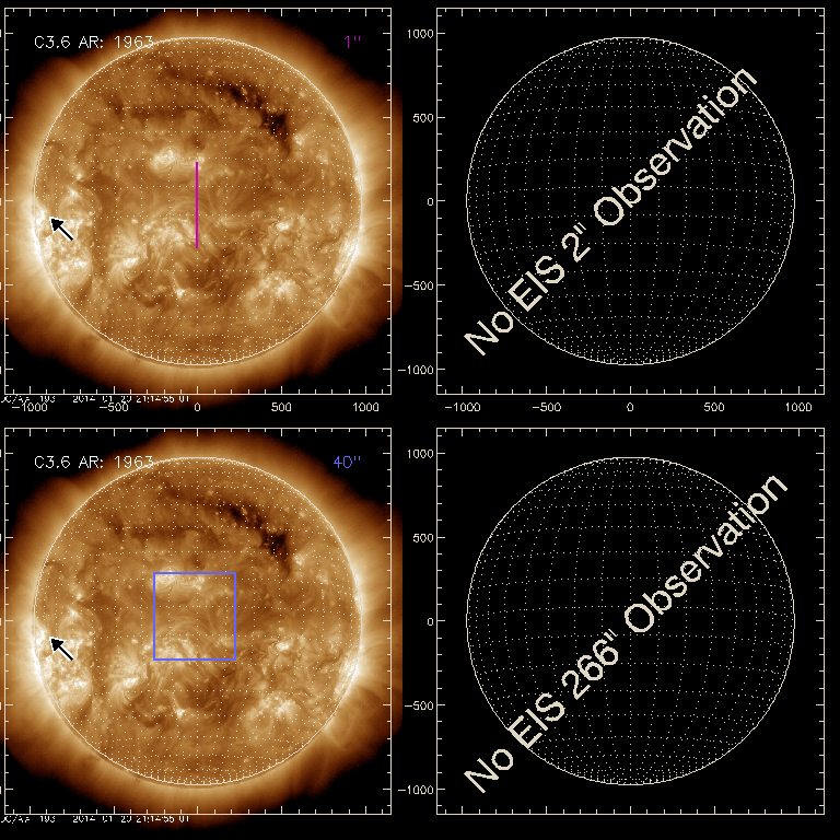 EIS Observation timeline overlay to GOES-Xray curve Code 1" 2" 40" 266" EIS Observations list for this event: STUDY ACRONYM ID DATE OBSERVED DESCRIPTION NOAA# TARGET 0 IUU_SLOT_488x512 | 38315 | 2014/01/20 22:47:47 | Focus mode obs. - large slot image | | Quiet Sun TIMELINE ID DATE OBSERVED FITS FILE XCEN (+W/-E) YCEN (+N/-S) DUR ----------------------------------------------------------------------------------------------------------------- 38315 | 2014/01/20 22:47:47.000 | eis_l0_20140120_224747.fits.gz | -16.29 | 24.42 | 7m56s 1 IUU_QS_SNS_001 | 38316 | 2014/01/20 22:55:55 | Focus mode obs. - sit and stare | | Quiet Sun TIMELINE ID DATE OBSERVED FITS FILE XCEN (+W/-E) YCEN (+N/-S) DUR ----------------------------------------------------------------------------------------------------------------- 38316 | 2014/01/20 22:55:55.000 | eis_l0_20140120_225555.fits.gz | -1.06 | -25.50 | 1h1m52s 38316 | 2014/01/20 23:57:52.000 | eis_l0_20140120_235752.fits.gz | -1.06 | -25.50 | 1h1m52s 38316 | 2014/01/21 00:59:49.000 | eis_l0_20140121_005949.fits.gz | -0.99 | -25.58 | 1h1m52s 38316 | 2014/01/21 02:01:47.000 | eis_l0_20140121_020147.fits.gz | -0.99 | -25.58 | 1h1m52s : Check study information : Download file : View thumbnails For this event, also check for: