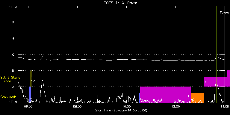 EIS Observation timeline overlay to GOES-Xray curve Code 1" 2" 40" 266" EIS Observations list for this event: STUDY ACRONYM ID DATE OBSERVED DESCRIPTION NOAA# TARGET 0 PRY_slot_contextLITE | 38320 | 2014/01/25 06:02:40 | EIS pointing and alignment | 1960 | Active Region TIMELINE ID DATE OBSERVED FITS FILE XCEN (+W/-E) YCEN (+N/-S) DUR ----------------------------------------------------------------------------------------------------------------- 38320 | 2014/01/25 06:02:40.000 | eis_l0_20140125_060240.fits.gz | -15.37 | -0.42 | 2m57s 1 Alignment_266 | 38321 | 2014/01/25 06:05:55 | EIS pointing and alignment | | Quiet Sun TIMELINE ID DATE OBSERVED FITS FILE XCEN (+W/-E) YCEN (+N/-S) DUR ----------------------------------------------------------------------------------------------------------------- 38321 | 2014/01/25 06:05:55.000 | eis_l0_20140125_060555.fits.gz | -132.49 | -0.42 | 1m22s 2 XRT_synop_AIA | 38322 | 2014/01/25 06:08:30 | EIS pointing and alignment | | Quiet Sun TIMELINE ID DATE OBSERVED FITS FILE XCEN (+W/-E) YCEN (+N/-S) DUR ----------------------------------------------------------------------------------------------------------------- 38322 | 2014/01/25 06:08:30.000 | eis_l0_20140125_060830.fits.gz | -132.49 | -0.50 | 10s 3 regcal077 | 38379 | 2014/01/25 06:10:57 | Flatfield, 2 exposures, led 80ms, full | | Engineering TIMELINE ID DATE OBSERVED FITS FILE XCEN (+W/-E) YCEN (+N/-S) DUR ----------------------------------------------------------------------------------------------------------------- 38379 | 2014/01/25 06:10:57.000 | eis_l0_20140125_061057.fits.gz | 14.51 | -50.58 | 4s 4 PRY_slot_contextLITE | 38422 | 2014/01/25 10:30:27 | Active region study | 1959 | Active Region TIMELINE ID DATE OBSERVED FITS FILE XCEN (+W/-E) YCEN (+N/-S) DUR ----------------------------------------------------------------------------------------------------------------- 38422 | 2014/01/25 10:30:27.000 | eis_l0_20140125_103027.fits.gz | 135.11 | -276.09 | 2m56s 5 HPW021_VEL_240x512v1 | 38423 | 2014/01/25 10:33:34 | Active region study | 1959 | Active Region TIMELINE ID DATE OBSERVED FITS FILE XCEN (+W/-E) YCEN (+N/-S) DUR ----------------------------------------------------------------------------------------------------------------- 38423 | 2014/01/25 10:33:34.000 | eis_l0_20140125_103334.fits.gz | 150.40 | -275.94 | 2h3m49s 6 Atlas_30 | 38424 | 2014/01/25 12:37:41 | Active region study | | Quiet Sun TIMELINE ID DATE OBSERVED FITS FILE XCEN (+W/-E) YCEN (+N/-S) DUR ----------------------------------------------------------------------------------------------------------------- 38424 | 2014/01/25 12:37:41.000 | eis_l0_20140125_123741.fits.gz | 167.23 | -324.17 | 31m39s 7 HPW021_VEL_001x512v1 | 38425 | 2014/01/25 13:09:38 | Active region study | | Active Region TIMELINE ID DATE OBSERVED FITS FILE XCEN (+W/-E) YCEN (+N/-S) DUR ----------------------------------------------------------------------------------------------------------------- 38425 | 2014/01/25 13:09:38.000 | eis_l0_20140125_130938.fits.gz | 172.04 | -276.17 | 56m43s 38425 | 2014/01/25 14:06:28.000 | eis_l0_20140125_140628.fits.gz | 179.92 | -276.32 | 56m42s 38425 | 2014/01/25 15:03:17.000 | eis_l0_20140125_150317.fits.gz | 187.57 | -276.40 | 56m42s : Check study information : Download file : View thumbnails For this event, also check for: