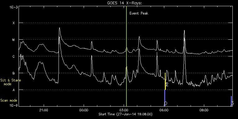 EIS Observation timeline overlay to GOES-Xray curve Code 1" 2" 40" 266" EIS Observations list for this event: STUDY ACRONYM ID DATE OBSERVED DESCRIPTION NOAA# TARGET 0 PRY_slot_contextLITE | 38329 | 2014/01/28 06:01:34 | EIS pointing and alignment | 1965 | Active Region TIMELINE ID DATE OBSERVED FITS FILE XCEN (+W/-E) YCEN (+N/-S) DUR ----------------------------------------------------------------------------------------------------------------- 38329 | 2014/01/28 06:01:34.000 | eis_l0_20140128_060134.fits.gz | -15.29 | -0.42 | 2m56s 1 Alignment_266 | 38330 | 2014/01/28 06:04:49 | EIS pointing and alignment | | Quiet Sun TIMELINE ID DATE OBSERVED FITS FILE XCEN (+W/-E) YCEN (+N/-S) DUR ----------------------------------------------------------------------------------------------------------------- 38330 | 2014/01/28 06:04:49.000 | eis_l0_20140128_060449.fits.gz | -132.57 | -0.50 | 1m22s 2 XRT_synop_AIA | 38331 | 2014/01/28 06:06:56 | EIS pointing and alignment | | Quiet Sun TIMELINE ID DATE OBSERVED FITS FILE XCEN (+W/-E) YCEN (+N/-S) DUR ----------------------------------------------------------------------------------------------------------------- 38331 | 2014/01/28 06:06:56.000 | eis_l0_20140128_060656.fits.gz | -132.57 | -0.42 | 10s 3 PRY_slot_contextLITE | 38444 | 2014/01/28 11:00:26 | Active region study | 1959 | Active Region TIMELINE ID DATE OBSERVED FITS FILE XCEN (+W/-E) YCEN (+N/-S) DUR ----------------------------------------------------------------------------------------------------------------- 38444 | 2014/01/28 11:00:26.000 | eis_l0_20140128_110026.fits.gz | 652.28 | -301.50 | 2m56s : Check study information : Download file : View thumbnails For this event, also check for: