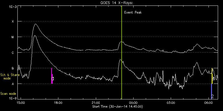 EIS Observation timeline overlay to GOES-Xray curve Code 1" 2" 40" 266" EIS Observations list for this event: STUDY ACRONYM ID DATE OBSERVED DESCRIPTION NOAA# TARGET 0 regcal071 | 38388 | 2014/01/30 17:26:11 | Dark exposures, CCD bottom rows (100s | | Engineering TIMELINE ID DATE OBSERVED FITS FILE XCEN (+W/-E) YCEN (+N/-S) DUR ----------------------------------------------------------------------------------------------------------------- 38388 | 2014/01/30 17:26:11.000 | eis_l0_20140130_172611.fits.gz | 854.35 | -685.79 | 3m22s 1 regcal072 | 38389 | 2014/01/30 17:30:00 | Dark exposures, top CCD rows (100s exp | | Engineering TIMELINE ID DATE OBSERVED FITS FILE XCEN (+W/-E) YCEN (+N/-S) DUR ----------------------------------------------------------------------------------------------------------------- 38389 | 2014/01/30 17:30:00.000 | eis_l0_20140130_173000.fits.gz | 854.42 | -174.71 | 3m22s 2 PRY_slot_contextLITE | 38338 | 2014/01/31 06:12:19 | EIS pointing and alignment | | Active Region TIMELINE ID DATE OBSERVED FITS FILE XCEN (+W/-E) YCEN (+N/-S) DUR ----------------------------------------------------------------------------------------------------------------- 38338 | 2014/01/31 06:12:19.000 | eis_l0_20140131_061219.fits.gz | -15.37 | -0.42 | 2m56s 3 Alignment_266 | 38339 | 2014/01/31 06:15:34 | EIS pointing and alignment | | Quiet Sun TIMELINE ID DATE OBSERVED FITS FILE XCEN (+W/-E) YCEN (+N/-S) DUR ----------------------------------------------------------------------------------------------------------------- 38339 | 2014/01/31 06:15:34.000 | eis_l0_20140131_061534.fits.gz | -132.57 | -0.50 | 1m22s 4 XRT_synop_AIA | 38340 | 2014/01/31 06:18:08 | EIS pointing and alignment | | Quiet Sun TIMELINE ID DATE OBSERVED FITS FILE XCEN (+W/-E) YCEN (+N/-S) DUR ----------------------------------------------------------------------------------------------------------------- 38340 | 2014/01/31 06:18:08.000 | eis_l0_20140131_061808.fits.gz | -132.49 | -0.50 | 10s : Check study information : Download file : View thumbnails For this event, also check for: