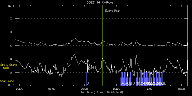 EIS Observation timeline overlay to GOES-Xray curve Code 1" 2" 40" 266" EIS Observations list for this event: STUDY ACRONYM ID DATE OBSERVED DESCRIPTION NOAA# TARGET 0 PRY_slot_contextLITE | 38338 | 2014/01/31 06:12:19 | EIS pointing and alignment | | Active Region TIMELINE ID DATE OBSERVED FITS FILE XCEN (+W/-E) YCEN (+N/-S) DUR ----------------------------------------------------------------------------------------------------------------- 38338 | 2014/01/31 06:12:19.000 | eis_l0_20140131_061219.fits.gz | -15.37 | -0.42 | 2m56s 1 Alignment_266 | 38339 | 2014/01/31 06:15:34 | EIS pointing and alignment | | Quiet Sun TIMELINE ID DATE OBSERVED FITS FILE XCEN (+W/-E) YCEN (+N/-S) DUR ----------------------------------------------------------------------------------------------------------------- 38339 | 2014/01/31 06:15:34.000 | eis_l0_20140131_061534.fits.gz | -132.57 | -0.50 | 1m22s 2 XRT_synop_AIA | 38340 | 2014/01/31 06:18:08 | EIS pointing and alignment | | Quiet Sun TIMELINE ID DATE OBSERVED FITS FILE XCEN (+W/-E) YCEN (+N/-S) DUR ----------------------------------------------------------------------------------------------------------------- 38340 | 2014/01/31 06:18:08.000 | eis_l0_20140131_061808.fits.gz | -132.49 | -0.50 | 10s 3 full_sun_slot_scan_1 | 38390 | 2014/01/31 09:21:26 | HOP130 | | Quiet Sun TIMELINE ID DATE OBSERVED FITS FILE XCEN (+W/-E) YCEN (+N/-S) DUR ----------------------------------------------------------------------------------------------------------------- 38390 | 2014/01/31 09:21:26.000 | eis_l0_20140131_092126.fits.gz | 920.80 | 185.73 | 5m27s 4 full_sun_slot_scan_1 | 38391 | 2014/01/31 09:27:26 | HOP130 | 1959 | Quiet Sun TIMELINE ID DATE OBSERVED FITS FILE XCEN (+W/-E) YCEN (+N/-S) DUR ----------------------------------------------------------------------------------------------------------------- 38391 | 2014/01/31 09:27:26.000 | eis_l0_20140131_092726.fits.gz | 920.72 | -286.50 | 5m26s 5 full_sun_slot_scan_1 | 38392 | 2014/01/31 09:37:40 | HOP130 | | Quiet Sun TIMELINE ID DATE OBSERVED FITS FILE XCEN (+W/-E) YCEN (+N/-S) DUR ----------------------------------------------------------------------------------------------------------------- 38392 | 2014/01/31 09:37:40.000 | eis_l0_20140131_093740.fits.gz | 452.68 | 185.58 | 5m27s 6 full_sun_slot_scan_1 | 38393 | 2014/01/31 09:43:12 | HOP130 | | Quiet Sun TIMELINE ID DATE OBSERVED FITS FILE XCEN (+W/-E) YCEN (+N/-S) DUR ----------------------------------------------------------------------------------------------------------------- 38393 | 2014/01/31 09:43:12.000 | eis_l0_20140131_094312.fits.gz | 452.83 | -286.58 | 5m26s 7 full_sun_slot_scan_1 | 38394 | 2014/01/31 09:53:13 | HOP130 | | Quiet Sun TIMELINE ID DATE OBSERVED FITS FILE XCEN (+W/-E) YCEN (+N/-S) DUR ----------------------------------------------------------------------------------------------------------------- 38394 | 2014/01/31 09:53:13.000 | eis_l0_20140131_095313.fits.gz | -15.29 | 185.58 | 5m26s 8 full_sun_slot_scan_1 | 38395 | 2014/01/31 09:58:45 | HOP130 | | Quiet Sun TIMELINE ID DATE OBSERVED FITS FILE XCEN (+W/-E) YCEN (+N/-S) DUR ----------------------------------------------------------------------------------------------------------------- 38395 | 2014/01/31 09:58:45.000 | eis_l0_20140131_095845.fits.gz | -15.29 | -286.35 | 5m26s 9 full_sun_slot_scan_1 | 38396 | 2014/01/31 10:09:13 | HOP130 | 1968 | Quiet Sun TIMELINE ID DATE OBSERVED FITS FILE XCEN (+W/-E) YCEN (+N/-S) DUR ----------------------------------------------------------------------------------------------------------------- 38396 | 2014/01/31 10:09:13.000 | eis_l0_20140131_100913.fits.gz | -483.26 | 185.58 | 5m27s 10 full_sun_slot_scan_1 | 38397 | 2014/01/31 10:14:45 | HOP130 | 1967 | Quiet Sun TIMELINE ID DATE OBSERVED FITS FILE XCEN (+W/-E) YCEN (+N/-S) DUR ----------------------------------------------------------------------------------------------------------------- 38397 | 2014/01/31 10:14:45.000 | eis_l0_20140131_101445.fits.gz | -483.26 | -286.42 | 5m27s 11 full_sun_slot_scan_1 | 38398 | 2014/01/31 10:47:43 | HOP130 | | Quiet Sun TIMELINE ID DATE OBSERVED FITS FILE XCEN (+W/-E) YCEN (+N/-S) DUR ----------------------------------------------------------------------------------------------------------------- 38398 | 2014/01/31 10:47:43.000 | eis_l0_20140131_104743.fits.gz | -9884.69 | -9777.20 | 5m27s 12 full_sun_slot_scan_1 | 38399 | 2014/01/31 10:53:15 | HOP130 | | Quiet Sun TIMELINE ID DATE OBSERVED FITS FILE XCEN (+W/-E) YCEN (+N/-S) DUR ----------------------------------------------------------------------------------------------------------------- 38399 | 2014/01/31 10:53:15.000 | eis_l0_20140131_105315.fits.gz | -9884.69 | -10249.20 | 5m26s 13 full_sun_slot_scan_1 | 38400 | 2014/01/31 11:03:43 | HOP130 | | Quiet Sun TIMELINE ID DATE OBSERVED FITS FILE XCEN (+W/-E) YCEN (+N/-S) DUR ----------------------------------------------------------------------------------------------------------------- 38400 | 2014/01/31 11:03:43.000 | eis_l0_20140131_110343.fits.gz | 743.44 | 655.55 | 5m27s 14 full_sun_slot_scan_1 | 38401 | 2014/01/31 11:13:43 | HOP130 | | Quiet Sun TIMELINE ID DATE OBSERVED FITS FILE XCEN (+W/-E) YCEN (+N/-S) DUR ----------------------------------------------------------------------------------------------------------------- 38401 | 2014/01/31 11:13:43.000 | eis_l0_20140131_111343.fits.gz | 395.74 | 1032.75 | 5m27s 15 full_sun_slot_scan_1 | 38402 | 2014/01/31 11:19:15 | HOP130 | | Quiet Sun TIMELINE ID DATE OBSERVED FITS FILE XCEN (+W/-E) YCEN (+N/-S) DUR ----------------------------------------------------------------------------------------------------------------- 38402 | 2014/01/31 11:19:15.000 | eis_l0_20140131_111915.fits.gz | 395.82 | 560.67 | 5m26s 16 full_sun_slot_scan_1 | 38403 | 2014/01/31 11:29:42 | HOP130 | | Quiet Sun TIMELINE ID DATE OBSERVED FITS FILE XCEN (+W/-E) YCEN (+N/-S) DUR -------------------------------------------------------
