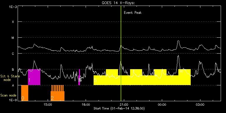 EIS Observation timeline overlay to GOES-Xray curve Code 1" 2" 40" 266" EIS Observations list for this event: STUDY ACRONYM ID DATE OBSERVED DESCRIPTION NOAA# TARGET 0 Atlas_30 | 38462 | 2014/02/01 12:54:41 | AR 11967 obs (Focused mode obs) | | Quiet Sun TIMELINE ID DATE OBSERVED FITS FILE XCEN (+W/-E) YCEN (+N/-S) DUR ----------------------------------------------------------------------------------------------------------------- 38462 | 2014/02/01 12:54:41.000 | eis_l0_20140201_125441.fits.gz | -374.43 | -148.43 | 31m38s 1 HPW021_VEL_001x512v1 | 38463 | 2014/02/01 13:26:37 | AR 11967 obs (Focused mode obs) | | Active Region TIMELINE ID DATE OBSERVED FITS FILE XCEN (+W/-E) YCEN (+N/-S) DUR ----------------------------------------------------------------------------------------------------------------- 38463 | 2014/02/01 13:26:37.000 | eis_l0_20140201_132637.fits.gz | -369.46 | -148.20 | 56m42s 2 HH_Flare_162x152 | 38513 | 2014/02/01 15:14:27 | AR 11967 obs | | Flare TIMELINE ID DATE OBSERVED FITS FILE XCEN (+W/-E) YCEN (+N/-S) DUR ----------------------------------------------------------------------------------------------------------------- 38513 | 2014/02/01 15:14:27.000 | eis_l0_20140201_151427.fits.gz | -355.39 | -147.35 | 4m10s 38513 | 2014/02/01 15:18:40.000 | eis_l0_20140201_151840.fits.gz | -354.84 | -147.35 | 4m11s 38513 | 2014/02/01 15:22:53.000 | eis_l0_20140201_152253.fits.gz | -354.15 | -147.43 | 4m11s 38513 | 2014/02/01 15:27:07.000 | eis_l0_20140201_152707.fits.gz | -353.61 | -147.50 | 4m10s 38513 | 2014/02/01 15:31:20.000 | eis_l0_20140201_153120.fits.gz | -353.07 | -147.43 | 4m11s 38513 | 2014/02/01 15:35:34.000 | eis_l0_20140201_153534.fits.gz | -352.37 | -147.43 | 4m11s 38513 | 2014/02/01 15:39:47.000 | eis_l0_20140201_153947.fits.gz | -351.75 | -147.27 | 4m11s 38513 | 2014/02/01 15:44:00.000 | eis_l0_20140201_154400.fits.gz | -351.14 | -147.27 | 4m11s 38513 | 2014/02/01 15:48:14.000 | eis_l0_20140201_154814.fits.gz | -350.67 | -147.19 | 4m11s 38513 | 2014/02/01 15:52:28.000 | eis_l0_20140201_155228.fits.gz | -349.98 | -147.27 | 4m10s 38513 | 2014/02/01 15:56:41.000 | eis_l0_20140201_155641.fits.gz | -349.44 | -147.12 | 4m11s 38513 | 2014/02/01 16:00:54.000 | eis_l0_20140201_160054.fits.gz | -348.74 | -147.12 | 4m11s 38513 | 2014/02/01 16:05:08.000 | eis_l0_20140201_160508.fits.gz | -348.20 | -146.96 | 4m10s 38513 | 2014/02/01 16:09:21.000 | eis_l0_20140201_160921.fits.gz | -347.58 | -147.12 | 4m11s 38513 | 2014/02/01 16:13:35.000 | eis_l0_20140201_161335.fits.gz | -346.96 | -147.04 | 4m11s 3 regcal071 | 38508 | 2014/02/01 17:24:12 | Dark exposures, CCD bottom rows (100s | | Engineering TIMELINE ID DATE OBSERVED FITS FILE XCEN (+W/-E) YCEN (+N/-S) DUR ----------------------------------------------------------------------------------------------------------------- 38508 | 2014/02/01 17:24:12.000 | eis_l0_20140201_172412.fits.gz | -321.44 | -451.73 | 3m21s 4 regcal072 | 38509 | 2014/02/01 17:28:00 | Dark exposures, top CCD rows (100s exp | | Engineering TIMELINE ID DATE OBSERVED FITS FILE XCEN (+W/-E) YCEN (+N/-S) DUR ----------------------------------------------------------------------------------------------------------------- 38509 | 2014/02/01 17:28:00.000 | eis_l0_20140201_172800.fits.gz | -320.82 | 59.27 | 3m22s 5 Flare266_Hunter01 | 38560 | 2014/02/01 18:37:33 | EIS-FT obs (AR11967) | 1967 | Flare TIMELINE ID DATE OBSERVED FITS FILE XCEN (+W/-E) YCEN (+N/-S) DUR ----------------------------------------------------------------------------------------------------------------- 38560 | 2014/02/01 18:37:33.000 | eis_l0_20140201_183733.fits.gz | -458.16 | -146.11 | 56m23s 38560 | 2014/02/01 19:34:48.000 | eis_l0_20140201_193448.fits.gz | -449.98 | -145.73 | 56m22s 38560 | 2014/02/01 20:32:03.000 | eis_l0_20140201_203203.fits.gz | -441.71 | -145.57 | 56m22s 38560 | 2014/02/01 21:29:17.000 | eis_l0_20140201_212917.fits.gz | -433.52 | -145.03 | 56m22s 38560 | 2014/02/01 22:26:32.000 | eis_l0_20140201_222632.fits.gz | -425.33 | -144.80 | 56m22s 38560 | 2014/02/01 23:23:46.000 | eis_l0_20140201_232346.fits.gz | -416.99 | -144.41 | 56m22s 38560 | 2014/02/02 00:21:01.000 | eis_l0_20140202_002101.fits.gz | -408.73 | -144.34 | 56m22s 38560 | 2014/02/02 01:18:15.000 | eis_l0_20140202_011815.fits.gz | -400.46 | -143.95 | 56m22s : Check study information : Download file : View thumbnails For this event, also check for: