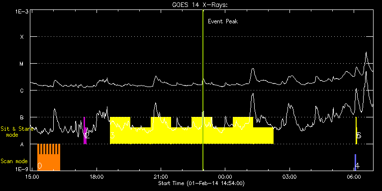 EIS Observation timeline overlay to GOES-Xray curve Code 1" 2" 40" 266" EIS Observations list for this event: STUDY ACRONYM ID DATE OBSERVED DESCRIPTION NOAA# TARGET 0 HH_Flare_162x152 | 38513 | 2014/02/01 15:14:27 | AR 11967 obs | | Flare TIMELINE ID DATE OBSERVED FITS FILE XCEN (+W/-E) YCEN (+N/-S) DUR ----------------------------------------------------------------------------------------------------------------- 38513 | 2014/02/01 15:14:27.000 | eis_l0_20140201_151427.fits.gz | -355.39 | -147.35 | 4m10s 38513 | 2014/02/01 15:18:40.000 | eis_l0_20140201_151840.fits.gz | -354.84 | -147.35 | 4m11s 38513 | 2014/02/01 15:22:53.000 | eis_l0_20140201_152253.fits.gz | -354.15 | -147.43 | 4m11s 38513 | 2014/02/01 15:27:07.000 | eis_l0_20140201_152707.fits.gz | -353.61 | -147.50 | 4m10s 38513 | 2014/02/01 15:31:20.000 | eis_l0_20140201_153120.fits.gz | -353.07 | -147.43 | 4m11s 38513 | 2014/02/01 15:35:34.000 | eis_l0_20140201_153534.fits.gz | -352.37 | -147.43 | 4m11s 38513 | 2014/02/01 15:39:47.000 | eis_l0_20140201_153947.fits.gz | -351.75 | -147.27 | 4m11s 38513 | 2014/02/01 15:44:00.000 | eis_l0_20140201_154400.fits.gz | -351.14 | -147.27 | 4m11s 38513 | 2014/02/01 15:48:14.000 | eis_l0_20140201_154814.fits.gz | -350.67 | -147.19 | 4m11s 38513 | 2014/02/01 15:52:28.000 | eis_l0_20140201_155228.fits.gz | -349.98 | -147.27 | 4m10s 38513 | 2014/02/01 15:56:41.000 | eis_l0_20140201_155641.fits.gz | -349.44 | -147.12 | 4m11s 38513 | 2014/02/01 16:00:54.000 | eis_l0_20140201_160054.fits.gz | -348.74 | -147.12 | 4m11s 38513 | 2014/02/01 16:05:08.000 | eis_l0_20140201_160508.fits.gz | -348.20 | -146.96 | 4m10s 38513 | 2014/02/01 16:09:21.000 | eis_l0_20140201_160921.fits.gz | -347.58 | -147.12 | 4m11s 38513 | 2014/02/01 16:13:35.000 | eis_l0_20140201_161335.fits.gz | -346.96 | -147.04 | 4m11s 1 regcal071 | 38508 | 2014/02/01 17:24:12 | Dark exposures, CCD bottom rows (100s | | Engineering TIMELINE ID DATE OBSERVED FITS FILE XCEN (+W/-E) YCEN (+N/-S) DUR ----------------------------------------------------------------------------------------------------------------- 38508 | 2014/02/01 17:24:12.000 | eis_l0_20140201_172412.fits.gz | -321.44 | -451.73 | 3m21s 2 regcal072 | 38509 | 2014/02/01 17:28:00 | Dark exposures, top CCD rows (100s exp | | Engineering TIMELINE ID DATE OBSERVED FITS FILE XCEN (+W/-E) YCEN (+N/-S) DUR ----------------------------------------------------------------------------------------------------------------- 38509 | 2014/02/01 17:28:00.000 | eis_l0_20140201_172800.fits.gz | -320.82 | 59.27 | 3m22s 3 Flare266_Hunter01 | 38560 | 2014/02/01 18:37:33 | EIS-FT obs (AR11967) | 1967 | Flare TIMELINE ID DATE OBSERVED FITS FILE XCEN (+W/-E) YCEN (+N/-S) DUR ----------------------------------------------------------------------------------------------------------------- 38560 | 2014/02/01 18:37:33.000 | eis_l0_20140201_183733.fits.gz | -458.16 | -146.11 | 56m23s 38560 | 2014/02/01 19:34:48.000 | eis_l0_20140201_193448.fits.gz | -449.98 | -145.73 | 56m22s 38560 | 2014/02/01 20:32:03.000 | eis_l0_20140201_203203.fits.gz | -441.71 | -145.57 | 56m22s 38560 | 2014/02/01 21:29:17.000 | eis_l0_20140201_212917.fits.gz | -433.52 | -145.03 | 56m22s 38560 | 2014/02/01 22:26:32.000 | eis_l0_20140201_222632.fits.gz | -425.33 | -144.80 | 56m22s 38560 | 2014/02/01 23:23:46.000 | eis_l0_20140201_232346.fits.gz | -416.99 | -144.41 | 56m22s 38560 | 2014/02/02 00:21:01.000 | eis_l0_20140202_002101.fits.gz | -408.73 | -144.34 | 56m22s 38560 | 2014/02/02 01:18:15.000 | eis_l0_20140202_011815.fits.gz | -400.46 | -143.95 | 56m22s 4 PRY_slot_contextLITE | 38484 | 2014/02/02 06:02:26 | EIS-AIA alignment | | Active Region TIMELINE ID DATE OBSERVED FITS FILE XCEN (+W/-E) YCEN (+N/-S) DUR ----------------------------------------------------------------------------------------------------------------- 38484 | 2014/02/02 06:02:26.000 | eis_l0_20140202_060226.fits.gz | -15.14 | -0.42 | 2m56s 5 Alignment_266 | 38485 | 2014/02/02 06:05:41 | EIS-AIA alignment | 1967 | Quiet Sun TIMELINE ID DATE OBSERVED FITS FILE XCEN (+W/-E) YCEN (+N/-S) DUR ----------------------------------------------------------------------------------------------------------------- 38485 | 2014/02/02 06:05:41.000 | eis_l0_20140202_060541.fits.gz | -132.41 | -0.50 | 1m22s 6 XRT_synop_AIA | 38486 | 2014/02/02 06:07:48 | EIS-AIA alignment | 1967 | Quiet Sun TIMELINE ID DATE OBSERVED FITS FILE XCEN (+W/-E) YCEN (+N/-S) DUR ----------------------------------------------------------------------------------------------------------------- 38486 | 2014/02/02 06:07:48.000 | eis_l0_20140202_060748.fits.gz | -132.49 | -0.50 | 10s : Check study information : Download file : View thumbnails For this event, also check for: