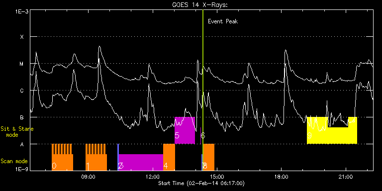 EIS Observation timeline overlay to GOES-Xray curve Code 1" 2" 40" 266" EIS Observations list for this event: STUDY ACRONYM ID DATE OBSERVED DESCRIPTION NOAA# TARGET 0 HH_Flare_162x152 | 38554 | 2014/02/02 07:17:49 | AR11967 obs | 1967 | Flare TIMELINE ID DATE OBSERVED FITS FILE XCEN (+W/-E) YCEN (+N/-S) DUR ----------------------------------------------------------------------------------------------------------------- 38554 | 2014/02/02 07:17:49.000 | eis_l0_20140202_071749.fits.gz | -216.11 | -141.94 | 4m11s 38554 | 2014/02/02 07:22:02.000 | eis_l0_20140202_072202.fits.gz | -215.49 | -142.02 | 4m11s 38554 | 2014/02/02 07:26:16.000 | eis_l0_20140202_072616.fits.gz | -214.95 | -142.02 | 4m10s 38554 | 2014/02/02 07:30:29.000 | eis_l0_20140202_073029.fits.gz | -214.33 | -141.94 | 4m11s 38554 | 2014/02/02 07:34:43.000 | eis_l0_20140202_073443.fits.gz | -213.63 | -141.79 | 4m10s 38554 | 2014/02/02 07:38:56.000 | eis_l0_20140202_073856.fits.gz | -212.94 | -141.94 | 4m11s 38554 | 2014/02/02 07:43:10.000 | eis_l0_20140202_074310.fits.gz | -212.48 | -141.94 | 4m10s 38554 | 2014/02/02 07:47:23.000 | eis_l0_20140202_074723.fits.gz | -211.78 | -142.02 | 4m10s 38554 | 2014/02/02 07:51:36.000 | eis_l0_20140202_075136.fits.gz | -211.16 | -141.94 | 4m11s 38554 | 2014/02/02 07:55:50.000 | eis_l0_20140202_075550.fits.gz | -210.54 | -141.94 | 4m10s 38554 | 2014/02/02 08:00:03.000 | eis_l0_20140202_080003.fits.gz | -209.93 | -141.94 | 4m11s 38554 | 2014/02/02 08:04:17.000 | eis_l0_20140202_080417.fits.gz | -209.31 | -141.86 | 4m10s 38554 | 2014/02/02 08:08:30.000 | eis_l0_20140202_080830.fits.gz | -208.69 | -141.94 | 4m11s 38554 | 2014/02/02 08:12:43.000 | eis_l0_20140202_081243.fits.gz | -208.00 | -141.86 | 4m11s 1 HH_Flare_162x152 | 38561 | 2014/02/02 08:52:13 | AR11967 obs | 1967 | Flare TIMELINE ID DATE OBSERVED FITS FILE XCEN (+W/-E) YCEN (+N/-S) DUR ----------------------------------------------------------------------------------------------------------------- 38561 | 2014/02/02 08:52:13.000 | eis_l0_20140202_085213.fits.gz | -202.12 | -141.63 | 4m10s 38561 | 2014/02/02 08:56:26.000 | eis_l0_20140202_085626.fits.gz | -201.59 | -141.55 | 4m11s 38561 | 2014/02/02 09:00:40.000 | eis_l0_20140202_090040.fits.gz | -200.81 | -141.55 | 4m10s 38561 | 2014/02/02 09:04:53.000 | eis_l0_20140202_090453.fits.gz | -200.27 | -141.63 | 4m11s 38561 | 2014/02/02 09:09:07.000 | eis_l0_20140202_090907.fits.gz | -199.58 | -141.48 | 4m10s 38561 | 2014/02/02 09:13:20.000 | eis_l0_20140202_091320.fits.gz | -199.04 | -141.55 | 4m11s 38561 | 2014/02/02 09:17:34.000 | eis_l0_20140202_091734.fits.gz | -198.34 | -141.48 | 4m10s 38561 | 2014/02/02 09:21:47.000 | eis_l0_20140202_092147.fits.gz | -197.72 | -141.55 | 4m10s 38561 | 2014/02/02 09:26:00.000 | eis_l0_20140202_092600.fits.gz | -197.10 | -141.55 | 4m11s 38561 | 2014/02/02 09:30:14.000 | eis_l0_20140202_093014.fits.gz | -196.49 | -141.63 | 4m10s 38561 | 2014/02/02 09:34:27.000 | eis_l0_20140202_093427.fits.gz | -195.87 | -141.55 | 4m11s 38561 | 2014/02/02 09:38:41.000 | eis_l0_20140202_093841.fits.gz | -195.25 | -141.55 | 4m10s 38561 | 2014/02/02 09:42:54.000 | eis_l0_20140202_094254.fits.gz | -194.71 | -141.48 | 4m11s 38561 | 2014/02/02 09:47:07.000 | eis_l0_20140202_094707.fits.gz | -194.01 | -141.48 | 4m11s 2 PRY_slot_contextLITE | 38464 | 2014/02/02 10:22:20 | AR 11967 obs (Focused mode obs) | 1967 | Active Region TIMELINE ID DATE OBSERVED FITS FILE XCEN (+W/-E) YCEN (+N/-S) DUR ----------------------------------------------------------------------------------------------------------------- 38464 | 2014/02/02 10:22:20.000 | eis_l0_20140202_102220.fits.gz | -203.08 | -141.24 | 2m56s 3 HPW021_VEL_240x512v1 | 38465 | 2014/02/02 10:25:27 | AR 11967 obs (Focused mode obs) | 1967 | Active Region TIMELINE ID DATE OBSERVED FITS FILE XCEN (+W/-E) YCEN (+N/-S) DUR ----------------------------------------------------------------------------------------------------------------- 38465 | 2014/02/02 10:25:27.000 | eis_l0_20140202_102527.fits.gz | -187.56 | -141.24 | 2h3m48s 4 Atlas_30 | 38466 | 2014/02/02 12:29:34 | AR 11967 obs (Focused mode obs) | | Quiet Sun TIMELINE ID DATE OBSERVED FITS FILE XCEN (+W/-E) YCEN (+N/-S) DUR ----------------------------------------------------------------------------------------------------------------- 38466 | 2014/02/02 12:29:34.000 | eis_l0_20140202_122934.fits.gz | -169.26 | -140.86 | 31m38s 5 HPW021_VEL_001x512v1 | 38467 | 2014/02/02 13:01:30 | AR 11967 obs (Focused mode obs) | | Active Region TIMELINE ID DATE OBSERVED FITS FILE XCEN (+W/-E) YCEN (+N/-S) DUR ----------------------------------------------------------------------------------------------------------------- 38467 | 2014/02/02 13:01:30.000 | eis_l0_20140202_130130.fits.gz | -164.06 | -140.63 | 56m42s 6 regcal076 | 38510 | 2014/02/02 14:13:39 | Flatfield, 1 exposure, led 100ms, ccd | | Engineering TIMELINE ID DATE OBSERVED FITS FILE XCEN (+W/-E) YCEN (+N/-S) DUR ----------------------------------------------------------------------------------------------------------------- 38510 | 2014/02/02 14:13:39.000 | eis_l0_20140202_141339.fits.gz | -138.75 | -190.40 | 1s 7 PRY_slot_context_v3 | 38511 | 2014/02/02 14:16:30 | EIS spectral atlas (AR11967) | 1967 | Active Region TIMELINE ID DATE OBSERVED FITS FILE XCEN (+W/-E) YCEN (+N/-S) DUR ----------------------------------------------------------------------------------------------------------------- 38511 | 2014/02/02 14:16:30.000 | eis_l0_20140202_141630.fits.gz | -168.09 | -140.40 | 2m56s 8 Atlas_30 | 38512 | 2014/02/02 14:19:52 | EIS spectral atlas (AR11967) | | Quiet Sun TIMELINE ID DATE OBSERVED FITS FILE XCEN (+W/-E) YCEN (+N/-S) DUR ----------------------------------------------------------------------------------------------------------------- 38512 | 2014/02/02 14:19:52.000 | eis_l0_20140202_141952.fits.gz | -152.81 | -140.63 | 31m38s 9 Flare266_Hunter01 | 38562 | 2014/02/02 19:12:35 | EIS-FT obs (AR11967) | 1967 | Flare TIMELINE 