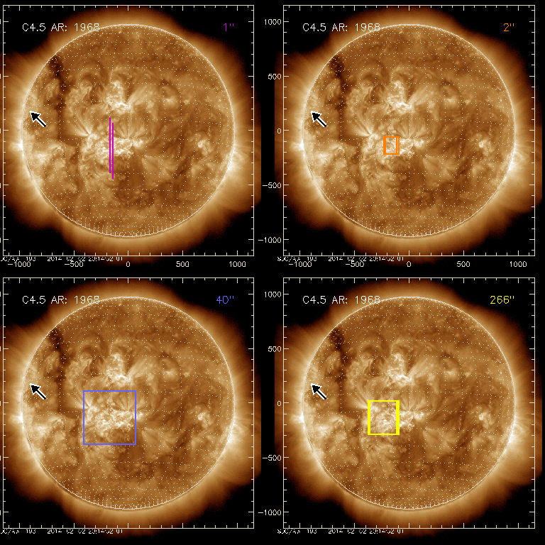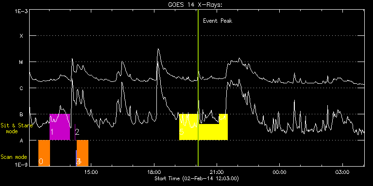 EIS Observation timeline overlay to GOES-Xray curve Code 1" 2" 40" 266" EIS Observations list for this event: STUDY ACRONYM ID DATE OBSERVED DESCRIPTION NOAA# TARGET 0 Atlas_30 | 38466 | 2014/02/02 12:29:34 | AR 11967 obs (Focused mode obs) | | Quiet Sun TIMELINE ID DATE OBSERVED FITS FILE XCEN (+W/-E) YCEN (+N/-S) DUR ----------------------------------------------------------------------------------------------------------------- 38466 | 2014/02/02 12:29:34.000 | eis_l0_20140202_122934.fits.gz | -169.26 | -140.86 | 31m38s 1 HPW021_VEL_001x512v1 | 38467 | 2014/02/02 13:01:30 | AR 11967 obs (Focused mode obs) | | Active Region TIMELINE ID DATE OBSERVED FITS FILE XCEN (+W/-E) YCEN (+N/-S) DUR ----------------------------------------------------------------------------------------------------------------- 38467 | 2014/02/02 13:01:30.000 | eis_l0_20140202_130130.fits.gz | -164.06 | -140.63 | 56m42s 2 regcal076 | 38510 | 2014/02/02 14:13:39 | Flatfield, 1 exposure, led 100ms, ccd | | Engineering TIMELINE ID DATE OBSERVED FITS FILE XCEN (+W/-E) YCEN (+N/-S) DUR ----------------------------------------------------------------------------------------------------------------- 38510 | 2014/02/02 14:13:39.000 | eis_l0_20140202_141339.fits.gz | -138.75 | -190.40 | 1s 3 PRY_slot_context_v3 | 38511 | 2014/02/02 14:16:30 | EIS spectral atlas (AR11967) | 1967 | Active Region TIMELINE ID DATE OBSERVED FITS FILE XCEN (+W/-E) YCEN (+N/-S) DUR ----------------------------------------------------------------------------------------------------------------- 38511 | 2014/02/02 14:16:30.000 | eis_l0_20140202_141630.fits.gz | -168.09 | -140.40 | 2m56s 4 Atlas_30 | 38512 | 2014/02/02 14:19:52 | EIS spectral atlas (AR11967) | | Quiet Sun TIMELINE ID DATE OBSERVED FITS FILE XCEN (+W/-E) YCEN (+N/-S) DUR ----------------------------------------------------------------------------------------------------------------- 38512 | 2014/02/02 14:19:52.000 | eis_l0_20140202_141952.fits.gz | -152.81 | -140.63 | 31m38s 5 Flare266_Hunter01 | 38562 | 2014/02/02 19:12:35 | EIS-FT obs (AR11967) | 1967 | Flare TIMELINE ID DATE OBSERVED FITS FILE XCEN (+W/-E) YCEN (+N/-S) DUR ----------------------------------------------------------------------------------------------------------------- 38562 | 2014/02/02 19:12:35.000 | eis_l0_20140202_191235.fits.gz | -240.79 | -139.39 | 56m23s 38562 | 2014/02/02 20:09:50.000 | eis_l0_20140202_200950.fits.gz | -232.21 | -139.24 | 56m22s 38562 | 2014/02/02 21:07:04.000 | eis_l0_20140202_210704.fits.gz | -223.64 | -139.24 | 23m56s : Check study information : Download file : View thumbnails For this event, also check for:
