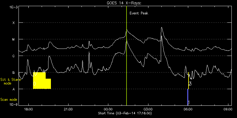 EIS Observation timeline overlay to GOES-Xray curve Code 1" 2" 40" 266" EIS Observations list for this event: STUDY ACRONYM ID DATE OBSERVED DESCRIPTION NOAA# TARGET 0 Flare266_Hunter01 | 38563 | 2014/02/03 18:21:05 | EIS-FT obs (AR11967) | 1967 | Flare TIMELINE ID DATE OBSERVED FITS FILE XCEN (+W/-E) YCEN (+N/-S) DUR ----------------------------------------------------------------------------------------------------------------- 38563 | 2014/02/03 18:21:05.000 | eis_l0_20140203_182105.fits.gz | -26.27 | -118.30 | 56m22s 38563 | 2014/02/03 19:18:20.000 | eis_l0_20140203_191820.fits.gz | -17.62 | -118.46 | 22m58s 1 PRY_slot_contextLITE | 38490 | 2014/02/04 05:57:20 | EIS-AIA alignment | 1967 | Active Region TIMELINE ID DATE OBSERVED FITS FILE XCEN (+W/-E) YCEN (+N/-S) DUR ----------------------------------------------------------------------------------------------------------------- 38490 | 2014/02/04 05:57:20.000 | eis_l0_20140204_055720.fits.gz | -15.37 | -0.50 | 2m56s 2 Alignment_266 | 38491 | 2014/02/04 06:00:35 | EIS-AIA alignment | | Quiet Sun TIMELINE ID DATE OBSERVED FITS FILE XCEN (+W/-E) YCEN (+N/-S) DUR ----------------------------------------------------------------------------------------------------------------- 38491 | 2014/02/04 06:00:35.000 | eis_l0_20140204_060035.fits.gz | -132.57 | -0.50 | 1m22s 3 XRT_synop_AIA | 38492 | 2014/02/04 06:02:42 | EIS-AIA alignment | | Quiet Sun TIMELINE ID DATE OBSERVED FITS FILE XCEN (+W/-E) YCEN (+N/-S) DUR ----------------------------------------------------------------------------------------------------------------- 38492 | 2014/02/04 06:02:42.000 | eis_l0_20140204_060242.fits.gz | -132.57 | -0.42 | 10s : Check study information : Download file : View thumbnails For this event, also check for: