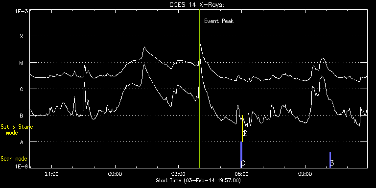 EIS Observation timeline overlay to GOES-Xray curve Code 1" 2" 40" 266" EIS Observations list for this event: STUDY ACRONYM ID DATE OBSERVED DESCRIPTION NOAA# TARGET 0 PRY_slot_contextLITE | 38490 | 2014/02/04 05:57:20 | EIS-AIA alignment | 1967 | Active Region TIMELINE ID DATE OBSERVED FITS FILE XCEN (+W/-E) YCEN (+N/-S) DUR ----------------------------------------------------------------------------------------------------------------- 38490 | 2014/02/04 05:57:20.000 | eis_l0_20140204_055720.fits.gz | -15.37 | -0.50 | 2m56s 1 Alignment_266 | 38491 | 2014/02/04 06:00:35 | EIS-AIA alignment | | Quiet Sun TIMELINE ID DATE OBSERVED FITS FILE XCEN (+W/-E) YCEN (+N/-S) DUR ----------------------------------------------------------------------------------------------------------------- 38491 | 2014/02/04 06:00:35.000 | eis_l0_20140204_060035.fits.gz | -132.57 | -0.50 | 1m22s 2 XRT_synop_AIA | 38492 | 2014/02/04 06:02:42 | EIS-AIA alignment | | Quiet Sun TIMELINE ID DATE OBSERVED FITS FILE XCEN (+W/-E) YCEN (+N/-S) DUR ----------------------------------------------------------------------------------------------------------------- 38492 | 2014/02/04 06:02:42.000 | eis_l0_20140204_060242.fits.gz | -132.57 | -0.42 | 10s 3 PRY_slot_contextLITE | 38472 | 2014/02/04 10:09:27 | AR 11967 obs (Focused mode obs) | 1967 | Active Region TIMELINE ID DATE OBSERVED FITS FILE XCEN (+W/-E) YCEN (+N/-S) DUR ----------------------------------------------------------------------------------------------------------------- 38472 | 2014/02/04 10:09:27.000 | eis_l0_20140204_100927.fits.gz | 233.06 | -120.54 | 2m56s : Check study information : Download file : View thumbnails For this event, also check for: