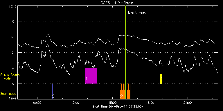 EIS Observation timeline overlay to GOES-Xray curve Code 1" 2" 40" 266" EIS Observations list for this event: STUDY ACRONYM ID DATE OBSERVED DESCRIPTION NOAA# TARGET 0 PRY_slot_contextLITE | 38472 | 2014/02/04 10:09:27 | AR 11967 obs (Focused mode obs) | 1967 | Active Region TIMELINE ID DATE OBSERVED FITS FILE XCEN (+W/-E) YCEN (+N/-S) DUR ----------------------------------------------------------------------------------------------------------------- 38472 | 2014/02/04 10:09:27.000 | eis_l0_20140204_100927.fits.gz | 233.06 | -120.54 | 2m56s 1 HPW021_VEL_001x512v1 | 38475 | 2014/02/04 12:48:37 | AR 11967 obs (Focused mode obs) | | Active Region TIMELINE ID DATE OBSERVED FITS FILE XCEN (+W/-E) YCEN (+N/-S) DUR ----------------------------------------------------------------------------------------------------------------- 38475 | 2014/02/04 12:48:37.000 | eis_l0_20140204_124837.fits.gz | 271.77 | -121.16 | 56m43s 2 HH_Flare_162x152 | 38566 | 2014/02/04 15:36:43 | AR11967 obs | | Flare TIMELINE ID DATE OBSERVED FITS FILE XCEN (+W/-E) YCEN (+N/-S) DUR ----------------------------------------------------------------------------------------------------------------- 38566 | 2014/02/04 15:36:43.000 | eis_l0_20140204_153643.fits.gz | 295.12 | -121.93 | 4m11s 38566 | 2014/02/04 15:40:56.000 | eis_l0_20140204_154056.fits.gz | 295.81 | -122.01 | 4m11s 38566 | 2014/02/04 15:45:10.000 | eis_l0_20140204_154510.fits.gz | 296.43 | -121.93 | 4m10s 38566 | 2014/02/04 15:49:23.000 | eis_l0_20140204_154923.fits.gz | 296.97 | -121.78 | 4m10s 38566 | 2014/02/04 15:53:36.000 | eis_l0_20140204_155336.fits.gz | 297.51 | -121.93 | 4m11s 38566 | 2014/02/04 15:57:50.000 | eis_l0_20140204_155750.fits.gz | 298.21 | -121.86 | 3m14s 38566 | 2014/02/04 16:10:49.000 | eis_l0_20140204_161049.fits.gz | 300.14 | -122.09 | 3m52s 38566 | 2014/02/04 16:14:44.000 | eis_l0_20140204_161444.fits.gz | 300.68 | -122.01 | 4m10s 38566 | 2014/02/04 16:18:57.000 | eis_l0_20140204_161857.fits.gz | 301.30 | -122.17 | 4m11s 38566 | 2014/02/04 16:23:10.000 | eis_l0_20140204_162310.fits.gz | 301.92 | -122.01 | 1m18s 3 Flare266_Hunter01 | 38565 | 2014/02/04 18:46:19 | EIS-FT obs (AR11967) | 1967 | Flare TIMELINE ID DATE OBSERVED FITS FILE XCEN (+W/-E) YCEN (+N/-S) DUR ----------------------------------------------------------------------------------------------------------------- 38565 | 2014/02/04 18:46:19.000 | eis_l0_20140204_184619.fits.gz | 191.02 | -122.71 | 8m40s : Check study information : Download file : View thumbnails For this event, also check for: