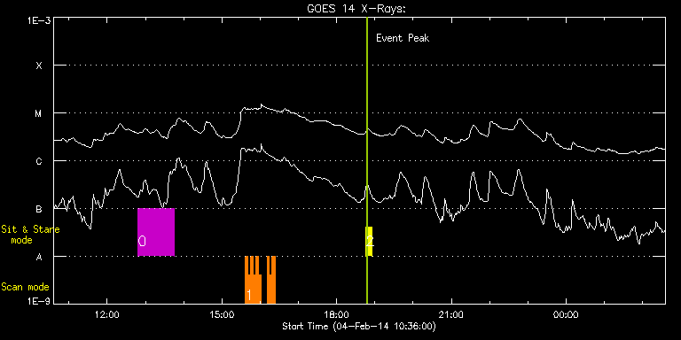EIS Observation timeline overlay to GOES-Xray curve Code 1" 2" 40" 266" EIS Observations list for this event: STUDY ACRONYM ID DATE OBSERVED DESCRIPTION NOAA# TARGET 0 HPW021_VEL_001x512v1 | 38475 | 2014/02/04 12:48:37 | AR 11967 obs (Focused mode obs) | | Active Region TIMELINE ID DATE OBSERVED FITS FILE XCEN (+W/-E) YCEN (+N/-S) DUR ----------------------------------------------------------------------------------------------------------------- 38475 | 2014/02/04 12:48:37.000 | eis_l0_20140204_124837.fits.gz | 271.77 | -121.16 | 56m43s 1 HH_Flare_162x152 | 38566 | 2014/02/04 15:36:43 | AR11967 obs | | Flare TIMELINE ID DATE OBSERVED FITS FILE XCEN (+W/-E) YCEN (+N/-S) DUR ----------------------------------------------------------------------------------------------------------------- 38566 | 2014/02/04 15:36:43.000 | eis_l0_20140204_153643.fits.gz | 295.12 | -121.93 | 4m11s 38566 | 2014/02/04 15:40:56.000 | eis_l0_20140204_154056.fits.gz | 295.81 | -122.01 | 4m11s 38566 | 2014/02/04 15:45:10.000 | eis_l0_20140204_154510.fits.gz | 296.43 | -121.93 | 4m10s 38566 | 2014/02/04 15:49:23.000 | eis_l0_20140204_154923.fits.gz | 296.97 | -121.78 | 4m10s 38566 | 2014/02/04 15:53:36.000 | eis_l0_20140204_155336.fits.gz | 297.51 | -121.93 | 4m11s 38566 | 2014/02/04 15:57:50.000 | eis_l0_20140204_155750.fits.gz | 298.21 | -121.86 | 3m14s 38566 | 2014/02/04 16:10:49.000 | eis_l0_20140204_161049.fits.gz | 300.14 | -122.09 | 3m52s 38566 | 2014/02/04 16:14:44.000 | eis_l0_20140204_161444.fits.gz | 300.68 | -122.01 | 4m10s 38566 | 2014/02/04 16:18:57.000 | eis_l0_20140204_161857.fits.gz | 301.30 | -122.17 | 4m11s 38566 | 2014/02/04 16:23:10.000 | eis_l0_20140204_162310.fits.gz | 301.92 | -122.01 | 1m18s 2 Flare266_Hunter01 | 38565 | 2014/02/04 18:46:19 | EIS-FT obs (AR11967) | 1967 | Flare TIMELINE ID DATE OBSERVED FITS FILE XCEN (+W/-E) YCEN (+N/-S) DUR ----------------------------------------------------------------------------------------------------------------- 38565 | 2014/02/04 18:46:19.000 | eis_l0_20140204_184619.fits.gz | 191.02 | -122.71 | 8m40s : Check study information : Download file : View thumbnails For this event, also check for: