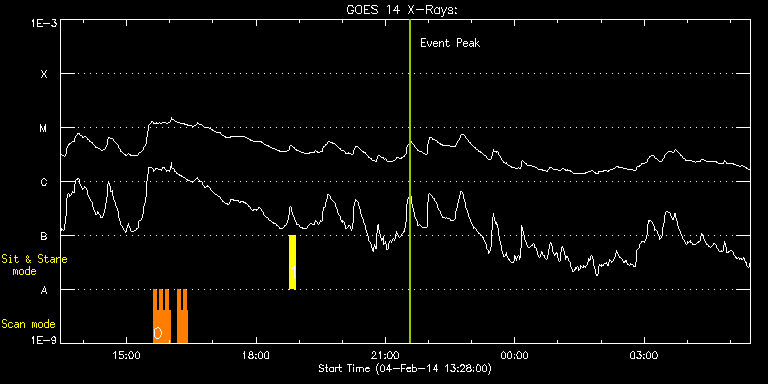 EIS Observation timeline overlay to GOES-Xray curve Code 1" 2" 40" 266" EIS Observations list for this event: STUDY ACRONYM ID DATE OBSERVED DESCRIPTION NOAA# TARGET 0 HH_Flare_162x152 | 38566 | 2014/02/04 15:36:43 | AR11967 obs | | Flare TIMELINE ID DATE OBSERVED FITS FILE XCEN (+W/-E) YCEN (+N/-S) DUR ----------------------------------------------------------------------------------------------------------------- 38566 | 2014/02/04 15:36:43.000 | eis_l0_20140204_153643.fits.gz | 295.12 | -121.93 | 4m11s 38566 | 2014/02/04 15:40:56.000 | eis_l0_20140204_154056.fits.gz | 295.81 | -122.01 | 4m11s 38566 | 2014/02/04 15:45:10.000 | eis_l0_20140204_154510.fits.gz | 296.43 | -121.93 | 4m10s 38566 | 2014/02/04 15:49:23.000 | eis_l0_20140204_154923.fits.gz | 296.97 | -121.78 | 4m10s 38566 | 2014/02/04 15:53:36.000 | eis_l0_20140204_155336.fits.gz | 297.51 | -121.93 | 4m11s 38566 | 2014/02/04 15:57:50.000 | eis_l0_20140204_155750.fits.gz | 298.21 | -121.86 | 3m14s 38566 | 2014/02/04 16:10:49.000 | eis_l0_20140204_161049.fits.gz | 300.14 | -122.09 | 3m52s 38566 | 2014/02/04 16:14:44.000 | eis_l0_20140204_161444.fits.gz | 300.68 | -122.01 | 4m10s 38566 | 2014/02/04 16:18:57.000 | eis_l0_20140204_161857.fits.gz | 301.30 | -122.17 | 4m11s 38566 | 2014/02/04 16:23:10.000 | eis_l0_20140204_162310.fits.gz | 301.92 | -122.01 | 1m18s 1 Flare266_Hunter01 | 38565 | 2014/02/04 18:46:19 | EIS-FT obs (AR11967) | 1967 | Flare TIMELINE ID DATE OBSERVED FITS FILE XCEN (+W/-E) YCEN (+N/-S) DUR ----------------------------------------------------------------------------------------------------------------- 38565 | 2014/02/04 18:46:19.000 | eis_l0_20140204_184619.fits.gz | 191.02 | -122.71 | 8m40s : Check study information : Download file : View thumbnails For this event, also check for: