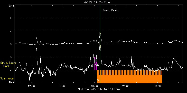 EIS Observation timeline overlay to GOES-Xray curve Code 1" 2" 40" 266" EIS Observations list for this event: STUDY ACRONYM ID DATE OBSERVED DESCRIPTION NOAA# TARGET 0 regcal071 | 38573 | 2014/02/08 18:01:12 | Dark exposures, CCD bottom rows (100s | | Engineering TIMELINE ID DATE OBSERVED FITS FILE XCEN (+W/-E) YCEN (+N/-S) DUR ----------------------------------------------------------------------------------------------------------------- 38573 | 2014/02/08 18:01:12.000 | eis_l0_20140208_180112.fits.gz | 14.51 | -305.35 | 3m22s 1 regcal072 | 38574 | 2014/02/08 18:08:42 | Dark exposures, top CCD rows (100s exp | | Engineering TIMELINE ID DATE OBSERVED FITS FILE XCEN (+W/-E) YCEN (+N/-S) DUR ----------------------------------------------------------------------------------------------------------------- 38574 | 2014/02/08 18:08:42.000 | eis_l0_20140208_180842.fits.gz | 919.16 | 18.64 | 3m22s 2 HH_Flare_162x152 | 38588 | 2014/02/08 18:15:41 | Flare mode observations. | 1967 | Flare TIMELINE ID DATE OBSERVED FITS FILE XCEN (+W/-E) YCEN (+N/-S) DUR ----------------------------------------------------------------------------------------------------------------- 38588 | 2014/02/08 18:15:41.000 | eis_l0_20140208_181541.fits.gz | 897.34 | -165.29 | 4m10s 38588 | 2014/02/08 18:19:54.000 | eis_l0_20140208_181954.fits.gz | 897.57 | -165.44 | 4m11s 38588 | 2014/02/08 18:24:08.000 | eis_l0_20140208_182408.fits.gz | 897.80 | -165.29 | 4m10s 38588 | 2014/02/08 18:28:21.000 | eis_l0_20140208_182821.fits.gz | 898.03 | -165.67 | 4m11s 38588 | 2014/02/08 18:32:35.000 | eis_l0_20140208_183235.fits.gz | 898.19 | -165.44 | 4m10s 38588 | 2014/02/08 18:36:48.000 | eis_l0_20140208_183648.fits.gz | 898.27 | -165.59 | 4m11s 38588 | 2014/02/08 18:41:02.000 | eis_l0_20140208_184102.fits.gz | 898.58 | -165.67 | 4m10s 38588 | 2014/02/08 18:45:15.000 | eis_l0_20140208_184515.fits.gz | 898.81 | -165.82 | 4m10s 38588 | 2014/02/08 18:49:28.000 | eis_l0_20140208_184928.fits.gz | 898.96 | -165.98 | 4m11s 38588 | 2014/02/08 18:53:42.000 | eis_l0_20140208_185342.fits.gz | 899.04 | -165.75 | 4m10s 38588 | 2014/02/08 18:57:55.000 | eis_l0_20140208_185755.fits.gz | 899.35 | -165.98 | 4m11s 38588 | 2014/02/08 19:02:08.000 | eis_l0_20140208_190208.fits.gz | 899.50 | -166.06 | 4m11s 38588 | 2014/02/08 19:06:22.000 | eis_l0_20140208_190622.fits.gz | 899.66 | -166.21 | 4m10s 38588 | 2014/02/08 19:10:35.000 | eis_l0_20140208_191035.fits.gz | 899.81 | -166.21 | 4m11s 38588 | 2014/02/08 19:14:49.000 | eis_l0_20140208_191449.fits.gz | 900.04 | -166.13 | 4m10s 38588 | 2014/02/08 19:19:02.000 | eis_l0_20140208_191902.fits.gz | 900.12 | -166.13 | 4m11s 38588 | 2014/02/08 19:23:16.000 | eis_l0_20140208_192316.fits.gz | 900.43 | -166.37 | 4m10s 38588 | 2014/02/08 19:27:29.000 | eis_l0_20140208_192729.fits.gz | 900.58 | -166.44 | 4m11s 38588 | 2014/02/08 19:31:43.000 | eis_l0_20140208_193143.fits.gz | 900.74 | -166.52 | 4m10s 38588 | 2014/02/08 19:35:56.000 | eis_l0_20140208_193556.fits.gz | 901.05 | -166.60 | 4m10s 38588 | 2014/02/08 19:40:09.000 | eis_l0_20140208_194009.fits.gz | 901.20 | -166.83 | 4m11s 38588 | 2014/02/08 19:44:23.000 | eis_l0_20140208_194423.fits.gz | 901.28 | -166.60 | 4m10s 38588 | 2014/02/08 19:48:36.000 | eis_l0_20140208_194836.fits.gz | 901.51 | -166.75 | 4m11s 38588 | 2014/02/08 19:52:50.000 | eis_l0_20140208_195250.fits.gz | 901.59 | -166.68 | 4m10s 38588 | 2014/02/08 19:57:03.000 | eis_l0_20140208_195703.fits.gz | 901.82 | -166.91 | 4m10s 38588 | 2014/02/08 20:01:16.000 | eis_l0_20140208_200116.fits.gz | 902.05 | -166.98 | 4m11s 38588 | 2014/02/08 20:05:30.000 | eis_l0_20140208_200530.fits.gz | 902.21 | -166.83 | 4m11s 38588 | 2014/02/08 20:09:43.000 | eis_l0_20140208_200943.fits.gz | 902.36 | -167.14 | 4m11s 38588 | 2014/02/08 20:13:57.000 | eis_l0_20140208_201357.fits.gz | 902.59 | -167.14 | 4m10s 38588 | 2014/02/08 20:18:10.000 | eis_l0_20140208_201810.fits.gz | 902.75 | -167.14 | 4m11s 38588 | 2014/02/08 20:22:23.000 | eis_l0_20140208_202223.fits.gz | 902.98 | -167.37 | 4m11s 38588 | 2014/02/08 20:26:37.000 | eis_l0_20140208_202637.fits.gz | 903.13 | -167.45 | 4m10s 38588 | 2014/02/08 20:30:50.000 | eis_l0_20140208_203050.fits.gz | 903.29 | -167.52 | 4m11s 38588 | 2014/02/08 20:35:04.000 | eis_l0_20140208_203504.fits.gz | 903.52 | -167.52 | 4m11s 38588 | 2014/02/08 20:39:17.000 | eis_l0_20140208_203917.fits.gz | 903.60 | -167.60 | 4m11s 38588 | 2014/02/08 20:43:31.000 | eis_l0_20140208_204331.fits.gz | 903.83 | -167.68 | 4m10s 38588 | 2014/02/08 20:47:44.000 | eis_l0_20140208_204744.fits.gz | 903.98 | -167.76 | 4m11s 38588 | 2014/02/08 20:51:57.000 | eis_l0_20140208_205157.fits.gz | 904.14 | -167.76 | 4m11s 38588 | 2014/02/08 20:56:11.000 | eis_l0_20140208_205611.fits.gz | 904.37 | -167.83 | 4m10s 38588 | 2014/02/08 21:00:24.000 | eis_l0_20140208_210024.fits.gz | 904.60 | -167.91 | 4m11s 38588 | 2014/02/08 21:04:37.000 | eis_l0_20140208_210437.fits.gz | 904.68 | -168.07 | 4m11s 38588 | 2014/02/08 21:08:51.000 | eis_l0_20140208_210851.fits.gz | 904.91 | -167.99 | 4m11s 38588 | 2014/02/08 21:13:05.000 | eis_l0_20140208_211305.fits.gz | 905.06 | -168.14 | 4m10s 38588 | 2014/02/08 21:17:18.000 | eis_l0_20140208_211718.fits.gz | 905.22 | -168.22 | 4m10s 38588 | 2014/02/08 21:21:31.000 | eis_l0_20140208_212131.fits.gz | 905.30 | -168.22 | 4m11s 38588 | 2014/02/08 21:25:45.000 | eis_l0_20140208_212545.fits.gz | 905.53 | -168.38 | 4m10s 38588 | 2014/02/08 21:29:58.000 | eis_l0_20140208_212958.fits.gz | 905.68 | -168.38 | 4m11s 38588 | 2014/02/08 21:34:12.000 | eis_l0_20140208_213412.fits.gz | 905.84 | -168.45 | 4m10s 38588 | 2014/02/08 21:38:25.000 | eis_l0_20140208_213825.fits.gz | 906.07 | -168.38 | 4m11s 38588 | 2014/02/08 21:42:38.000 | eis_l0_20140208_214238.fits.gz | 906.22 | -168.61 | 4m11s 38588 | 2014/02/08 21:46:52.000 | eis_l0_20140208_214652.fits.gz | 906.45 | -168.76 | 4m11s 38588 | 2014/02/08 21:51:05.000 | eis_l0_20140208_215105.fits.gz | 906.53 | -168.84 | 4m11s 38588 | 2014/02/08 21:55:19.000 | eis_l0_
