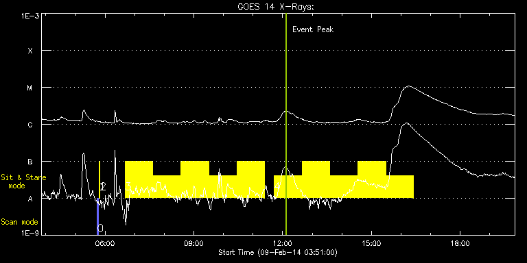 EIS Observation timeline overlay to GOES-Xray curve Code 1" 2" 40" 266" EIS Observations list for this event: STUDY ACRONYM ID DATE OBSERVED DESCRIPTION NOAA# TARGET 0 PRY_slot_contextLITE | 38575 | 2014/02/09 05:44:04 | Change of EIS pointing and alignment w | 1971 | Active Region TIMELINE ID DATE OBSERVED FITS FILE XCEN (+W/-E) YCEN (+N/-S) DUR ----------------------------------------------------------------------------------------------------------------- 38575 | 2014/02/09 05:44:04.000 | eis_l0_20140209_054404.fits.gz | -15.29 | -0.42 | 2m56s 1 Alignment_266 | 38576 | 2014/02/09 05:47:18 | Change of EIS pointing and alignment w | 1971 | Quiet Sun TIMELINE ID DATE OBSERVED FITS FILE XCEN (+W/-E) YCEN (+N/-S) DUR ----------------------------------------------------------------------------------------------------------------- 38576 | 2014/02/09 05:47:18.000 | eis_l0_20140209_054718.fits.gz | -132.57 | -0.58 | 1m22s 2 XRT_synop_AIA | 38577 | 2014/02/09 05:49:26 | Change of EIS pointing and alignment w | 1971 | Quiet Sun TIMELINE ID DATE OBSERVED FITS FILE XCEN (+W/-E) YCEN (+N/-S) DUR ----------------------------------------------------------------------------------------------------------------- 38577 | 2014/02/09 05:49:26.000 | eis_l0_20140209_054926.fits.gz | -132.49 | -0.58 | 10s 3 FLARE266_TEST1 | 38589 | 2014/02/09 06:40:13 | Flare Hunting | 1967 | Active Region TIMELINE ID DATE OBSERVED FITS FILE XCEN (+W/-E) YCEN (+N/-S) DUR ----------------------------------------------------------------------------------------------------------------- 38589 | 2014/02/09 06:40:13.000 | eis_l0_20140209_064013.fits.gz | 793.02 | -196.32 | 56m1s 38589 | 2014/02/09 07:37:05.000 | eis_l0_20140209_073705.fits.gz | 793.02 | -196.24 | 56m 38589 | 2014/02/09 08:33:57.000 | eis_l0_20140209_083357.fits.gz | 792.94 | -196.24 | 56m1s 38589 | 2014/02/09 09:30:49.000 | eis_l0_20140209_093049.fits.gz | 792.94 | -196.17 | 56m1s 38589 | 2014/02/09 10:27:42.000 | eis_l0_20140209_102742.fits.gz | 793.02 | -196.24 | 55m59s 4 FLARE266_TEST1 | 38590 | 2014/02/09 11:42:13 | Flare Hunting | 1967 | Active Region TIMELINE ID DATE OBSERVED FITS FILE XCEN (+W/-E) YCEN (+N/-S) DUR ----------------------------------------------------------------------------------------------------------------- 38590 | 2014/02/09 11:42:13.000 | eis_l0_20140209_114213.fits.gz | 793.02 | -196.24 | 56m1s 38590 | 2014/02/09 12:39:06.000 | eis_l0_20140209_123906.fits.gz | 793.02 | -196.17 | 55m59s 38590 | 2014/02/09 13:35:57.000 | eis_l0_20140209_133557.fits.gz | 793.02 | -196.32 | 56m 38590 | 2014/02/09 14:32:49.000 | eis_l0_20140209_143249.fits.gz | 793.02 | -196.24 | 56m 38590 | 2014/02/09 15:29:41.000 | eis_l0_20140209_152941.fits.gz | 793.02 | -196.24 | 56m1s : Check study information : Download file : View thumbnails For this event, also check for: