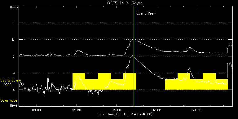 EIS Observation timeline overlay to GOES-Xray curve Code 1" 2" 40" 266" EIS Observations list for this event: STUDY ACRONYM ID DATE OBSERVED DESCRIPTION NOAA# TARGET 0 FLARE266_TEST1 | 38590 | 2014/02/09 11:42:13 | Flare Hunting | 1967 | Active Region TIMELINE ID DATE OBSERVED FITS FILE XCEN (+W/-E) YCEN (+N/-S) DUR ----------------------------------------------------------------------------------------------------------------- 38590 | 2014/02/09 11:42:13.000 | eis_l0_20140209_114213.fits.gz | 793.02 | -196.24 | 56m1s 38590 | 2014/02/09 12:39:06.000 | eis_l0_20140209_123906.fits.gz | 793.02 | -196.17 | 55m59s 38590 | 2014/02/09 13:35:57.000 | eis_l0_20140209_133557.fits.gz | 793.02 | -196.32 | 56m 38590 | 2014/02/09 14:32:49.000 | eis_l0_20140209_143249.fits.gz | 793.02 | -196.24 | 56m 38590 | 2014/02/09 15:29:41.000 | eis_l0_20140209_152941.fits.gz | 793.02 | -196.24 | 56m1s 1 FLARE266_TEST1 | 38591 | 2014/02/09 18:36:13 | Flare Hunting | 1967 | Active Region TIMELINE ID DATE OBSERVED FITS FILE XCEN (+W/-E) YCEN (+N/-S) DUR ----------------------------------------------------------------------------------------------------------------- 38591 | 2014/02/09 18:36:13.000 | eis_l0_20140209_183613.fits.gz | 793.02 | -196.17 | 56m 38591 | 2014/02/09 19:33:05.000 | eis_l0_20140209_193305.fits.gz | 793.02 | -196.32 | 56m 38591 | 2014/02/09 20:29:57.000 | eis_l0_20140209_202957.fits.gz | 793.02 | -196.32 | 56m 38591 | 2014/02/09 21:26:49.000 | eis_l0_20140209_212649.fits.gz | 793.02 | -196.32 | 56m 38591 | 2014/02/09 22:23:41.000 | eis_l0_20140209_222341.fits.gz | 793.02 | -196.40 | 56m : Check study information : Download file : View thumbnails For this event, also check for: