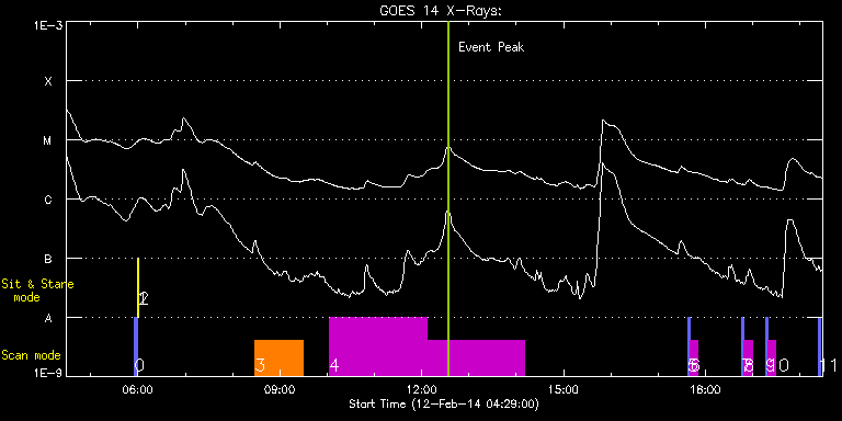 EIS Observation timeline overlay to GOES-Xray curve Code 1" 2" 40" 266" EIS Observations list for this event: STUDY ACRONYM ID DATE OBSERVED DESCRIPTION NOAA# TARGET 0 PRY_slot_contextLITE | 38593 | 2014/02/12 05:55:50 | Change of EIS pointing and alignment w | 1974 | Active Region TIMELINE ID DATE OBSERVED FITS FILE XCEN (+W/-E) YCEN (+N/-S) DUR ----------------------------------------------------------------------------------------------------------------- 38593 | 2014/02/12 05:55:50.000 | eis_l0_20140212_055550.fits.gz | -15.21 | -0.42 | 2m56s 1 Alignment_266 | 38594 | 2014/02/12 05:59:04 | Change of EIS pointing and alignment w | 1974 | Quiet Sun TIMELINE ID DATE OBSERVED FITS FILE XCEN (+W/-E) YCEN (+N/-S) DUR ----------------------------------------------------------------------------------------------------------------- 38594 | 2014/02/12 05:59:04.000 | eis_l0_20140212_055904.fits.gz | -132.64 | -0.50 | 1m22s 2 XRT_synop_AIA | 38595 | 2014/02/12 06:01:12 | Change of EIS pointing and alignment w | 1974 | Quiet Sun TIMELINE ID DATE OBSERVED FITS FILE XCEN (+W/-E) YCEN (+N/-S) DUR ----------------------------------------------------------------------------------------------------------------- 38595 | 2014/02/12 06:01:12.000 | eis_l0_20140212_060112.fits.gz | -132.57 | -0.50 | 10s 3 Atlas_60 | 38643 | 2014/02/12 08:28:20 | Full CCD spectrum of AR. | 1976 | Quiet Sun TIMELINE ID DATE OBSERVED FITS FILE XCEN (+W/-E) YCEN (+N/-S) DUR ----------------------------------------------------------------------------------------------------------------- 38643 | 2014/02/12 08:28:20.000 | eis_l0_20140212_082820.fits.gz | -598.58 | -161.65 | 1h1m40s 4 HPW021_VEL_240x512v1 | 38644 | 2014/02/12 10:02:27 | Raster scan of AR. | 1976 | Active Region TIMELINE ID DATE OBSERVED FITS FILE XCEN (+W/-E) YCEN (+N/-S) DUR ----------------------------------------------------------------------------------------------------------------- 38644 | 2014/02/12 10:02:27.000 | eis_l0_20140212_100227.fits.gz | -587.70 | -160.49 | 2h3m47s 38644 | 2014/02/12 12:06:21.000 | eis_l0_20140212_120621.fits.gz | -573.26 | -159.03 | 2h3m48s 5 PRY_slot_contextLITE | 38599 | 2014/02/12 17:37:33 | Synoptic SOT Irradiance Scans | | Active Region TIMELINE ID DATE OBSERVED FITS FILE XCEN (+W/-E) YCEN (+N/-S) DUR ----------------------------------------------------------------------------------------------------------------- 38599 | 2014/02/12 17:37:33.000 | eis_l0_20140212_173733.fits.gz | -9880.70 | -9941.20 | 2m57s 6 SK_DEEP_5x512_SLIT1 | 38600 | 2014/02/12 17:40:41 | Synoptic SOT Irradiance Scans | | Quiet Sun TIMELINE ID DATE OBSERVED FITS FILE XCEN (+W/-E) YCEN (+N/-S) DUR ----------------------------------------------------------------------------------------------------------------- 38600 | 2014/02/12 17:40:41.000 | eis_l0_20140212_174041.fits.gz | -9865.72 | -9941.20 | 10m8s 7 PRY_slot_contextLITE | 38601 | 2014/02/12 18:46:03 | Synoptic SOT Irradiance Scans | | Active Region TIMELINE ID DATE OBSERVED FITS FILE XCEN (+W/-E) YCEN (+N/-S) DUR ----------------------------------------------------------------------------------------------------------------- 38601 | 2014/02/12 18:46:03.000 | eis_l0_20140212_184603.fits.gz | -26.36 | -843.52 | 2m57s 8 SK_DEEP_5x512_SLIT1 | 38602 | 2014/02/12 18:49:11 | Synoptic SOT Irradiance Scans | | Quiet Sun TIMELINE ID DATE OBSERVED FITS FILE XCEN (+W/-E) YCEN (+N/-S) DUR ----------------------------------------------------------------------------------------------------------------- 38602 | 2014/02/12 18:49:11.000 | eis_l0_20140212_184911.fits.gz | -11.38 | -843.52 | 10m8s 9 PRY_slot_contextLITE | 38603 | 2014/02/12 19:16:04 | Synoptic SOT Irradiance Scans | | Active Region TIMELINE ID DATE OBSERVED FITS FILE XCEN (+W/-E) YCEN (+N/-S) DUR ----------------------------------------------------------------------------------------------------------------- 38603 | 2014/02/12 19:16:04.000 | eis_l0_20140212_191604.fits.gz | -26.28 | -743.41 | 2m56s 10 SK_DEEP_5x512_SLIT1 | 38604 | 2014/02/12 19:19:12 | Synoptic SOT Irradiance Scans | | Quiet Sun TIMELINE ID DATE OBSERVED FITS FILE XCEN (+W/-E) YCEN (+N/-S) DUR ----------------------------------------------------------------------------------------------------------------- 38604 | 2014/02/12 19:19:12.000 | eis_l0_20140212_191912.fits.gz | -11.46 | -743.41 | 10m7s 11 PRY_slot_contextLITE | 38605 | 2014/02/12 20:23:03 | Synoptic SOT Irradiance Scans | | Active Region TIMELINE ID DATE OBSERVED FITS FILE XCEN (+W/-E) YCEN (+N/-S) DUR ----------------------------------------------------------------------------------------------------------------- 38605 | 2014/02/12 20:23:03.000 | eis_l0_20140212_202303.fits.gz | -26.36 | -643.29 | 2m56s : Check study information : Download file : View thumbnails For this event, also check for: