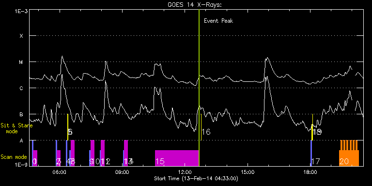 EIS Observation timeline overlay to GOES-Xray curve Code 1" 2" 40" 266" EIS Observations list for this event: STUDY ACRONYM ID DATE OBSERVED DESCRIPTION NOAA# TARGET 0 PRY_slot_contextLITE | 38627 | 2014/02/13 04:41:33 | Synoptic SOT Irradiance Scans | | Active Region TIMELINE ID DATE OBSERVED FITS FILE XCEN (+W/-E) YCEN (+N/-S) DUR ----------------------------------------------------------------------------------------------------------------- 38627 | 2014/02/13 04:41:33.000 | eis_l0_20140213_044133.fits.gz | -26.36 | 446.75 | 2m56s 1 SK_DEEP_5x512_SLIT1 | 38628 | 2014/02/13 04:44:41 | Synoptic SOT Irradiance Scans | | Quiet Sun TIMELINE ID DATE OBSERVED FITS FILE XCEN (+W/-E) YCEN (+N/-S) DUR ----------------------------------------------------------------------------------------------------------------- 38628 | 2014/02/13 04:44:41.000 | eis_l0_20140213_044441.fits.gz | -11.46 | 446.67 | 10m8s 2 PRY_slot_contextLITE | 38629 | 2014/02/13 05:49:03 | Synoptic SOT Irradiance Scans | | Active Region TIMELINE ID DATE OBSERVED FITS FILE XCEN (+W/-E) YCEN (+N/-S) DUR ----------------------------------------------------------------------------------------------------------------- 38629 | 2014/02/13 05:49:03.000 | eis_l0_20140213_054903.fits.gz | -26.44 | 546.32 | 2m57s 3 SK_DEEP_5x512_SLIT1 | 38630 | 2014/02/13 05:52:11 | Synoptic SOT Irradiance Scans | | Quiet Sun TIMELINE ID DATE OBSERVED FITS FILE XCEN (+W/-E) YCEN (+N/-S) DUR ----------------------------------------------------------------------------------------------------------------- 38630 | 2014/02/13 05:52:11.000 | eis_l0_20140213_055211.fits.gz | -11.46 | 546.55 | 10m8s 4 PRY_slot_contextLITE | 38596 | 2014/02/13 06:19:04 | Change of EIS pointing and alignment w | 1974 | Active Region TIMELINE ID DATE OBSERVED FITS FILE XCEN (+W/-E) YCEN (+N/-S) DUR ----------------------------------------------------------------------------------------------------------------- 38596 | 2014/02/13 06:19:04.000 | eis_l0_20140213_061904.fits.gz | -15.21 | -0.58 | 2m56s 5 Alignment_266 | 38597 | 2014/02/13 06:22:19 | Change of EIS pointing and alignment w | | Quiet Sun TIMELINE ID DATE OBSERVED FITS FILE XCEN (+W/-E) YCEN (+N/-S) DUR ----------------------------------------------------------------------------------------------------------------- 38597 | 2014/02/13 06:22:19.000 | eis_l0_20140213_062219.fits.gz | -132.57 | -0.50 | 1m22s 6 XRT_synop_AIA | 38598 | 2014/02/13 06:24:26 | Change of EIS pointing and alignment w | | Quiet Sun TIMELINE ID DATE OBSERVED FITS FILE XCEN (+W/-E) YCEN (+N/-S) DUR ----------------------------------------------------------------------------------------------------------------- 38598 | 2014/02/13 06:24:26.000 | eis_l0_20140213_062426.fits.gz | -132.49 | -0.50 | 10s 7 PRY_slot_contextLITE | 38631 | 2014/02/13 06:28:56 | Synoptic SOT Irradiance Scans | | Active Region TIMELINE ID DATE OBSERVED FITS FILE XCEN (+W/-E) YCEN (+N/-S) DUR ----------------------------------------------------------------------------------------------------------------- 38631 | 2014/02/13 06:28:56.000 | eis_l0_20140213_062856.fits.gz | -26.44 | 646.59 | 2m57s 8 SK_DEEP_5x512_SLIT1 | 38632 | 2014/02/13 06:32:04 | Synoptic SOT Irradiance Scans | | Quiet Sun TIMELINE ID DATE OBSERVED FITS FILE XCEN (+W/-E) YCEN (+N/-S) DUR ----------------------------------------------------------------------------------------------------------------- 38632 | 2014/02/13 06:32:04.000 | eis_l0_20140213_063204.fits.gz | -11.46 | 646.43 | 10m8s 9 PRY_slot_contextLITE | 38633 | 2014/02/13 07:26:03 | Synoptic SOT Irradiance Scans | | Active Region TIMELINE ID DATE OBSERVED FITS FILE XCEN (+W/-E) YCEN (+N/-S) DUR ----------------------------------------------------------------------------------------------------------------- 38633 | 2014/02/13 07:26:03.000 | eis_l0_20140213_072603.fits.gz | -26.36 | 746.47 | 2m56s 10 SK_DEEP_5x512_SLIT1 | 38634 | 2014/02/13 07:29:11 | Synoptic SOT Irradiance Scans | | Quiet Sun TIMELINE ID DATE OBSERVED FITS FILE XCEN (+W/-E) YCEN (+N/-S) DUR ----------------------------------------------------------------------------------------------------------------- 38634 | 2014/02/13 07:29:11.000 | eis_l0_20140213_072911.fits.gz | -11.46 | 746.70 | 10m8s 11 PRY_slot_contextLITE | 38635 | 2014/02/13 07:56:03 | Synoptic SOT Irradiance Scans | | Active Region TIMELINE ID DATE OBSERVED FITS FILE XCEN (+W/-E) YCEN (+N/-S) DUR ----------------------------------------------------------------------------------------------------------------- 38635 | 2014/02/13 07:56:03.000 | eis_l0_20140213_075603.fits.gz | -26.28 | 846.81 | 2m56s 12 SK_DEEP_5x512_SLIT1 | 38636 | 2014/02/13 07:59:11 | Synoptic SOT Irradiance Scans | | Quiet Sun TIMELINE ID DATE OBSERVED FITS FILE XCEN (+W/-E) YCEN (+N/-S) DUR ----------------------------------------------------------------------------------------------------------------- 38636 | 2014/02/13 07:59:11.000 | eis_l0_20140213_075911.fits.gz | -11.46 | 846.74 | 10m8s 13 PRY_slot_contextLITE | 38637 | 2014/02/13 09:02:33 | Synoptic SOT Irradiance Scans | | Active Region TIMELINE ID DATE OBSERVED FITS FILE XCEN (+W/-E) YCEN (+N/-S) DUR ----------------------------------------------------------------------------------------------------------------- 38637 | 2014/02/13 09:02:33.000 | eis_l0_20140213_090233.fits.gz | -26.36 | 946.46 | 2m56s 14 SK_DEEP_5x512_SLIT1 | 38638 | 2014/02/13 09:05:40 | Synoptic SOT Irradiance Scans | | Quiet Sun TIMELINE ID DATE OBSERVED FITS FILE XCEN (+W/-E) YCEN (+N/-S) DUR ----------------------------------------------------------------------------------------------------------------- 38638 | 2014/02/13 09:05:40.000 | eis_l0_20140213_090540.fits.gz | -11.38 | 946.46 | 10m8s 15 HPW021_VEL_240x512v1 | 38658 | 2014/02/13 10:34:11 | Raster scan during flare observations | 1974 | Active Region TIMELINE ID DATE OBSERVED FITS FILE XCEN (+W/-E) YCEN (+N/-S) DUR -----------------------------------------------------------