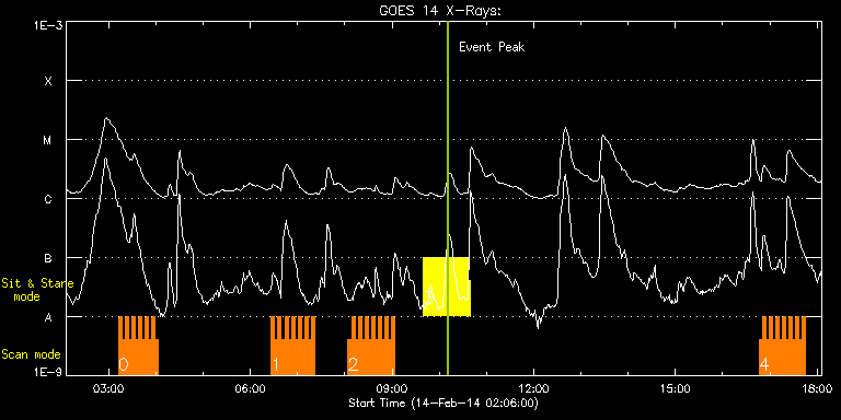 EIS Observation timeline overlay to GOES-Xray curve Code 1" 2" 40" 266" EIS Observations list for this event: STUDY ACRONYM ID DATE OBSERVED DESCRIPTION NOAA# TARGET 0 HH_Flare_162x152 | 38665 | 2014/02/14 03:12:13 | Flare mode observations. | | Flare TIMELINE ID DATE OBSERVED FITS FILE XCEN (+W/-E) YCEN (+N/-S) DUR ----------------------------------------------------------------------------------------------------------------- 38665 | 2014/02/14 03:12:13.000 | eis_l0_20140214_031213.fits.gz | 388.74 | -96.92 | 4m10s 38665 | 2014/02/14 03:16:26.000 | eis_l0_20140214_031626.fits.gz | 389.35 | -96.84 | 4m11s 38665 | 2014/02/14 03:20:40.000 | eis_l0_20140214_032040.fits.gz | 389.82 | -96.92 | 4m10s 38665 | 2014/02/14 03:24:53.000 | eis_l0_20140214_032453.fits.gz | 390.44 | -96.99 | 4m11s 38665 | 2014/02/14 03:29:07.000 | eis_l0_20140214_032907.fits.gz | 391.13 | -97.07 | 4m10s 38665 | 2014/02/14 03:33:20.000 | eis_l0_20140214_033320.fits.gz | 391.67 | -97.15 | 4m10s 38665 | 2014/02/14 03:37:33.000 | eis_l0_20140214_033733.fits.gz | 392.14 | -97.07 | 4m11s 38665 | 2014/02/14 03:41:47.000 | eis_l0_20140214_034147.fits.gz | 392.83 | -97.15 | 4m10s 38665 | 2014/02/14 03:46:00.000 | eis_l0_20140214_034600.fits.gz | 393.45 | -97.30 | 4m11s 38665 | 2014/02/14 03:50:14.000 | eis_l0_20140214_035014.fits.gz | 393.99 | -97.15 | 4m11s 38665 | 2014/02/14 03:54:27.000 | eis_l0_20140214_035427.fits.gz | 394.53 | -97.38 | 4m11s 38665 | 2014/02/14 03:58:41.000 | eis_l0_20140214_035841.fits.gz | 395.15 | -97.30 | 4m11s 1 HH_Flare_162x152 | 38667 | 2014/02/14 06:26:43 | Flare mode observations. | | Flare TIMELINE ID DATE OBSERVED FITS FILE XCEN (+W/-E) YCEN (+N/-S) DUR ----------------------------------------------------------------------------------------------------------------- 38667 | 2014/02/14 06:26:43.000 | eis_l0_20140214_062643.fits.gz | 415.54 | -98.31 | 4m10s 38667 | 2014/02/14 06:30:56.000 | eis_l0_20140214_063056.fits.gz | 416.08 | -98.38 | 4m11s 38667 | 2014/02/14 06:35:10.000 | eis_l0_20140214_063510.fits.gz | 416.62 | -98.31 | 4m10s 38667 | 2014/02/14 06:39:23.000 | eis_l0_20140214_063923.fits.gz | 417.32 | -98.54 | 4m10s 38667 | 2014/02/14 06:43:36.000 | eis_l0_20140214_064336.fits.gz | 417.86 | -98.54 | 4m11s 38667 | 2014/02/14 06:47:50.000 | eis_l0_20140214_064750.fits.gz | 418.40 | -98.38 | 4m10s 38667 | 2014/02/14 06:52:03.000 | eis_l0_20140214_065203.fits.gz | 419.02 | -98.62 | 4m11s 38667 | 2014/02/14 06:56:17.000 | eis_l0_20140214_065617.fits.gz | 419.56 | -98.54 | 4m10s 38667 | 2014/02/14 07:00:30.000 | eis_l0_20140214_070030.fits.gz | 420.18 | -98.69 | 4m11s 38667 | 2014/02/14 07:04:44.000 | eis_l0_20140214_070444.fits.gz | 420.72 | -98.54 | 4m10s 38667 | 2014/02/14 07:08:57.000 | eis_l0_20140214_070857.fits.gz | 421.26 | -98.77 | 4m11s 38667 | 2014/02/14 07:13:10.000 | eis_l0_20140214_071310.fits.gz | 421.95 | -98.77 | 4m11s 38667 | 2014/02/14 07:17:24.000 | eis_l0_20140214_071724.fits.gz | 422.42 | -98.69 | 4m11s 2 HH_Flare_162x152 | 38668 | 2014/02/14 08:04:13 | Flare mode observations. | | Flare TIMELINE ID DATE OBSERVED FITS FILE XCEN (+W/-E) YCEN (+N/-S) DUR ----------------------------------------------------------------------------------------------------------------- 38668 | 2014/02/14 08:04:13.000 | eis_l0_20140214_080413.fits.gz | 428.83 | -99.00 | 4m11s 38668 | 2014/02/14 08:08:27.000 | eis_l0_20140214_080827.fits.gz | 429.45 | -99.00 | 4m10s 38668 | 2014/02/14 08:12:40.000 | eis_l0_20140214_081240.fits.gz | 429.99 | -99.16 | 4m11s 38668 | 2014/02/14 08:16:54.000 | eis_l0_20140214_081654.fits.gz | 430.60 | -99.08 | 4m10s 38668 | 2014/02/14 08:21:07.000 | eis_l0_20140214_082107.fits.gz | 431.14 | -99.16 | 4m11s 38668 | 2014/02/14 08:25:21.000 | eis_l0_20140214_082521.fits.gz | 431.69 | -99.08 | 4m10s 38668 | 2014/02/14 08:29:34.000 | eis_l0_20140214_082934.fits.gz | 432.30 | -99.23 | 4m10s 38668 | 2014/02/14 08:33:47.000 | eis_l0_20140214_083347.fits.gz | 432.85 | -99.31 | 4m11s 38668 | 2014/02/14 08:38:01.000 | eis_l0_20140214_083801.fits.gz | 433.39 | -99.31 | 4m10s 38668 | 2014/02/14 08:42:14.000 | eis_l0_20140214_084214.fits.gz | 434.00 | -99.31 | 4m11s 38668 | 2014/02/14 08:46:28.000 | eis_l0_20140214_084628.fits.gz | 434.54 | -99.47 | 4m10s 38668 | 2014/02/14 08:50:41.000 | eis_l0_20140214_085041.fits.gz | 435.16 | -99.47 | 4m10s 38668 | 2014/02/14 08:54:54.000 | eis_l0_20140214_085454.fits.gz | 435.70 | -99.31 | 4m11s 38668 | 2014/02/14 08:59:08.000 | eis_l0_20140214_085908.fits.gz | 436.32 | -99.54 | 4m10s 3 Flare266_Hunter01 | 38666 | 2014/02/14 09:39:33 | Flare Hunting | 1974 | Flare TIMELINE ID DATE OBSERVED FITS FILE XCEN (+W/-E) YCEN (+N/-S) DUR ----------------------------------------------------------------------------------------------------------------- 38666 | 2014/02/14 09:39:33.000 | eis_l0_20140214_093933.fits.gz | 306.05 | -120.85 | 56m23s 38666 | 2014/02/14 10:36:48.000 | eis_l0_20140214_103648.fits.gz | 313.77 | -121.32 | 2m57s 4 HH_Flare_162x152 | 38669 | 2014/02/14 16:46:13 | Flare mode observations. | | Flare TIMELINE ID DATE OBSERVED FITS FILE XCEN (+W/-E) YCEN (+N/-S) DUR ----------------------------------------------------------------------------------------------------------------- 38669 | 2014/02/14 16:46:13.000 | eis_l0_20140214_164613.fits.gz | 498.27 | -103.48 | 4m11s 38669 | 2014/02/14 16:50:26.000 | eis_l0_20140214_165026.fits.gz | 498.81 | -103.40 | 4m11s 38669 | 2014/02/14 16:54:40.000 | eis_l0_20140214_165440.fits.gz | 499.36 | -103.56 | 4m10s 38669 | 2014/02/14 16:58:53.000 | eis_l0_20140214_165853.fits.gz | 499.90 | -103.48 | 4m11s 38669 | 2014/02/14 17:03:07.000 | eis_l0_20140214_170307.fits.gz | 500.44 | -103.56 | 4m11s 38669 | 2014/02/14 17:07:20.000 | eis_l0_20140214_170720.fits.gz | 500.98 | -103.64 | 4m11s 38669 | 2014/02/14 17:11:33.000 | eis_l0_20140214_171133.fits.gz | 501.52 | -103.64 | 4m11s 38669 | 2014/02/14 17:15:47.000 | eis_l0_20140214_171547.fits.gz | 502.06 | -103.71 | 4m11s 38669 | 2014/02/14 17:20:00.000 | eis_l