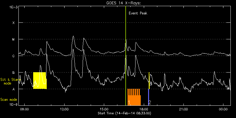 EIS Observation timeline overlay to GOES-Xray curve Code 1" 2" 40" 266" EIS Observations list for this event: STUDY ACRONYM ID DATE OBSERVED DESCRIPTION NOAA# TARGET 0 Flare266_Hunter01 | 38666 | 2014/02/14 09:39:33 | Flare Hunting | 1974 | Flare TIMELINE ID DATE OBSERVED FITS FILE XCEN (+W/-E) YCEN (+N/-S) DUR ----------------------------------------------------------------------------------------------------------------- 38666 | 2014/02/14 09:39:33.000 | eis_l0_20140214_093933.fits.gz | 306.05 | -120.85 | 56m23s 38666 | 2014/02/14 10:36:48.000 | eis_l0_20140214_103648.fits.gz | 313.77 | -121.32 | 2m57s 1 HH_Flare_162x152 | 38669 | 2014/02/14 16:46:13 | Flare mode observations. | | Flare TIMELINE ID DATE OBSERVED FITS FILE XCEN (+W/-E) YCEN (+N/-S) DUR ----------------------------------------------------------------------------------------------------------------- 38669 | 2014/02/14 16:46:13.000 | eis_l0_20140214_164613.fits.gz | 498.27 | -103.48 | 4m11s 38669 | 2014/02/14 16:50:26.000 | eis_l0_20140214_165026.fits.gz | 498.81 | -103.40 | 4m11s 38669 | 2014/02/14 16:54:40.000 | eis_l0_20140214_165440.fits.gz | 499.36 | -103.56 | 4m10s 38669 | 2014/02/14 16:58:53.000 | eis_l0_20140214_165853.fits.gz | 499.90 | -103.48 | 4m11s 38669 | 2014/02/14 17:03:07.000 | eis_l0_20140214_170307.fits.gz | 500.44 | -103.56 | 4m11s 38669 | 2014/02/14 17:07:20.000 | eis_l0_20140214_170720.fits.gz | 500.98 | -103.64 | 4m11s 38669 | 2014/02/14 17:11:33.000 | eis_l0_20140214_171133.fits.gz | 501.52 | -103.64 | 4m11s 38669 | 2014/02/14 17:15:47.000 | eis_l0_20140214_171547.fits.gz | 502.06 | -103.71 | 4m11s 38669 | 2014/02/14 17:20:00.000 | eis_l0_20140214_172000.fits.gz | 502.60 | -103.48 | 4m11s 38669 | 2014/02/14 17:24:14.000 | eis_l0_20140214_172414.fits.gz | 503.14 | -103.79 | 4m10s 38669 | 2014/02/14 17:28:27.000 | eis_l0_20140214_172827.fits.gz | 503.68 | -103.64 | 4m11s 38669 | 2014/02/14 17:32:41.000 | eis_l0_20140214_173241.fits.gz | 504.30 | -103.64 | 4m10s 38669 | 2014/02/14 17:36:54.000 | eis_l0_20140214_173654.fits.gz | 504.76 | -103.71 | 4m11s 38669 | 2014/02/14 17:41:07.000 | eis_l0_20140214_174107.fits.gz | 505.38 | -103.95 | 4m11s 2 PRY_slot_contextLITE | 38655 | 2014/02/14 18:20:20 | Change of EIS pointing and alignment w | 1976 | Active Region TIMELINE ID DATE OBSERVED FITS FILE XCEN (+W/-E) YCEN (+N/-S) DUR ----------------------------------------------------------------------------------------------------------------- 38655 | 2014/02/14 18:20:20.000 | eis_l0_20140214_182020.fits.gz | -15.21 | -0.42 | 2m56s 3 Alignment_266 | 38656 | 2014/02/14 18:23:34 | Change of EIS pointing and alignment w | 1976 | Quiet Sun TIMELINE ID DATE OBSERVED FITS FILE XCEN (+W/-E) YCEN (+N/-S) DUR ----------------------------------------------------------------------------------------------------------------- 38656 | 2014/02/14 18:23:34.000 | eis_l0_20140214_182334.fits.gz | -132.57 | -0.35 | 1m22s 4 XRT_synop_AIA | 38657 | 2014/02/14 18:25:41 | Change of EIS pointing and alignment w | 1976 | Quiet Sun TIMELINE ID DATE OBSERVED FITS FILE XCEN (+W/-E) YCEN (+N/-S) DUR ----------------------------------------------------------------------------------------------------------------- 38657 | 2014/02/14 18:25:41.000 | eis_l0_20140214_182541.fits.gz | -132.57 | -0.50 | 11s : Check study information : Download file : View thumbnails For this event, also check for: