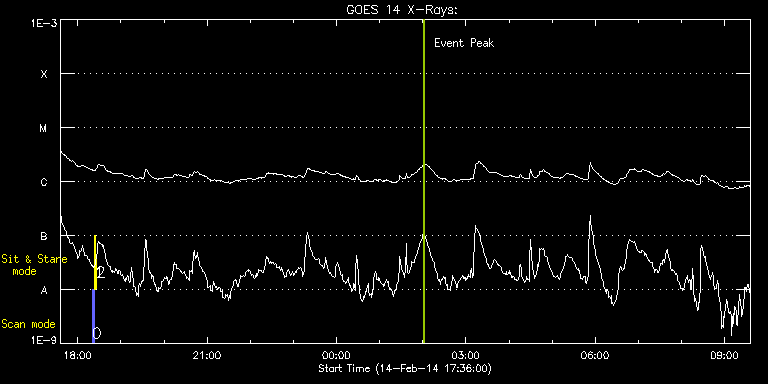 EIS Observation timeline overlay to GOES-Xray curve Code 1" 2" 40" 266" EIS Observations list for this event: STUDY ACRONYM ID DATE OBSERVED DESCRIPTION NOAA# TARGET 0 PRY_slot_contextLITE | 38655 | 2014/02/14 18:20:20 | Change of EIS pointing and alignment w | 1976 | Active Region TIMELINE ID DATE OBSERVED FITS FILE XCEN (+W/-E) YCEN (+N/-S) DUR ----------------------------------------------------------------------------------------------------------------- 38655 | 2014/02/14 18:20:20.000 | eis_l0_20140214_182020.fits.gz | -15.21 | -0.42 | 2m56s 1 Alignment_266 | 38656 | 2014/02/14 18:23:34 | Change of EIS pointing and alignment w | 1976 | Quiet Sun TIMELINE ID DATE OBSERVED FITS FILE XCEN (+W/-E) YCEN (+N/-S) DUR ----------------------------------------------------------------------------------------------------------------- 38656 | 2014/02/14 18:23:34.000 | eis_l0_20140214_182334.fits.gz | -132.57 | -0.35 | 1m22s 2 XRT_synop_AIA | 38657 | 2014/02/14 18:25:41 | Change of EIS pointing and alignment w | 1976 | Quiet Sun TIMELINE ID DATE OBSERVED FITS FILE XCEN (+W/-E) YCEN (+N/-S) DUR ----------------------------------------------------------------------------------------------------------------- 38657 | 2014/02/14 18:25:41.000 | eis_l0_20140214_182541.fits.gz | -132.57 | -0.50 | 11s : Check study information : Download file : View thumbnails For this event, also check for: