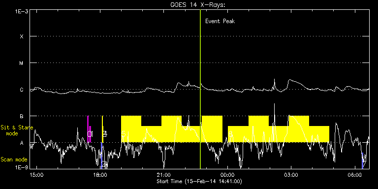 EIS Observation timeline overlay to GOES-Xray curve Code 1" 2" 40" 266" EIS Observations list for this event: STUDY ACRONYM ID DATE OBSERVED DESCRIPTION NOAA# TARGET 0 regcal071 | 38670 | 2014/02/15 17:23:42 | Dark exposures, CCD bottom rows (100s | | Engineering TIMELINE ID DATE OBSERVED FITS FILE XCEN (+W/-E) YCEN (+N/-S) DUR ----------------------------------------------------------------------------------------------------------------- 38670 | 2014/02/15 17:23:42.000 | eis_l0_20140215_172342.fits.gz | 685.41 | -445.09 | 3m22s 1 regcal072 | 38671 | 2014/02/15 17:30:02 | Dark exposures, top CCD rows (100s exp | | Engineering TIMELINE ID DATE OBSERVED FITS FILE XCEN (+W/-E) YCEN (+N/-S) DUR ----------------------------------------------------------------------------------------------------------------- 38671 | 2014/02/15 17:30:02.000 | eis_l0_20140215_173002.fits.gz | 686.03 | 65.68 | 3m22s 2 PRY_slot_contextLITE | 38673 | 2014/02/15 18:02:21 | Change of EIS pointing and alignment w | 1976 | Active Region TIMELINE ID DATE OBSERVED FITS FILE XCEN (+W/-E) YCEN (+N/-S) DUR ----------------------------------------------------------------------------------------------------------------- 38673 | 2014/02/15 18:02:21.000 | eis_l0_20140215_180221.fits.gz | -15.29 | -0.27 | 2m56s 3 Alignment_266 | 38674 | 2014/02/15 18:05:35 | Change of EIS pointing and alignment w | 1980 | Quiet Sun TIMELINE ID DATE OBSERVED FITS FILE XCEN (+W/-E) YCEN (+N/-S) DUR ----------------------------------------------------------------------------------------------------------------- 38674 | 2014/02/15 18:05:35.000 | eis_l0_20140215_180535.fits.gz | -132.49 | -0.65 | 1m22s 4 XRT_synop_AIA | 38675 | 2014/02/15 18:08:10 | Change of EIS pointing and alignment w | 1980 | Quiet Sun TIMELINE ID DATE OBSERVED FITS FILE XCEN (+W/-E) YCEN (+N/-S) DUR ----------------------------------------------------------------------------------------------------------------- 38675 | 2014/02/15 18:08:10.000 | eis_l0_20140215_180810.fits.gz | -132.49 | -0.50 | 10s 5 Flare266_Hunter01 | 38690 | 2014/02/15 18:59:14 | Flare hunting. | 1974 | Flare TIMELINE ID DATE OBSERVED FITS FILE XCEN (+W/-E) YCEN (+N/-S) DUR ----------------------------------------------------------------------------------------------------------------- 38690 | 2014/02/15 18:59:14.000 | eis_l0_20140215_185914.fits.gz | 553.27 | -121.48 | 56m22s 38690 | 2014/02/15 19:56:28.000 | eis_l0_20140215_195628.fits.gz | 559.22 | -122.02 | 56m23s 38690 | 2014/02/15 20:53:43.000 | eis_l0_20140215_205343.fits.gz | 565.17 | -122.87 | 56m22s 38690 | 2014/02/15 21:50:57.000 | eis_l0_20140215_215057.fits.gz | 571.11 | -123.72 | 56m23s 38690 | 2014/02/15 22:48:12.000 | eis_l0_20140215_224812.fits.gz | 576.98 | -124.41 | 56m22s 6 Flare266_Hunter01 | 38691 | 2014/02/16 00:02:14 | Flare hunting. | | Flare TIMELINE ID DATE OBSERVED FITS FILE XCEN (+W/-E) YCEN (+N/-S) DUR ----------------------------------------------------------------------------------------------------------------- 38691 | 2014/02/16 00:02:14.000 | eis_l0_20140216_000214.fits.gz | 584.32 | -125.26 | 56m22s 38691 | 2014/02/16 00:59:28.000 | eis_l0_20140216_005928.fits.gz | 590.12 | -125.96 | 56m23s 38691 | 2014/02/16 01:56:43.000 | eis_l0_20140216_015643.fits.gz | 595.76 | -126.73 | 56m22s 38691 | 2014/02/16 02:53:57.000 | eis_l0_20140216_025357.fits.gz | 601.32 | -127.58 | 56m23s 38691 | 2014/02/16 03:51:12.000 | eis_l0_20140216_035112.fits.gz | 606.80 | -128.35 | 56m22s 7 PRY_slot_contextLITE | 38688 | 2014/02/16 06:20:28 | Slot context for flare mode observatio | 1974 | Active Region TIMELINE ID DATE OBSERVED FITS FILE XCEN (+W/-E) YCEN (+N/-S) DUR ----------------------------------------------------------------------------------------------------------------- 38688 | 2014/02/16 06:20:28.000 | eis_l0_20140216_062028.fits.gz | 737.96 | -129.36 | 2m56s : Check study information : Download file : View thumbnails For this event, also check for: