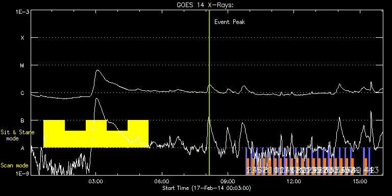 EIS Observation timeline overlay to GOES-Xray curve Code 1" 2" 40" 266" EIS Observations list for this event: STUDY ACRONYM ID DATE OBSERVED DESCRIPTION NOAA# TARGET 0 Flare266_Hunter01 | 38693 | 2014/02/17 00:38:13 | Flare hunting. | | Flare TIMELINE ID DATE OBSERVED FITS FILE XCEN (+W/-E) YCEN (+N/-S) DUR ----------------------------------------------------------------------------------------------------------------- 38693 | 2014/02/17 00:38:13.000 | eis_l0_20140217_003813.fits.gz | 710.62 | -146.81 | 56m22s 38693 | 2014/02/17 01:35:27.000 | eis_l0_20140217_013527.fits.gz | 714.56 | -147.82 | 56m23s 38693 | 2014/02/17 02:32:42.000 | eis_l0_20140217_023242.fits.gz | 718.58 | -148.59 | 56m22s 38693 | 2014/02/17 03:29:56.000 | eis_l0_20140217_032956.fits.gz | 722.44 | -149.60 | 56m23s 38693 | 2014/02/17 04:27:11.000 | eis_l0_20140217_042711.fits.gz | 726.15 | -150.45 | 56m22s 1 PRY_slot_contextLITE | 38694 | 2014/02/17 09:48:26 | SOT irradiance scan | | Active Region TIMELINE ID DATE OBSERVED FITS FILE XCEN (+W/-E) YCEN (+N/-S) DUR ----------------------------------------------------------------------------------------------------------------- 38694 | 2014/02/17 09:48:26.000 | eis_l0_20140217_094826.fits.gz | -9884.69 | -9943.20 | 2m56s 2 SK_DEEP_10x512_SLIT2 | 38695 | 2014/02/17 09:51:48 | SOT irradiance scan | | Quiet Sun TIMELINE ID DATE OBSERVED FITS FILE XCEN (+W/-E) YCEN (+N/-S) DUR ----------------------------------------------------------------------------------------------------------------- 38695 | 2014/02/17 09:51:48.000 | eis_l0_20140217_095148.fits.gz | -9864.96 | -9943.20 | 5m7s 3 PRY_slot_contextLITE | 38696 | 2014/02/17 10:03:19 | SOT irradiance scan | | Active Region TIMELINE ID DATE OBSERVED FITS FILE XCEN (+W/-E) YCEN (+N/-S) DUR ----------------------------------------------------------------------------------------------------------------- 38696 | 2014/02/17 10:03:19.000 | eis_l0_20140217_100319.fits.gz | -750.38 | 320.69 | 2m56s 4 SK_DEEP_10x512_SLIT2 | 38697 | 2014/02/17 10:06:41 | SOT irradiance scan | | Quiet Sun TIMELINE ID DATE OBSERVED FITS FILE XCEN (+W/-E) YCEN (+N/-S) DUR ----------------------------------------------------------------------------------------------------------------- 38697 | 2014/02/17 10:06:41.000 | eis_l0_20140217_100641.fits.gz | -730.57 | 320.53 | 5m7s 5 PRY_slot_contextLITE | 38698 | 2014/02/17 10:18:19 | SOT irradiance scan | | Active Region TIMELINE ID DATE OBSERVED FITS FILE XCEN (+W/-E) YCEN (+N/-S) DUR ----------------------------------------------------------------------------------------------------------------- 38698 | 2014/02/17 10:18:19.000 | eis_l0_20140217_101819.fits.gz | -565.22 | 340.77 | 2m56s 6 SK_DEEP_10x512_SLIT2 | 38699 | 2014/02/17 10:21:40 | SOT irradiance scan | | Quiet Sun TIMELINE ID DATE OBSERVED FITS FILE XCEN (+W/-E) YCEN (+N/-S) DUR ----------------------------------------------------------------------------------------------------------------- 38699 | 2014/02/17 10:21:40.000 | eis_l0_20140217_102140.fits.gz | -545.48 | 340.62 | 5m8s 7 PRY_slot_contextLITE | 38700 | 2014/02/17 10:33:19 | SOT irradiance scan | | Active Region TIMELINE ID DATE OBSERVED FITS FILE XCEN (+W/-E) YCEN (+N/-S) DUR ----------------------------------------------------------------------------------------------------------------- 38700 | 2014/02/17 10:33:19.000 | eis_l0_20140217_103319.fits.gz | -377.35 | 352.67 | 2m57s 8 SK_DEEP_10x512_SLIT2 | 38701 | 2014/02/17 10:36:41 | SOT irradiance scan | | Quiet Sun TIMELINE ID DATE OBSERVED FITS FILE XCEN (+W/-E) YCEN (+N/-S) DUR ----------------------------------------------------------------------------------------------------------------- 38701 | 2014/02/17 10:36:41.000 | eis_l0_20140217_103641.fits.gz | -357.70 | 352.44 | 5m8s 9 PRY_slot_contextLITE | 38702 | 2014/02/17 10:48:19 | SOT irradiance scan | | Active Region TIMELINE ID DATE OBSERVED FITS FILE XCEN (+W/-E) YCEN (+N/-S) DUR ----------------------------------------------------------------------------------------------------------------- 38702 | 2014/02/17 10:48:19.000 | eis_l0_20140217_104819.fits.gz | -186.08 | 359.31 | 2m56s 10 SK_DEEP_10x512_SLIT2 | 38703 | 2014/02/17 10:51:40 | SOT irradiance scan | | Quiet Sun TIMELINE ID DATE OBSERVED FITS FILE XCEN (+W/-E) YCEN (+N/-S) DUR ----------------------------------------------------------------------------------------------------------------- 38703 | 2014/02/17 10:51:40.000 | eis_l0_20140217_105140.fits.gz | -166.51 | 359.31 | 5m8s 11 PRY_slot_contextLITE | 38704 | 2014/02/17 11:03:19 | SOT irradiance scan | | Active Region TIMELINE ID DATE OBSERVED FITS FILE XCEN (+W/-E) YCEN (+N/-S) DUR ----------------------------------------------------------------------------------------------------------------- 38704 | 2014/02/17 11:03:19.000 | eis_l0_20140217_110319.fits.gz | 9.66 | 360.47 | 2m57s 12 SK_DEEP_10x512_SLIT2 | 38705 | 2014/02/17 11:06:41 | SOT irradiance scan | | Quiet Sun TIMELINE ID DATE OBSERVED FITS FILE XCEN (+W/-E) YCEN (+N/-S) DUR ----------------------------------------------------------------------------------------------------------------- 38705 | 2014/02/17 11:06:41.000 | eis_l0_20140217_110641.fits.gz | 29.32 | 360.39 | 5m8s 13 PRY_slot_contextLITE | 38706 | 2014/02/17 11:18:19 | SOT irradiance scan | | Active Region TIMELINE ID DATE OBSERVED FITS FILE XCEN (+W/-E) YCEN (+N/-S) DUR ----------------------------------------------------------------------------------------------------------------- 38706 | 2014/02/17 11:18:19.000 | eis_l0_20140217_111819.fits.gz | 126.00 | 359.16 | 2m56s 14 SK_DEEP_10x512_SLIT2 | 38707 | 2014/02/17 11:21:40 | SOT irradiance scan | | Quiet Sun TIMELINE ID DATE OBSERVED FITS FILE XCEN (+W/-E) YCEN (+N/-S) DUR ----------------------------------------------------------------------------------------------------------------- 38707 | 2014/02/17 11:21:40.000 | eis_l0_20140217_112140.fits.gz | 145.65 | 359.31 | 5m8s 15 PRY_slot_contextLITE | 38708 |