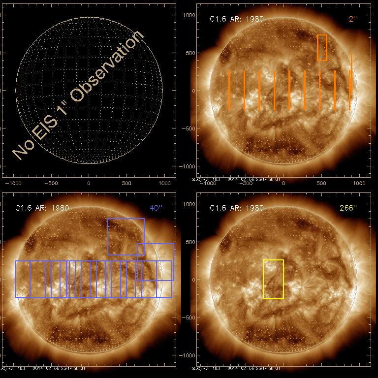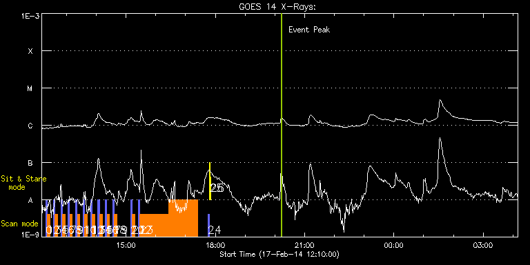 EIS Observation timeline overlay to GOES-Xray curve Code 1" 2" 40" 266" EIS Observations list for this event: STUDY ACRONYM ID DATE OBSERVED DESCRIPTION NOAA# TARGET 0 PRY_slot_contextLITE | 38714 | 2014/02/17 12:18:19 | SOT irradiance scan | 1973 | Active Region TIMELINE ID DATE OBSERVED FITS FILE XCEN (+W/-E) YCEN (+N/-S) DUR ----------------------------------------------------------------------------------------------------------------- 38714 | 2014/02/17 12:18:19.000 | eis_l0_20140217_121819.fits.gz | 882.64 | 224.36 | 2m57s 1 SK_DEEP_10x512_SLIT2 | 38715 | 2014/02/17 12:21:41 | SOT irradiance scan | | Quiet Sun TIMELINE ID DATE OBSERVED FITS FILE XCEN (+W/-E) YCEN (+N/-S) DUR ----------------------------------------------------------------------------------------------------------------- 38715 | 2014/02/17 12:21:41.000 | eis_l0_20140217_122141.fits.gz | 902.29 | 224.44 | 5m8s 2 PRY_slot_contextLITE | 38716 | 2014/02/17 12:33:19 | SOT irradiance scan | | Active Region TIMELINE ID DATE OBSERVED FITS FILE XCEN (+W/-E) YCEN (+N/-S) DUR ----------------------------------------------------------------------------------------------------------------- 38716 | 2014/02/17 12:33:19.000 | eis_l0_20140217_123319.fits.gz | -9884.69 | -9943.20 | 2m56s 3 SK_DEEP_10x512_SLIT2 | 38717 | 2014/02/17 12:36:41 | SOT irradiance scan | | Quiet Sun TIMELINE ID DATE OBSERVED FITS FILE XCEN (+W/-E) YCEN (+N/-S) DUR ----------------------------------------------------------------------------------------------------------------- 38717 | 2014/02/17 12:36:41.000 | eis_l0_20140217_123641.fits.gz | -9864.96 | -9943.20 | 5m8s 4 PRY_slot_contextLITE | 38718 | 2014/02/17 12:48:19 | SOT irradiance scan | | Active Region TIMELINE ID DATE OBSERVED FITS FILE XCEN (+W/-E) YCEN (+N/-S) DUR ----------------------------------------------------------------------------------------------------------------- 38718 | 2014/02/17 12:48:19.000 | eis_l0_20140217_124819.fits.gz | -736.24 | -0.66 | 2m57s 5 SK_DEEP_10x512_SLIT2 | 38719 | 2014/02/17 12:51:41 | SOT irradiance scan | | Quiet Sun TIMELINE ID DATE OBSERVED FITS FILE XCEN (+W/-E) YCEN (+N/-S) DUR ----------------------------------------------------------------------------------------------------------------- 38719 | 2014/02/17 12:51:41.000 | eis_l0_20140217_125141.fits.gz | -716.51 | -0.58 | 5m8s 6 PRY_slot_contextLITE | 38720 | 2014/02/17 13:03:19 | SOT irradiance scan | | Active Region TIMELINE ID DATE OBSERVED FITS FILE XCEN (+W/-E) YCEN (+N/-S) DUR ----------------------------------------------------------------------------------------------------------------- 38720 | 2014/02/17 13:03:19.000 | eis_l0_20140217_130319.fits.gz | -537.10 | -0.74 | 2m57s 7 SK_DEEP_10x512_SLIT2 | 38721 | 2014/02/17 13:06:41 | SOT irradiance scan | | Quiet Sun TIMELINE ID DATE OBSERVED FITS FILE XCEN (+W/-E) YCEN (+N/-S) DUR ----------------------------------------------------------------------------------------------------------------- 38721 | 2014/02/17 13:06:41.000 | eis_l0_20140217_130641.fits.gz | -517.44 | -0.66 | 5m8s 8 PRY_slot_contextLITE | 38722 | 2014/02/17 13:18:19 | SOT irradiance scan | | Active Region TIMELINE ID DATE OBSERVED FITS FILE XCEN (+W/-E) YCEN (+N/-S) DUR ----------------------------------------------------------------------------------------------------------------- 38722 | 2014/02/17 13:18:19.000 | eis_l0_20140217_131819.fits.gz | -338.11 | -0.51 | 2m57s 9 SK_DEEP_10x512_SLIT2 | 38723 | 2014/02/17 13:21:41 | SOT irradiance scan | | Quiet Sun TIMELINE ID DATE OBSERVED FITS FILE XCEN (+W/-E) YCEN (+N/-S) DUR ----------------------------------------------------------------------------------------------------------------- 38723 | 2014/02/17 13:21:41.000 | eis_l0_20140217_132141.fits.gz | -318.45 | -0.51 | 5m8s 10 PRY_slot_contextLITE | 38724 | 2014/02/17 13:33:19 | SOT irradiance scan | 1977 | Active Region TIMELINE ID DATE OBSERVED FITS FILE XCEN (+W/-E) YCEN (+N/-S) DUR ----------------------------------------------------------------------------------------------------------------- 38724 | 2014/02/17 13:33:19.000 | eis_l0_20140217_133319.fits.gz | -139.04 | -0.58 | 2m57s 11 SK_DEEP_10x512_SLIT2 | 38725 | 2014/02/17 13:36:41 | SOT irradiance scan | | Quiet Sun TIMELINE ID DATE OBSERVED FITS FILE XCEN (+W/-E) YCEN (+N/-S) DUR ----------------------------------------------------------------------------------------------------------------- 38725 | 2014/02/17 13:36:41.000 | eis_l0_20140217_133641.fits.gz | -119.39 | -0.51 | 5m8s 12 PRY_slot_contextLITE | 38726 | 2014/02/17 13:48:19 | SOT irradiance scan | 1977 | Active Region TIMELINE ID DATE OBSERVED FITS FILE XCEN (+W/-E) YCEN (+N/-S) DUR ----------------------------------------------------------------------------------------------------------------- 38726 | 2014/02/17 13:48:19.000 | eis_l0_20140217_134819.fits.gz | 59.64 | -0.58 | 2m56s 13 SK_DEEP_10x512_SLIT2 | 38727 | 2014/02/17 13:51:41 | SOT irradiance scan | | Quiet Sun TIMELINE ID DATE OBSERVED FITS FILE XCEN (+W/-E) YCEN (+N/-S) DUR ----------------------------------------------------------------------------------------------------------------- 38727 | 2014/02/17 13:51:41.000 | eis_l0_20140217_135141.fits.gz | 79.37 | -0.51 | 5m7s 14 PRY_slot_contextLITE | 38728 | 2014/02/17 14:03:19 | SOT irradiance scan | 1976 | Active Region TIMELINE ID DATE OBSERVED FITS FILE XCEN (+W/-E) YCEN (+N/-S) DUR ----------------------------------------------------------------------------------------------------------------- 38728 | 2014/02/17 14:03:19.000 | eis_l0_20140217_140319.fits.gz | 258.71 | -0.43 | 2m57s 15 SK_DEEP_10x512_SLIT2 | 38729 | 2014/02/17 14:06:41 | SOT irradiance scan | | Quiet Sun TIMELINE ID DATE OBSERVED FITS FILE XCEN (+W/-E) YCEN (+N/-S) DUR ----------------------------------------------------------------------------------------------------------------- 38729 | 2014/02/17 14:06:41.000 | eis_l0_20140217_140641.fits.gz | 278.44 | -0.58 | 5m8s 16 PRY_slot_contextLIT
