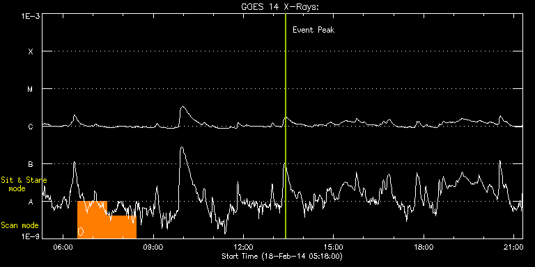 EIS Observation timeline overlay to GOES-Xray curve Code 1" 2" 40" 266" EIS Observations list for this event: STUDY ACRONYM ID DATE OBSERVED DESCRIPTION NOAA# TARGET 0 ISSI_jet_1 | 38685 | 2014/02/18 06:28:39 | On disk coronal hole jet observations | | Quiet Sun TIMELINE ID DATE OBSERVED FITS FILE XCEN (+W/-E) YCEN (+N/-S) DUR ----------------------------------------------------------------------------------------------------------------- 38685 | 2014/02/18 06:28:39.000 | eis_l0_20140218_062839.fits.gz | 598.86 | 552.74 | 58m36s 38685 | 2014/02/18 07:27:19.000 | eis_l0_20140218_072719.fits.gz | 604.42 | 551.90 | 58m36s : Check study information : Download file : View thumbnails For this event, also check for: