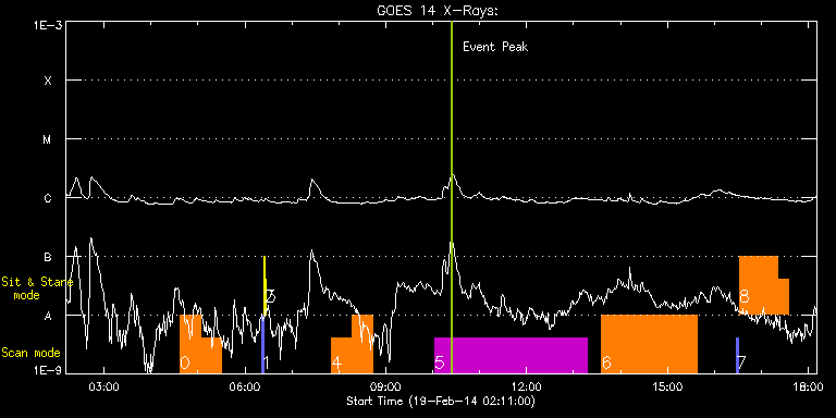EIS Observation timeline overlay to GOES-Xray curve Code 1" 2" 40" 266" EIS Observations list for this event: STUDY ACRONYM ID DATE OBSERVED DESCRIPTION NOAA# TARGET 0 PRY_footpoints_lite | 38781 | 2014/02/19 04:36:40 | Hot plasma properties in active region | 1977 | Active Region TIMELINE ID DATE OBSERVED FITS FILE XCEN (+W/-E) YCEN (+N/-S) DUR ----------------------------------------------------------------------------------------------------------------- 38781 | 2014/02/19 04:36:40.000 | eis_l0_20140219_043640.fits.gz | 478.35 | -61.53 | 26m23s 38781 | 2014/02/19 05:03:06.000 | eis_l0_20140219_050306.fits.gz | 481.90 | -61.84 | 26m22s 1 PRY_slot_contextLITE | 38767 | 2014/02/19 06:20:50 | Change of EIS pointing and alignment w | | Active Region TIMELINE ID DATE OBSERVED FITS FILE XCEN (+W/-E) YCEN (+N/-S) DUR ----------------------------------------------------------------------------------------------------------------- 38767 | 2014/02/19 06:20:50.000 | eis_l0_20140219_062050.fits.gz | -15.29 | -0.35 | 2m56s 2 Alignment_266 | 38768 | 2014/02/19 06:24:04 | Change of EIS pointing and alignment w | | Quiet Sun TIMELINE ID DATE OBSERVED FITS FILE XCEN (+W/-E) YCEN (+N/-S) DUR ----------------------------------------------------------------------------------------------------------------- 38768 | 2014/02/19 06:24:04.000 | eis_l0_20140219_062404.fits.gz | -132.57 | -0.50 | 1m22s 3 XRT_synop_AIA | 38769 | 2014/02/19 06:26:38 | Change of EIS pointing and alignment w | | Quiet Sun TIMELINE ID DATE OBSERVED FITS FILE XCEN (+W/-E) YCEN (+N/-S) DUR ----------------------------------------------------------------------------------------------------------------- 38769 | 2014/02/19 06:26:38.000 | eis_l0_20140219_062638.fits.gz | -132.49 | -0.50 | 11s 4 PRY_footpoints_lite | 38783 | 2014/02/19 07:50:49 | Hot plasma properties in active region | 1977 | Active Region TIMELINE ID DATE OBSERVED FITS FILE XCEN (+W/-E) YCEN (+N/-S) DUR ----------------------------------------------------------------------------------------------------------------- 38783 | 2014/02/19 07:50:49.000 | eis_l0_20140219_075049.fits.gz | 504.00 | -63.39 | 26m23s 38783 | 2014/02/19 08:17:15.000 | eis_l0_20140219_081715.fits.gz | 507.55 | -63.62 | 26m23s 5 SYNOP006 | 38770 | 2014/02/19 10:02:26 | Sensitivity monitoring. | | Quiet Sun TIMELINE ID DATE OBSERVED FITS FILE XCEN (+W/-E) YCEN (+N/-S) DUR ----------------------------------------------------------------------------------------------------------------- 38770 | 2014/02/19 10:02:26.000 | eis_l0_20140219_100226.fits.gz | -84.83 | -0.50 | 3h15m35s 6 Atlas_120 | 38771 | 2014/02/19 13:35:54 | Spectral atlas synoptic programme | | Quiet Sun TIMELINE ID DATE OBSERVED FITS FILE XCEN (+W/-E) YCEN (+N/-S) DUR ----------------------------------------------------------------------------------------------------------------- 38771 | 2014/02/19 13:35:54.000 | eis_l0_20140219_133554.fits.gz | -52.02 | -0.27 | 2h1m39s 7 PRY_slot_contextLITE | 38784 | 2014/02/19 16:28:19 | Slot context for spicule observations | | Active Region TIMELINE ID DATE OBSERVED FITS FILE XCEN (+W/-E) YCEN (+N/-S) DUR ----------------------------------------------------------------------------------------------------------------- 38784 | 2014/02/19 16:28:19.000 | eis_l0_20140219_162819.fits.gz | -9878.95 | -9943.20 | 2m57s 8 vhh_slowar_sas_1h6m | 38785 | 2014/02/19 16:31:40 | Spicule observations with IRIS. | | Active Region TIMELINE ID DATE OBSERVED FITS FILE XCEN (+W/-E) YCEN (+N/-S) DUR ----------------------------------------------------------------------------------------------------------------- 38785 | 2014/02/19 16:31:40.000 | eis_l0_20140219_163140.fits.gz | -9854.98 | -9943.20 | 49m44s 38785 | 2014/02/19 16:48:57.000 | eis_l0_20140219_164857.fits.gz | -9854.98 | -9943.20 | 45m32s : Check study information : Download file : View thumbnails For this event, also check for: