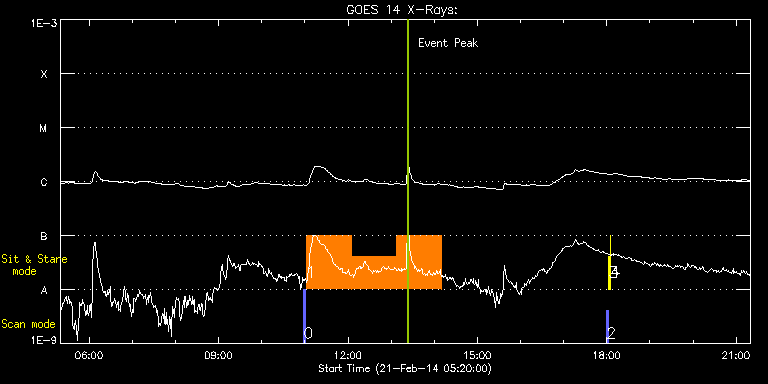 EIS Observation timeline overlay to GOES-Xray curve Code 1" 2" 40" 266" EIS Observations list for this event: STUDY ACRONYM ID DATE OBSERVED DESCRIPTION NOAA# TARGET 0 PRY_slot_contextLITE | 38797 | 2014/02/21 10:58:20 | Slot context for spicule observations. | | Active Region TIMELINE ID DATE OBSERVED FITS FILE XCEN (+W/-E) YCEN (+N/-S) DUR ----------------------------------------------------------------------------------------------------------------- 38797 | 2014/02/21 10:58:20.000 | eis_l0_20140221_105820.fits.gz | -9878.45 | -9943.20 | 2m56s 1 vhh_slowar_sas_1h6m | 38798 | 2014/02/21 11:01:41 | Spicule observations. | | Active Region TIMELINE ID DATE OBSERVED FITS FILE XCEN (+W/-E) YCEN (+N/-S) DUR ----------------------------------------------------------------------------------------------------------------- 38798 | 2014/02/21 11:01:41.000 | eis_l0_20140221_110141.fits.gz | -9854.73 | -9943.20 | 1h2m49s 38798 | 2014/02/21 12:04:33.000 | eis_l0_20140221_120433.fits.gz | -9854.73 | -9943.20 | 1h2m51s 38798 | 2014/02/21 13:07:27.000 | eis_l0_20140221_130727.fits.gz | -9854.73 | -9943.20 | 1h2m48s 2 PRY_slot_contextLITE | 38791 | 2014/02/21 17:59:50 | Change of EIS pointing and alignment w | | Active Region TIMELINE ID DATE OBSERVED FITS FILE XCEN (+W/-E) YCEN (+N/-S) DUR ----------------------------------------------------------------------------------------------------------------- 38791 | 2014/02/21 17:59:50.000 | eis_l0_20140221_175950.fits.gz | -15.21 | -0.35 | 2m56s 3 Alignment_266 | 38792 | 2014/02/21 18:03:04 | Change of EIS pointing and alignment w | | Quiet Sun TIMELINE ID DATE OBSERVED FITS FILE XCEN (+W/-E) YCEN (+N/-S) DUR ----------------------------------------------------------------------------------------------------------------- 38792 | 2014/02/21 18:03:04.000 | eis_l0_20140221_180304.fits.gz | -132.57 | -0.35 | 1m22s 4 XRT_synop_AIA | 38793 | 2014/02/21 18:05:12 | Change of EIS pointing and alignment w | | Quiet Sun TIMELINE ID DATE OBSERVED FITS FILE XCEN (+W/-E) YCEN (+N/-S) DUR ----------------------------------------------------------------------------------------------------------------- 38793 | 2014/02/21 18:05:12.000 | eis_l0_20140221_180512.fits.gz | -132.49 | -0.42 | 10s : Check study information : Download file : View thumbnails For this event, also check for: