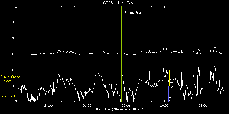 EIS Observation timeline overlay to GOES-Xray curve Code 1" 2" 40" 266" EIS Observations list for this event: STUDY ACRONYM ID DATE OBSERVED DESCRIPTION NOAA# TARGET 0 PRY_slot_contextLITE | 38855 | 2014/02/27 06:19:19 | Synoptic observations | 1987 | Active Region TIMELINE ID DATE OBSERVED FITS FILE XCEN (+W/-E) YCEN (+N/-S) DUR ----------------------------------------------------------------------------------------------------------------- 38855 | 2014/02/27 06:19:19.000 | eis_l0_20140227_061919.fits.gz | -15.14 | -0.35 | 2m56s 1 Alignment_266 | 38856 | 2014/02/27 06:22:57 | Synoptic observations | 1987 | Quiet Sun TIMELINE ID DATE OBSERVED FITS FILE XCEN (+W/-E) YCEN (+N/-S) DUR ----------------------------------------------------------------------------------------------------------------- 38856 | 2014/02/27 06:22:57.000 | eis_l0_20140227_062257.fits.gz | -132.57 | -0.35 | 1m22s 2 XRT_synop_AIA | 38857 | 2014/02/27 06:25:46 | Synoptic observations | 1987 | Quiet Sun TIMELINE ID DATE OBSERVED FITS FILE XCEN (+W/-E) YCEN (+N/-S) DUR ----------------------------------------------------------------------------------------------------------------- 38857 | 2014/02/27 06:25:46.000 | eis_l0_20140227_062546.fits.gz | -132.49 | -0.35 | 10s : Check study information : Download file : View thumbnails For this event, also check for: