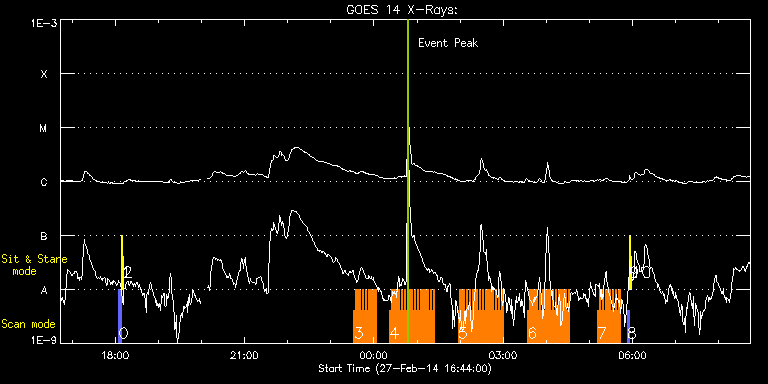 EIS Observation timeline overlay to GOES-Xray curve Code 1" 2" 40" 266" EIS Observations list for this event: STUDY ACRONYM ID DATE OBSERVED DESCRIPTION NOAA# TARGET 0 PRY_slot_contextLITE | 38892 | 2014/02/27 18:05:20 | Synoptic observations | 1987 | Active Region TIMELINE ID DATE OBSERVED FITS FILE XCEN (+W/-E) YCEN (+N/-S) DUR ----------------------------------------------------------------------------------------------------------------- 38892 | 2014/02/27 18:05:20.000 | eis_l0_20140227_180520.fits.gz | -15.14 | -0.35 | 2m56s 1 Alignment_266 | 38893 | 2014/02/27 18:08:58 | Synoptic observations | 1987 | Quiet Sun TIMELINE ID DATE OBSERVED FITS FILE XCEN (+W/-E) YCEN (+N/-S) DUR ----------------------------------------------------------------------------------------------------------------- 38893 | 2014/02/27 18:08:58.000 | eis_l0_20140227_180858.fits.gz | -132.49 | -0.27 | 1m22s 2 XRT_synop_AIA | 38894 | 2014/02/27 18:11:19 | Synoptic observations | 1987 | Quiet Sun TIMELINE ID DATE OBSERVED FITS FILE XCEN (+W/-E) YCEN (+N/-S) DUR ----------------------------------------------------------------------------------------------------------------- 38894 | 2014/02/27 18:11:19.000 | eis_l0_20140227_181119.fits.gz | -132.49 | -0.58 | 10s 3 Cam_flare_diag | 38905 | 2014/02/27 23:32:20 | HOP 245 | | Flare TIMELINE ID DATE OBSERVED FITS FILE XCEN (+W/-E) YCEN (+N/-S) DUR ----------------------------------------------------------------------------------------------------------------- 38905 | 2014/02/27 23:32:20.000 | eis_l0_20140227_233220.fits.gz | -594.55 | -154.76 | 2m12s 38905 | 2014/02/27 23:34:34.000 | eis_l0_20140227_233434.fits.gz | -594.24 | -154.76 | 2m12s 38905 | 2014/02/27 23:36:49.000 | eis_l0_20140227_233649.fits.gz | -594.09 | -154.76 | 2m12s 38905 | 2014/02/27 23:39:03.000 | eis_l0_20140227_233903.fits.gz | -593.78 | -154.61 | 2m12s 38905 | 2014/02/27 23:41:18.000 | eis_l0_20140227_234118.fits.gz | -593.47 | -154.61 | 2m12s 38905 | 2014/02/27 23:43:32.000 | eis_l0_20140227_234332.fits.gz | -593.24 | -154.53 | 2m12s 38905 | 2014/02/27 23:45:47.000 | eis_l0_20140227_234547.fits.gz | -592.93 | -154.46 | 2m12s 38905 | 2014/02/27 23:48:02.000 | eis_l0_20140227_234802.fits.gz | -592.70 | -154.61 | 2m11s 38905 | 2014/02/27 23:50:16.000 | eis_l0_20140227_235016.fits.gz | -592.46 | -154.69 | 2m12s 38905 | 2014/02/27 23:52:30.000 | eis_l0_20140227_235230.fits.gz | -592.16 | -154.53 | 2m12s 38905 | 2014/02/27 23:54:45.000 | eis_l0_20140227_235445.fits.gz | -591.92 | -154.38 | 2m12s 38905 | 2014/02/27 23:56:59.000 | eis_l0_20140227_235659.fits.gz | -591.69 | -154.53 | 2m12s 38905 | 2014/02/27 23:59:14.000 | eis_l0_20140227_235914.fits.gz | -591.46 | -154.53 | 2m12s 38905 | 2014/02/28 00:01:28.000 | eis_l0_20140228_000128.fits.gz | -591.15 | -154.46 | 2m12s 4 Cam_flare_diag | 38907 | 2014/02/28 00:22:13 | HOP 245 | 1990 | Flare TIMELINE ID DATE OBSERVED FITS FILE XCEN (+W/-E) YCEN (+N/-S) DUR ----------------------------------------------------------------------------------------------------------------- 38907 | 2014/02/28 00:22:13.000 | eis_l0_20140228_002213.fits.gz | -588.76 | -154.15 | 2m12s 38907 | 2014/02/28 00:24:28.000 | eis_l0_20140228_002428.fits.gz | -588.45 | -154.07 | 2m12s 38907 | 2014/02/28 00:26:42.000 | eis_l0_20140228_002642.fits.gz | -588.22 | -154.07 | 2m12s 38907 | 2014/02/28 00:28:57.000 | eis_l0_20140228_002857.fits.gz | -587.98 | -154.07 | 2m12s 38907 | 2014/02/28 00:31:12.000 | eis_l0_20140228_003112.fits.gz | -587.67 | -154.15 | 2m12s 38907 | 2014/02/28 00:33:27.000 | eis_l0_20140228_003327.fits.gz | -587.44 | -153.91 | 2m11s 38907 | 2014/02/28 00:35:41.000 | eis_l0_20140228_003541.fits.gz | -587.13 | -153.91 | 2m12s 38907 | 2014/02/28 00:37:56.000 | eis_l0_20140228_003756.fits.gz | -586.82 | -153.91 | 2m12s 38907 | 2014/02/28 00:40:10.000 | eis_l0_20140228_004010.fits.gz | -586.67 | -153.91 | 2m12s 38907 | 2014/02/28 00:42:25.000 | eis_l0_20140228_004225.fits.gz | -586.44 | -153.91 | 2m12s 38907 | 2014/02/28 00:44:39.000 | eis_l0_20140228_004439.fits.gz | -586.13 | -153.84 | 2m12s 38907 | 2014/02/28 00:46:54.000 | eis_l0_20140228_004654.fits.gz | -585.90 | -153.91 | 2m11s 38907 | 2014/02/28 00:49:08.000 | eis_l0_20140228_004908.fits.gz | -585.59 | -153.84 | 2m12s 38907 | 2014/02/28 00:51:23.000 | eis_l0_20140228_005123.fits.gz | -585.36 | -153.84 | 2m11s 38907 | 2014/02/28 00:53:37.000 | eis_l0_20140228_005337.fits.gz | -585.12 | -153.76 | 2m12s 38907 | 2014/02/28 00:55:52.000 | eis_l0_20140228_005552.fits.gz | -584.89 | -153.76 | 2m11s 38907 | 2014/02/28 00:58:06.000 | eis_l0_20140228_005806.fits.gz | -584.51 | -153.76 | 2m12s 38907 | 2014/02/28 01:00:21.000 | eis_l0_20140228_010021.fits.gz | -584.28 | -153.68 | 2m11s 38907 | 2014/02/28 01:02:35.000 | eis_l0_20140228_010235.fits.gz | -583.97 | -153.76 | 2m12s 38907 | 2014/02/28 01:04:50.000 | eis_l0_20140228_010450.fits.gz | -583.73 | -153.76 | 2m11s 38907 | 2014/02/28 01:07:04.000 | eis_l0_20140228_010704.fits.gz | -583.50 | -153.76 | 2m12s 38907 | 2014/02/28 01:09:19.000 | eis_l0_20140228_010919.fits.gz | -583.19 | -153.60 | 2m11s 38907 | 2014/02/28 01:11:33.000 | eis_l0_20140228_011133.fits.gz | -582.96 | -153.60 | 2m12s 38907 | 2014/02/28 01:13:48.000 | eis_l0_20140228_011348.fits.gz | -582.73 | -153.53 | 2m12s 38907 | 2014/02/28 01:16:03.000 | eis_l0_20140228_011603.fits.gz | -582.50 | -153.53 | 2m12s 38907 | 2014/02/28 01:18:18.000 | eis_l0_20140228_011818.fits.gz | -582.19 | -153.45 | 2m11s 38907 | 2014/02/28 01:20:32.000 | eis_l0_20140228_012032.fits.gz | -581.88 | -153.37 | 2m12s 38907 | 2014/02/28 01:22:47.000 | eis_l0_20140228_012247.fits.gz | -581.57 | -153.45 | 2m11s 5 Cam_flare_diag | 38908 | 2014/02/28 01:57:13 | HOP 245 | 1990 | Flare TIMELINE ID DATE OBSERVED FITS FILE XCEN (+W/-E) YCEN (+N/-S) DUR ----------------------------------------------------------------------------------------------------------------- 38908 | 2014/02/28 01:57:13.000 | eis_l0_20140228_015713.fits.gz | -577.55 | -153.06 | 2m