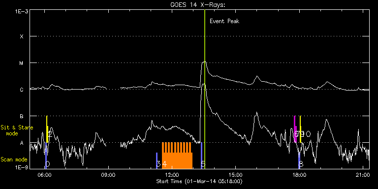 EIS Observation timeline overlay to GOES-Xray curve Code 1" 2" 40" 266" EIS Observations list for this event: STUDY ACRONYM ID DATE OBSERVED DESCRIPTION NOAA# TARGET 0 PRY_slot_contextLITE | 38901 | 2014/03/01 06:02:19 | Synoptic observations | 1992 | Active Region TIMELINE ID DATE OBSERVED FITS FILE XCEN (+W/-E) YCEN (+N/-S) DUR ----------------------------------------------------------------------------------------------------------------- 38901 | 2014/03/01 06:02:19.000 | eis_l0_20140301_060219.fits.gz | -15.21 | -0.42 | 2m57s 1 Alignment_266 | 38902 | 2014/03/01 06:05:57 | Synoptic observations | 1989 | Quiet Sun TIMELINE ID DATE OBSERVED FITS FILE XCEN (+W/-E) YCEN (+N/-S) DUR ----------------------------------------------------------------------------------------------------------------- 38902 | 2014/03/01 06:05:57.000 | eis_l0_20140301_060557.fits.gz | -132.49 | -0.42 | 1m22s 2 XRT_synop_AIA | 38903 | 2014/03/01 06:08:46 | Synoptic observations | 1989 | Quiet Sun TIMELINE ID DATE OBSERVED FITS FILE XCEN (+W/-E) YCEN (+N/-S) DUR ----------------------------------------------------------------------------------------------------------------- 38903 | 2014/03/01 06:08:46.000 | eis_l0_20140301_060846.fits.gz | -132.49 | -0.50 | 10s 3 PRY_slot_context_v3 | 38949 | 2014/03/01 11:15:03 | AR observation | 1990 | Active Region TIMELINE ID DATE OBSERVED FITS FILE XCEN (+W/-E) YCEN (+N/-S) DUR ----------------------------------------------------------------------------------------------------------------- 38949 | 2014/03/01 11:15:03.000 | eis_l0_20140301_111503.fits.gz | -513.66 | -292.24 | 2m56s 4 HH_Flare_162x152 | 38950 | 2014/03/01 11:32:35 | AR observation | 1991 | Flare TIMELINE ID DATE OBSERVED FITS FILE XCEN (+W/-E) YCEN (+N/-S) DUR ----------------------------------------------------------------------------------------------------------------- 38950 | 2014/03/01 11:32:35.000 | eis_l0_20140301_113235.fits.gz | -507.72 | -327.08 | 4m10s 38950 | 2014/03/01 11:36:48.000 | eis_l0_20140301_113648.fits.gz | -507.18 | -326.93 | 4m11s 38950 | 2014/03/01 11:41:02.000 | eis_l0_20140301_114102.fits.gz | -506.64 | -326.85 | 4m11s 38950 | 2014/03/01 11:45:16.000 | eis_l0_20140301_114516.fits.gz | -506.25 | -326.85 | 4m10s 38950 | 2014/03/01 11:49:29.000 | eis_l0_20140301_114929.fits.gz | -505.79 | -326.70 | 4m11s 38950 | 2014/03/01 11:53:43.000 | eis_l0_20140301_115343.fits.gz | -505.24 | -326.77 | 4m10s 38950 | 2014/03/01 11:57:56.000 | eis_l0_20140301_115756.fits.gz | -504.78 | -326.70 | 4m11s 38950 | 2014/03/01 12:02:09.000 | eis_l0_20140301_120209.fits.gz | -504.32 | -326.70 | 4m11s 38950 | 2014/03/01 12:06:23.000 | eis_l0_20140301_120623.fits.gz | -503.78 | -326.54 | 4m10s 38950 | 2014/03/01 12:10:36.000 | eis_l0_20140301_121036.fits.gz | -503.39 | -326.54 | 4m11s 38950 | 2014/03/01 12:14:50.000 | eis_l0_20140301_121450.fits.gz | -502.93 | -326.54 | 4m10s 38950 | 2014/03/01 12:19:03.000 | eis_l0_20140301_121903.fits.gz | -502.39 | -326.39 | 4m11s 38950 | 2014/03/01 12:23:17.000 | eis_l0_20140301_122317.fits.gz | -501.92 | -326.46 | 4m10s 38950 | 2014/03/01 12:27:30.000 | eis_l0_20140301_122730.fits.gz | -501.54 | -326.23 | 4m11s 38950 | 2014/03/01 12:31:43.000 | eis_l0_20140301_123143.fits.gz | -501.00 | -326.31 | 4m11s 38950 | 2014/03/01 12:35:57.000 | eis_l0_20140301_123557.fits.gz | -500.53 | -326.31 | 4m10s 38950 | 2014/03/01 12:40:10.000 | eis_l0_20140301_124010.fits.gz | -500.07 | -326.23 | 4m11s 38950 | 2014/03/01 12:44:24.000 | eis_l0_20140301_124424.fits.gz | -499.53 | -326.23 | 4m11s 38950 | 2014/03/01 12:48:38.000 | eis_l0_20140301_124838.fits.gz | -499.14 | -326.23 | 4m10s 38950 | 2014/03/01 12:52:51.000 | eis_l0_20140301_125251.fits.gz | -498.68 | -326.23 | 4m11s 5 PRY_slot_context_v3 | 38953 | 2014/03/01 13:21:49 | AR observation | 1990 | Active Region TIMELINE ID DATE OBSERVED FITS FILE XCEN (+W/-E) YCEN (+N/-S) DUR ----------------------------------------------------------------------------------------------------------------- 38953 | 2014/03/01 13:21:49.000 | eis_l0_20140301_132149.fits.gz | -499.36 | -290.92 | 2m57s 6 regcal071 | 38923 | 2014/03/01 17:45:12 | Dark exposures, CCD bottom rows (100s | | Engineering TIMELINE ID DATE OBSERVED FITS FILE XCEN (+W/-E) YCEN (+N/-S) DUR ----------------------------------------------------------------------------------------------------------------- 38923 | 2014/03/01 17:45:12.000 | eis_l0_20140301_174512.fits.gz | -449.44 | -623.30 | 3m22s 7 regcal072 | 38924 | 2014/03/01 17:49:01 | Dark exposures, top CCD rows (100s exp | | Engineering TIMELINE ID DATE OBSERVED FITS FILE XCEN (+W/-E) YCEN (+N/-S) DUR ----------------------------------------------------------------------------------------------------------------- 38924 | 2014/03/01 17:49:01.000 | eis_l0_20140301_174901.fits.gz | -449.05 | -112.30 | 3m21s 8 PRY_slot_contextLITE | 38925 | 2014/03/01 17:58:14 | EIS pointing alignment | 1992 | Active Region TIMELINE ID DATE OBSERVED FITS FILE XCEN (+W/-E) YCEN (+N/-S) DUR ----------------------------------------------------------------------------------------------------------------- 38925 | 2014/03/01 17:58:14.000 | eis_l0_20140301_175814.fits.gz | -15.21 | -0.35 | 2m56s 9 Alignment_266 | 38926 | 2014/03/01 18:02:07 | EIS pointing alignment | 1989 | Quiet Sun TIMELINE ID DATE OBSERVED FITS FILE XCEN (+W/-E) YCEN (+N/-S) DUR ----------------------------------------------------------------------------------------------------------------- 38926 | 2014/03/01 18:02:07.000 | eis_l0_20140301_180207.fits.gz | -132.57 | -0.35 | 1m22s 10 XRT_synop_AIA | 38927 | 2014/03/01 18:05:05 | EIS pointing alignment | 1989 | Quiet Sun TIMELINE ID DATE OBSERVED FITS FILE XCEN (+W/-E) YCEN (+N/-S) DUR ----------------------------------------------------------------------------------------------------------------- 38927 | 2014/03/01 18:05:05.000 | eis_l0_20140301_180505.fits.gz | -132.49 | -0.50 | 10s : Check study information : Download file : View thumbnails 