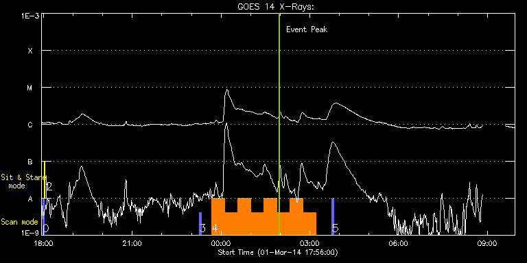 EIS Observation timeline overlay to GOES-Xray curve Code 1" 2" 40" 266" EIS Observations list for this event: STUDY ACRONYM ID DATE OBSERVED DESCRIPTION NOAA# TARGET 0 PRY_slot_contextLITE | 38925 | 2014/03/01 17:58:14 | EIS pointing alignment | 1992 | Active Region TIMELINE ID DATE OBSERVED FITS FILE XCEN (+W/-E) YCEN (+N/-S) DUR ----------------------------------------------------------------------------------------------------------------- 38925 | 2014/03/01 17:58:14.000 | eis_l0_20140301_175814.fits.gz | -15.21 | -0.35 | 2m56s 1 Alignment_266 | 38926 | 2014/03/01 18:02:07 | EIS pointing alignment | 1989 | Quiet Sun TIMELINE ID DATE OBSERVED FITS FILE XCEN (+W/-E) YCEN (+N/-S) DUR ----------------------------------------------------------------------------------------------------------------- 38926 | 2014/03/01 18:02:07.000 | eis_l0_20140301_180207.fits.gz | -132.57 | -0.35 | 1m22s 2 XRT_synop_AIA | 38927 | 2014/03/01 18:05:05 | EIS pointing alignment | 1989 | Quiet Sun TIMELINE ID DATE OBSERVED FITS FILE XCEN (+W/-E) YCEN (+N/-S) DUR ----------------------------------------------------------------------------------------------------------------- 38927 | 2014/03/01 18:05:05.000 | eis_l0_20140301_180505.fits.gz | -132.49 | -0.50 | 10s 3 PRY_slot_context_v3 | 38928 | 2014/03/01 23:16:33 | IHOP 246: Hot plasma in AR | 1990 | Active Region TIMELINE ID DATE OBSERVED FITS FILE XCEN (+W/-E) YCEN (+N/-S) DUR ----------------------------------------------------------------------------------------------------------------- 38928 | 2014/03/01 23:16:33.000 | eis_l0_20140301_231633.fits.gz | -226.49 | -170.89 | 2m56s 4 PRY_footpoints_lite | 38929 | 2014/03/01 23:40:34 | IHOP 246: Hot plasma in AR | | Active Region TIMELINE ID DATE OBSERVED FITS FILE XCEN (+W/-E) YCEN (+N/-S) DUR ----------------------------------------------------------------------------------------------------------------- 38929 | 2014/03/01 23:40:34.000 | eis_l0_20140301_234034.fits.gz | -190.13 | -96.58 | 26m22s 38929 | 2014/03/02 00:06:59.000 | eis_l0_20140302_000659.fits.gz | -186.03 | -96.58 | 26m23s 38929 | 2014/03/02 00:33:25.000 | eis_l0_20140302_003325.fits.gz | -182.25 | -96.35 | 26m22s 38929 | 2014/03/02 00:59:50.000 | eis_l0_20140302_005950.fits.gz | -178.31 | -96.28 | 26m23s 38929 | 2014/03/02 01:26:16.000 | eis_l0_20140302_012616.fits.gz | -174.45 | -96.12 | 26m22s 38929 | 2014/03/02 01:52:42.000 | eis_l0_20140302_015242.fits.gz | -170.51 | -95.97 | 26m22s 38929 | 2014/03/02 02:19:07.000 | eis_l0_20140302_021907.fits.gz | -166.64 | -96.12 | 26m22s 38929 | 2014/03/02 02:45:33.000 | eis_l0_20140302_024533.fits.gz | -162.70 | -95.97 | 26m22s 5 PRY_slot_context_v3 | 38930 | 2014/03/02 03:45:08 | IHOP 246: Hot plasma in AR | 1990 | Active Region TIMELINE ID DATE OBSERVED FITS FILE XCEN (+W/-E) YCEN (+N/-S) DUR ----------------------------------------------------------------------------------------------------------------- 38930 | 2014/03/02 03:45:08.000 | eis_l0_20140302_034508.fits.gz | -186.86 | -169.58 | 2m57s : Check study information : Download file : View thumbnails For this event, also check for: