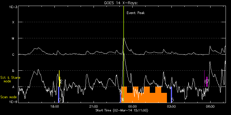 EIS Observation timeline overlay to GOES-Xray curve Code 1" 2" 40" 266" EIS Observations list for this event: STUDY ACRONYM ID DATE OBSERVED DESCRIPTION NOAA# TARGET 0 PRY_slot_contextLITE | 38934 | 2014/03/02 18:16:43 | EIS pointing alignment | 1989 | Active Region TIMELINE ID DATE OBSERVED FITS FILE XCEN (+W/-E) YCEN (+N/-S) DUR ----------------------------------------------------------------------------------------------------------------- 38934 | 2014/03/02 18:16:43.000 | eis_l0_20140302_181643.fits.gz | -15.29 | -0.50 | 2m57s 1 Alignment_266 | 38935 | 2014/03/02 18:20:36 | EIS pointing alignment | 1990 | Quiet Sun TIMELINE ID DATE OBSERVED FITS FILE XCEN (+W/-E) YCEN (+N/-S) DUR ----------------------------------------------------------------------------------------------------------------- 38935 | 2014/03/02 18:20:36.000 | eis_l0_20140302_182036.fits.gz | -132.57 | -0.58 | 1m22s 2 XRT_synop_AIA | 38936 | 2014/03/02 18:23:34 | EIS pointing alignment | 1990 | Quiet Sun TIMELINE ID DATE OBSERVED FITS FILE XCEN (+W/-E) YCEN (+N/-S) DUR ----------------------------------------------------------------------------------------------------------------- 38936 | 2014/03/02 18:23:34.000 | eis_l0_20140302_182334.fits.gz | -132.57 | -0.58 | 10s 3 PRY_slot_context_v3 | 38937 | 2014/03/02 23:02:56 | IHOP 246: Hot plasma in AR | 1990 | Active Region TIMELINE ID DATE OBSERVED FITS FILE XCEN (+W/-E) YCEN (+N/-S) DUR ----------------------------------------------------------------------------------------------------------------- 38937 | 2014/03/02 23:02:56.000 | eis_l0_20140302_230256.fits.gz | -13.59 | -167.65 | 2m56s 4 PRY_footpoints_lite | 38938 | 2014/03/02 23:07:33 | IHOP 246: Hot plasma in AR | | Active Region TIMELINE ID DATE OBSERVED FITS FILE XCEN (+W/-E) YCEN (+N/-S) DUR ----------------------------------------------------------------------------------------------------------------- 38938 | 2014/03/02 23:07:33.000 | eis_l0_20140302_230733.fits.gz | 23.23 | -93.42 | 26m23s 38938 | 2014/03/02 23:33:59.000 | eis_l0_20140302_233359.fits.gz | 27.17 | -93.50 | 26m22s 38938 | 2014/03/03 00:00:24.000 | eis_l0_20140303_000024.fits.gz | 31.19 | -93.42 | 26m23s 38938 | 2014/03/03 00:26:50.000 | eis_l0_20140303_002650.fits.gz | 35.05 | -93.42 | 25m51s 38938 | 2014/03/03 00:53:15.000 | eis_l0_20140303_005315.fits.gz | 39.07 | -93.42 | 26m23s 38938 | 2014/03/03 01:19:41.000 | eis_l0_20140303_011941.fits.gz | 43.01 | -93.57 | 26m22s 38938 | 2014/03/03 01:46:06.000 | eis_l0_20140303_014606.fits.gz | 47.02 | -93.57 | 25m51s 38938 | 2014/03/03 02:12:32.000 | eis_l0_20140303_021232.fits.gz | 50.96 | -93.50 | 26m22s 5 PRY_slot_context_v3 | 38939 | 2014/03/03 02:58:20 | IHOP 246: Hot plasma in AR | 1990 | Active Region TIMELINE ID DATE OBSERVED FITS FILE XCEN (+W/-E) YCEN (+N/-S) DUR ----------------------------------------------------------------------------------------------------------------- 38939 | 2014/03/03 02:58:20.000 | eis_l0_20140303_025820.fits.gz | 21.63 | -167.49 | 2m57s 6 regcal070 | 38940 | 2014/03/03 05:32:27 | Flat field with overscan pixels (50*8) | | Engineering TIMELINE ID DATE OBSERVED FITS FILE XCEN (+W/-E) YCEN (+N/-S) DUR ----------------------------------------------------------------------------------------------------------------- 38940 | 2014/03/03 05:32:27.000 | eis_l0_20140303_053227.fits.gz | -177.84 | -98.16 | 3s 7 regcal074 | 38941 | 2014/03/03 05:42:24 | Dark exposures including overscan pixe | | Engineering TIMELINE ID DATE OBSERVED FITS FILE XCEN (+W/-E) YCEN (+N/-S) DUR ----------------------------------------------------------------------------------------------------------------- 38941 | 2014/03/03 05:42:24.000 | eis_l0_20140303_054224.fits.gz | -176.52 | -98.01 | 3m22s : Check study information : Download file : View thumbnails For this event, also check for: