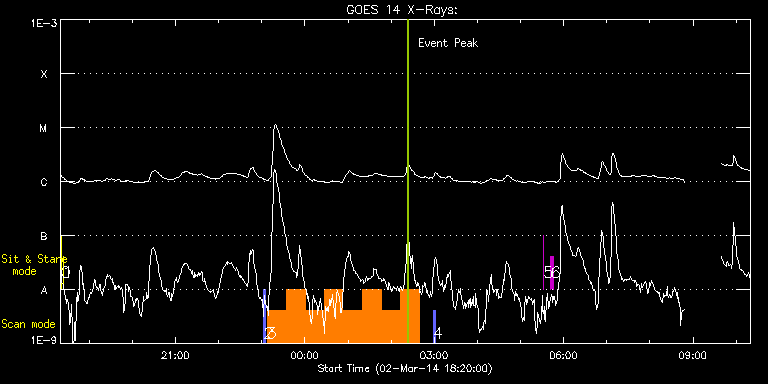 EIS Observation timeline overlay to GOES-Xray curve Code 1" 2" 40" 266" EIS Observations list for this event: STUDY ACRONYM ID DATE OBSERVED DESCRIPTION NOAA# TARGET 0 Alignment_266 | 38935 | 2014/03/02 18:20:36 | EIS pointing alignment | 1990 | Quiet Sun TIMELINE ID DATE OBSERVED FITS FILE XCEN (+W/-E) YCEN (+N/-S) DUR ----------------------------------------------------------------------------------------------------------------- 38935 | 2014/03/02 18:20:36.000 | eis_l0_20140302_182036.fits.gz | -132.57 | -0.58 | 1m22s 1 XRT_synop_AIA | 38936 | 2014/03/02 18:23:34 | EIS pointing alignment | 1990 | Quiet Sun TIMELINE ID DATE OBSERVED FITS FILE XCEN (+W/-E) YCEN (+N/-S) DUR ----------------------------------------------------------------------------------------------------------------- 38936 | 2014/03/02 18:23:34.000 | eis_l0_20140302_182334.fits.gz | -132.57 | -0.58 | 10s 2 PRY_slot_context_v3 | 38937 | 2014/03/02 23:02:56 | IHOP 246: Hot plasma in AR | 1990 | Active Region TIMELINE ID DATE OBSERVED FITS FILE XCEN (+W/-E) YCEN (+N/-S) DUR ----------------------------------------------------------------------------------------------------------------- 38937 | 2014/03/02 23:02:56.000 | eis_l0_20140302_230256.fits.gz | -13.59 | -167.65 | 2m56s 3 PRY_footpoints_lite | 38938 | 2014/03/02 23:07:33 | IHOP 246: Hot plasma in AR | | Active Region TIMELINE ID DATE OBSERVED FITS FILE XCEN (+W/-E) YCEN (+N/-S) DUR ----------------------------------------------------------------------------------------------------------------- 38938 | 2014/03/02 23:07:33.000 | eis_l0_20140302_230733.fits.gz | 23.23 | -93.42 | 26m23s 38938 | 2014/03/02 23:33:59.000 | eis_l0_20140302_233359.fits.gz | 27.17 | -93.50 | 26m22s 38938 | 2014/03/03 00:00:24.000 | eis_l0_20140303_000024.fits.gz | 31.19 | -93.42 | 26m23s 38938 | 2014/03/03 00:26:50.000 | eis_l0_20140303_002650.fits.gz | 35.05 | -93.42 | 25m51s 38938 | 2014/03/03 00:53:15.000 | eis_l0_20140303_005315.fits.gz | 39.07 | -93.42 | 26m23s 38938 | 2014/03/03 01:19:41.000 | eis_l0_20140303_011941.fits.gz | 43.01 | -93.57 | 26m22s 38938 | 2014/03/03 01:46:06.000 | eis_l0_20140303_014606.fits.gz | 47.02 | -93.57 | 25m51s 38938 | 2014/03/03 02:12:32.000 | eis_l0_20140303_021232.fits.gz | 50.96 | -93.50 | 26m22s 4 PRY_slot_context_v3 | 38939 | 2014/03/03 02:58:20 | IHOP 246: Hot plasma in AR | 1990 | Active Region TIMELINE ID DATE OBSERVED FITS FILE XCEN (+W/-E) YCEN (+N/-S) DUR ----------------------------------------------------------------------------------------------------------------- 38939 | 2014/03/03 02:58:20.000 | eis_l0_20140303_025820.fits.gz | 21.63 | -167.49 | 2m57s 5 regcal070 | 38940 | 2014/03/03 05:32:27 | Flat field with overscan pixels (50*8) | | Engineering TIMELINE ID DATE OBSERVED FITS FILE XCEN (+W/-E) YCEN (+N/-S) DUR ----------------------------------------------------------------------------------------------------------------- 38940 | 2014/03/03 05:32:27.000 | eis_l0_20140303_053227.fits.gz | -177.84 | -98.16 | 3s 6 regcal074 | 38941 | 2014/03/03 05:42:24 | Dark exposures including overscan pixe | | Engineering TIMELINE ID DATE OBSERVED FITS FILE XCEN (+W/-E) YCEN (+N/-S) DUR ----------------------------------------------------------------------------------------------------------------- 38941 | 2014/03/03 05:42:24.000 | eis_l0_20140303_054224.fits.gz | -176.52 | -98.01 | 3m22s : Check study information : Download file : View thumbnails For this event, also check for: